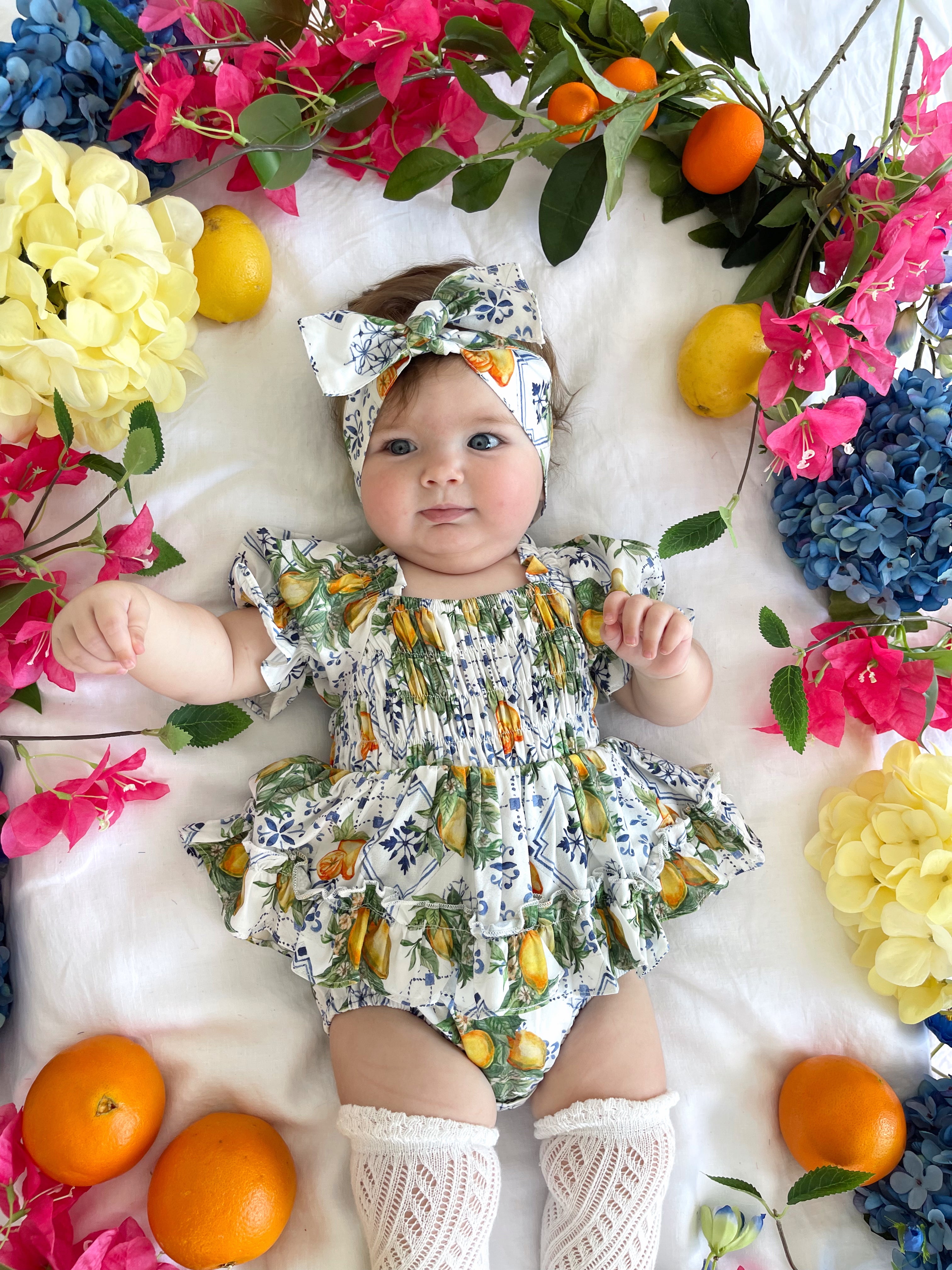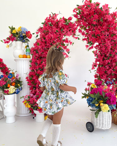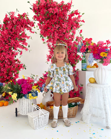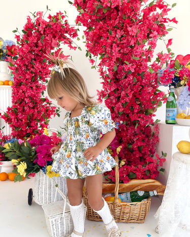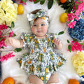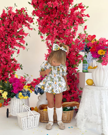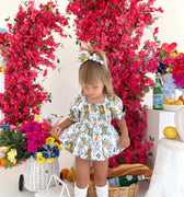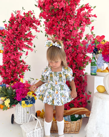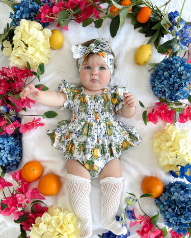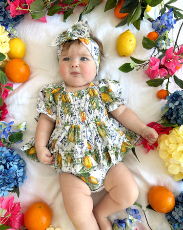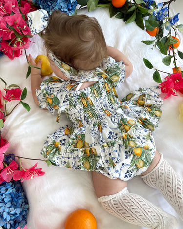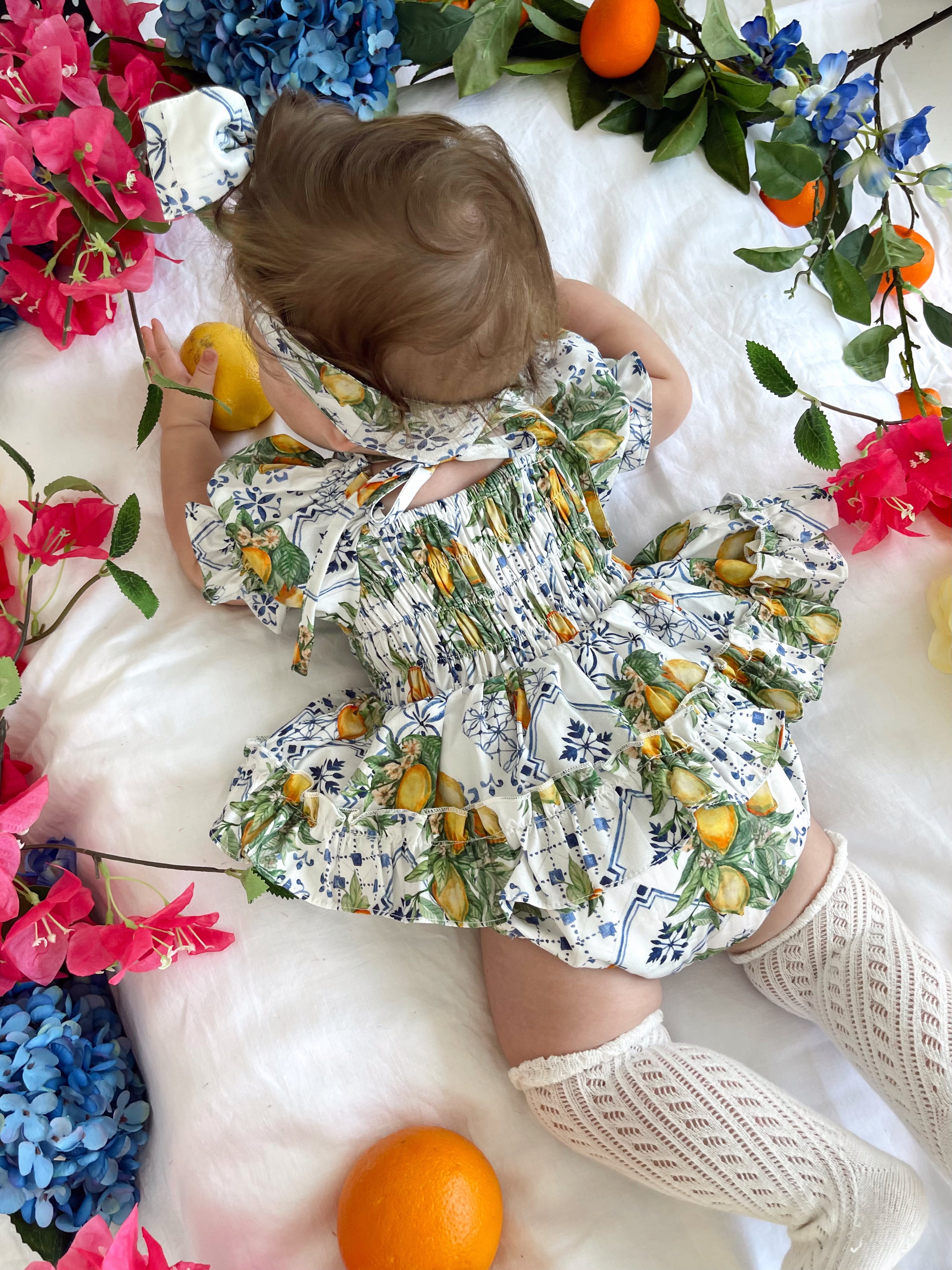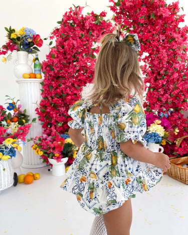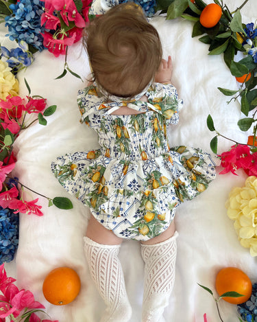 Made from 100% cotton, this romper is beautifully designed in our adorable Italian-inspired print with yellow lemons and blue details on a white base.