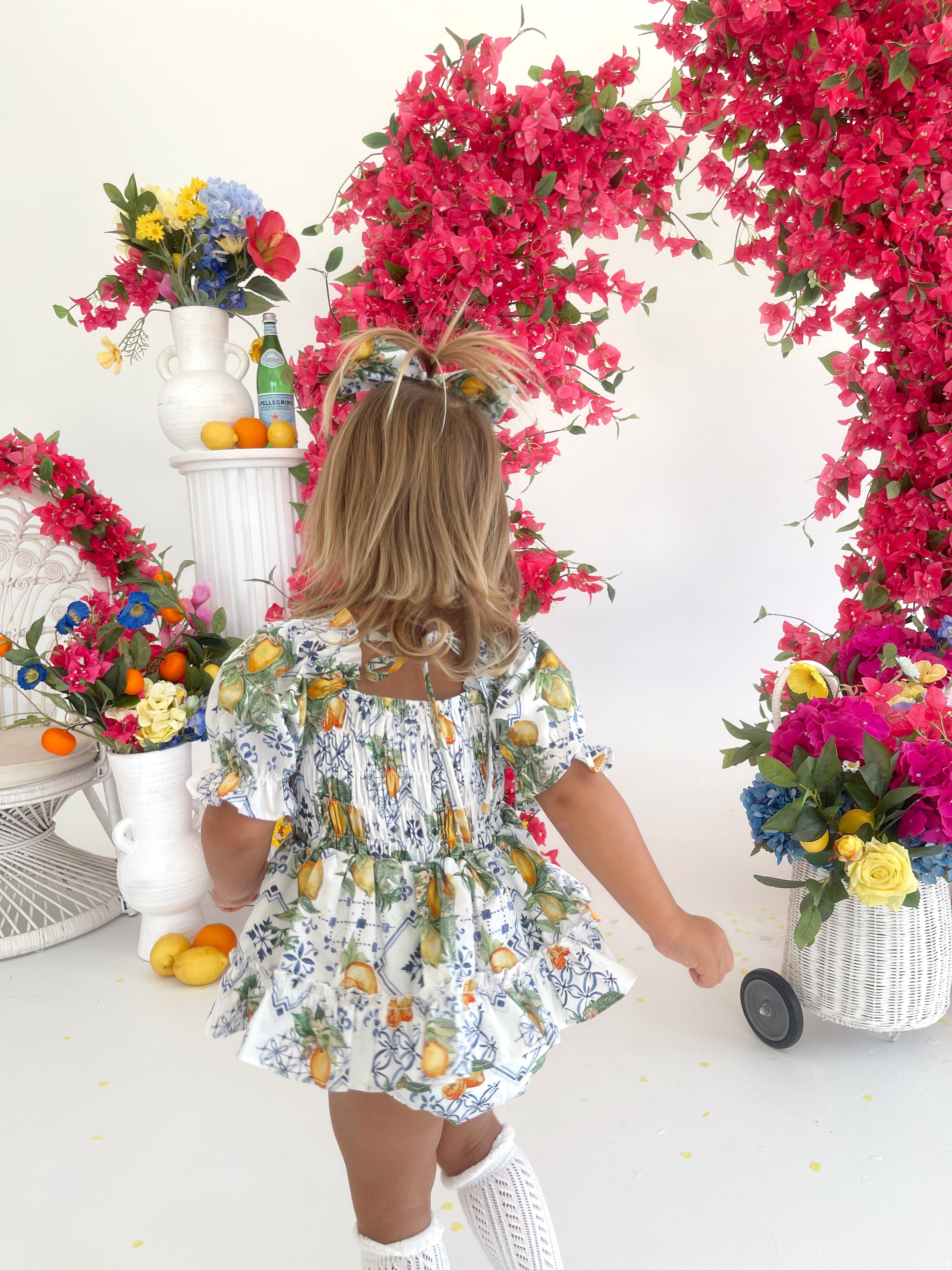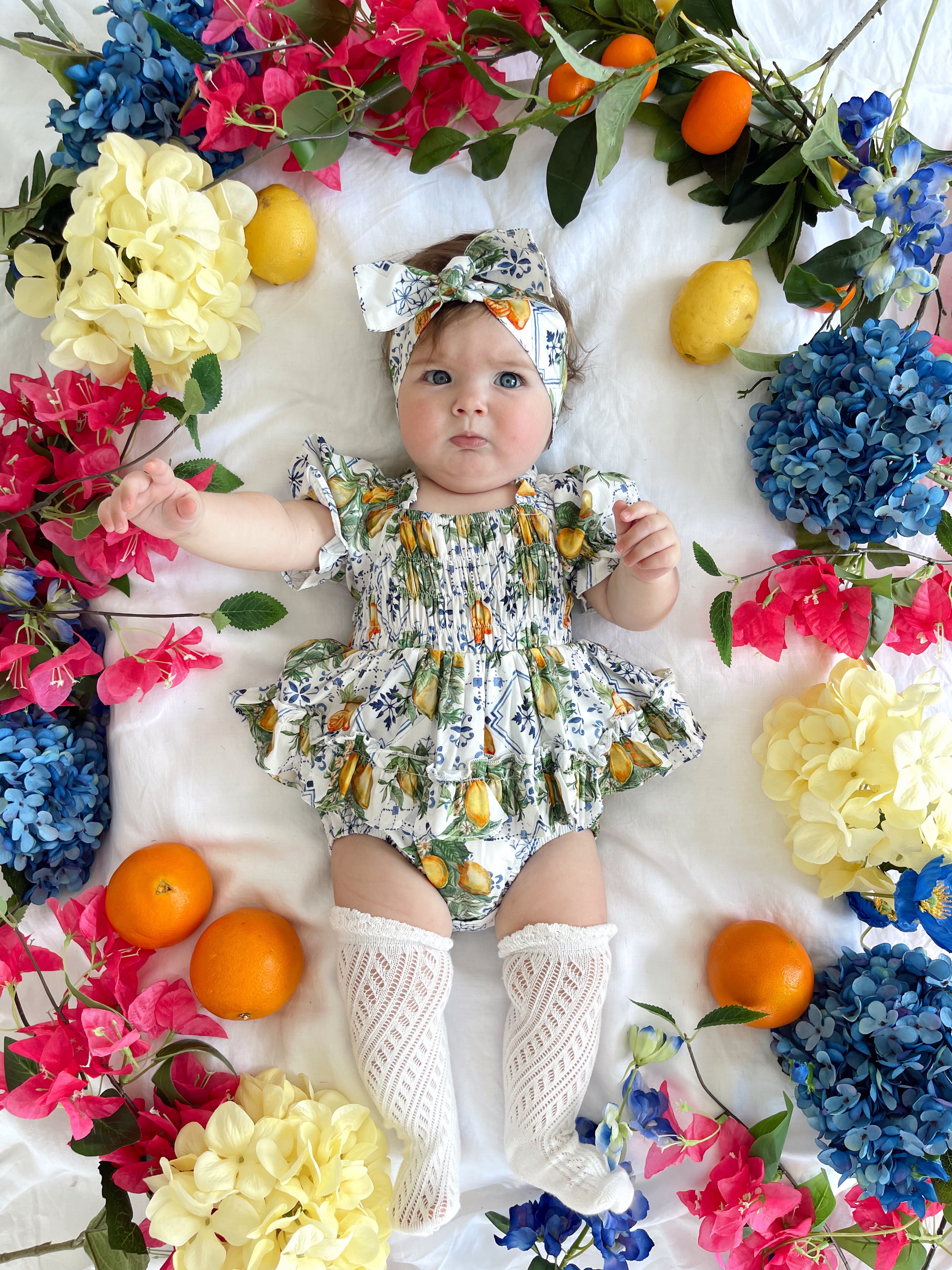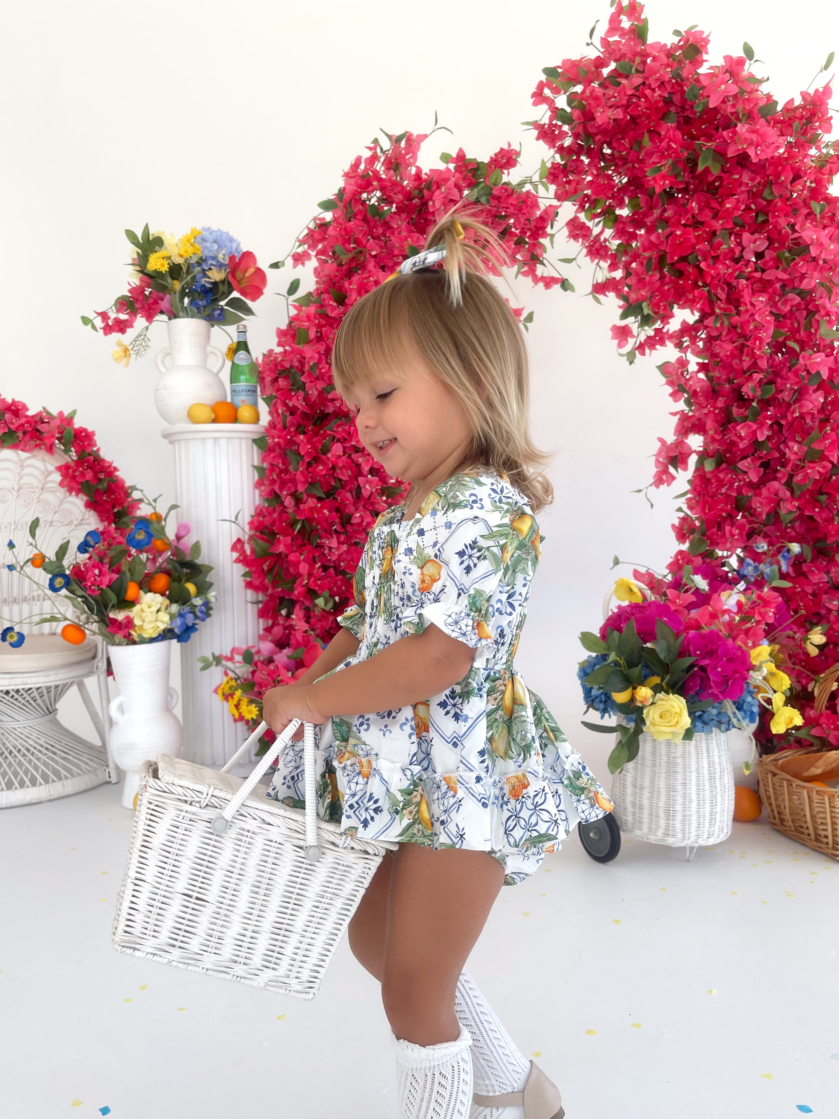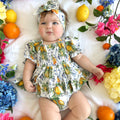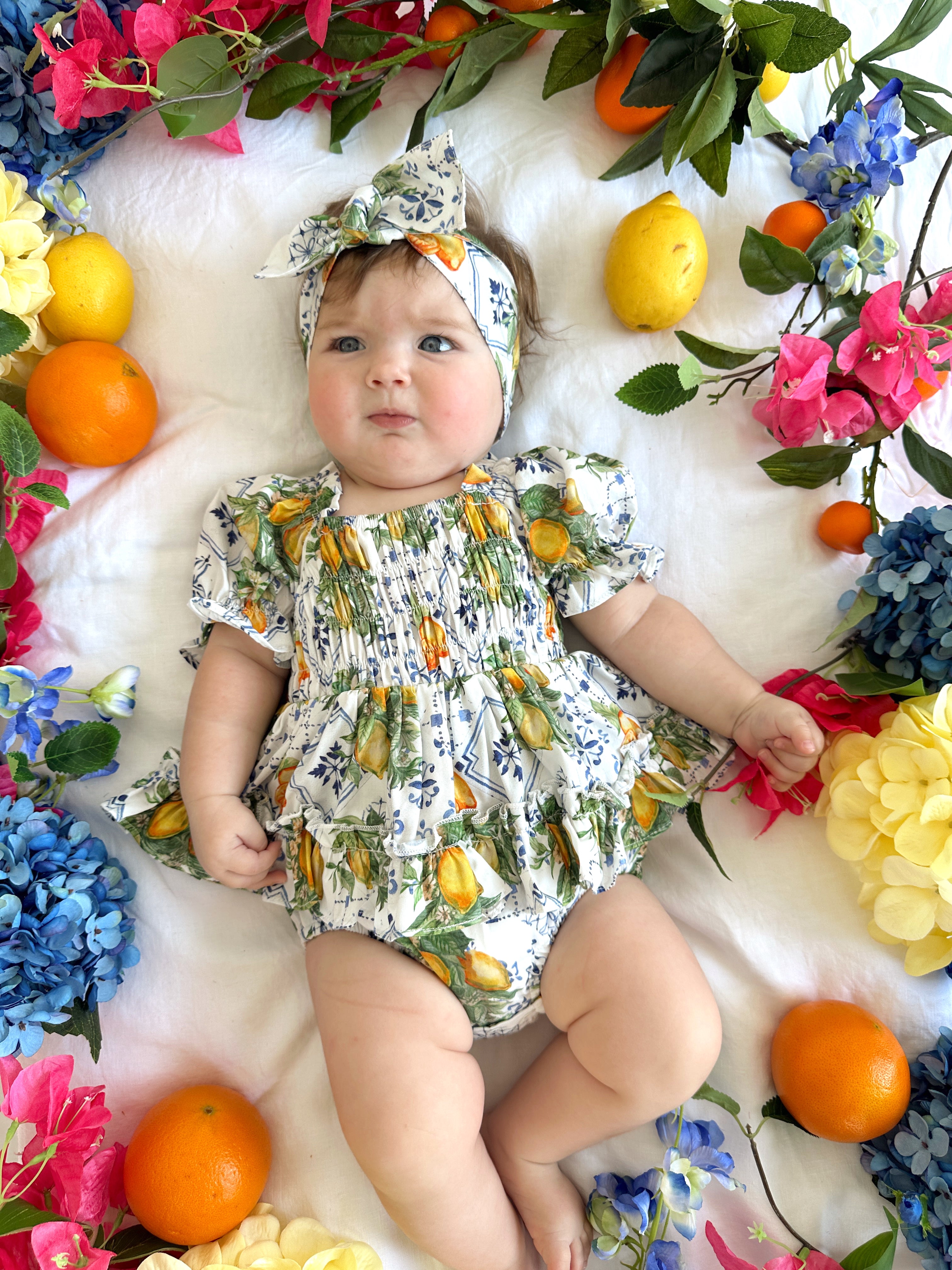Made from 100% cotton, this romper is beautifully designed in our adorable Italian-inspired print with yellow lemons and blue details on a white base.