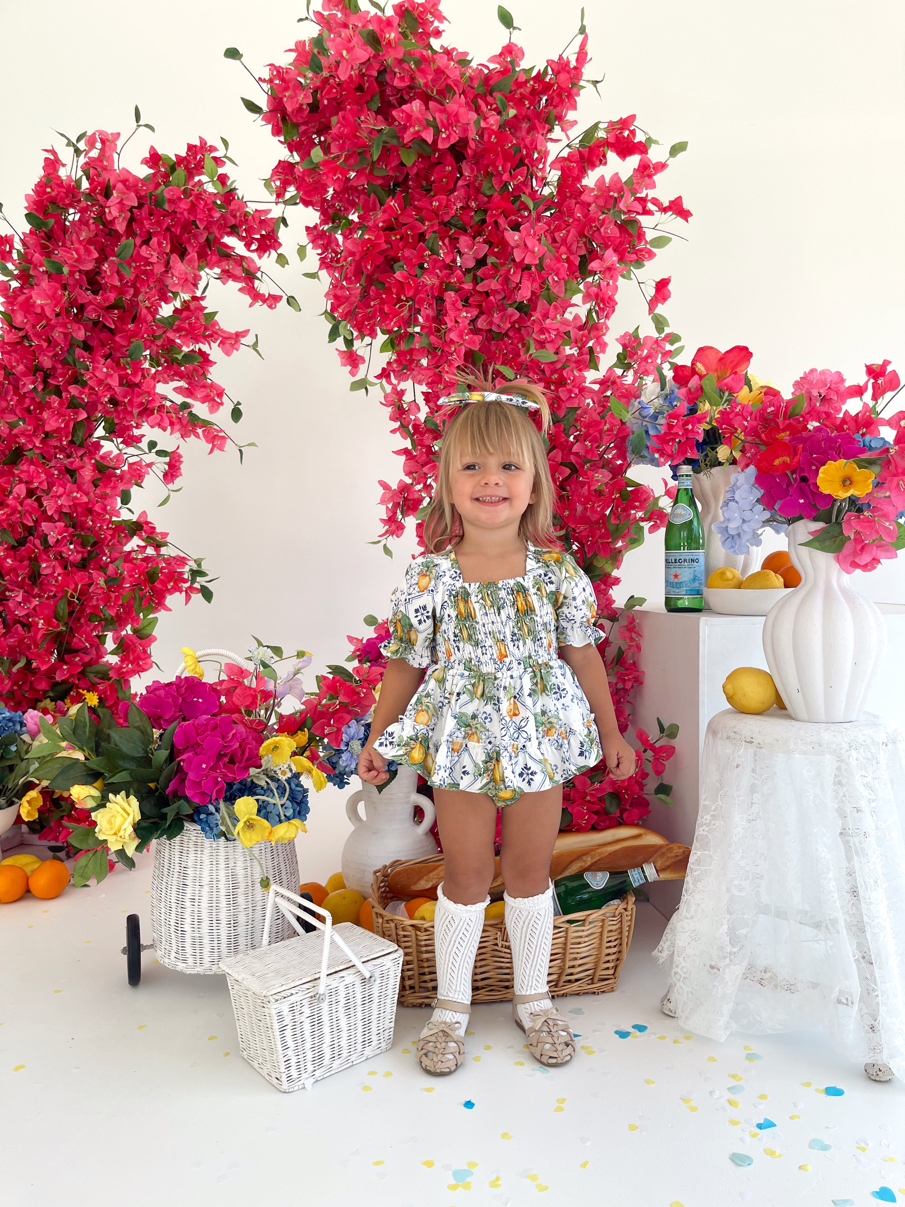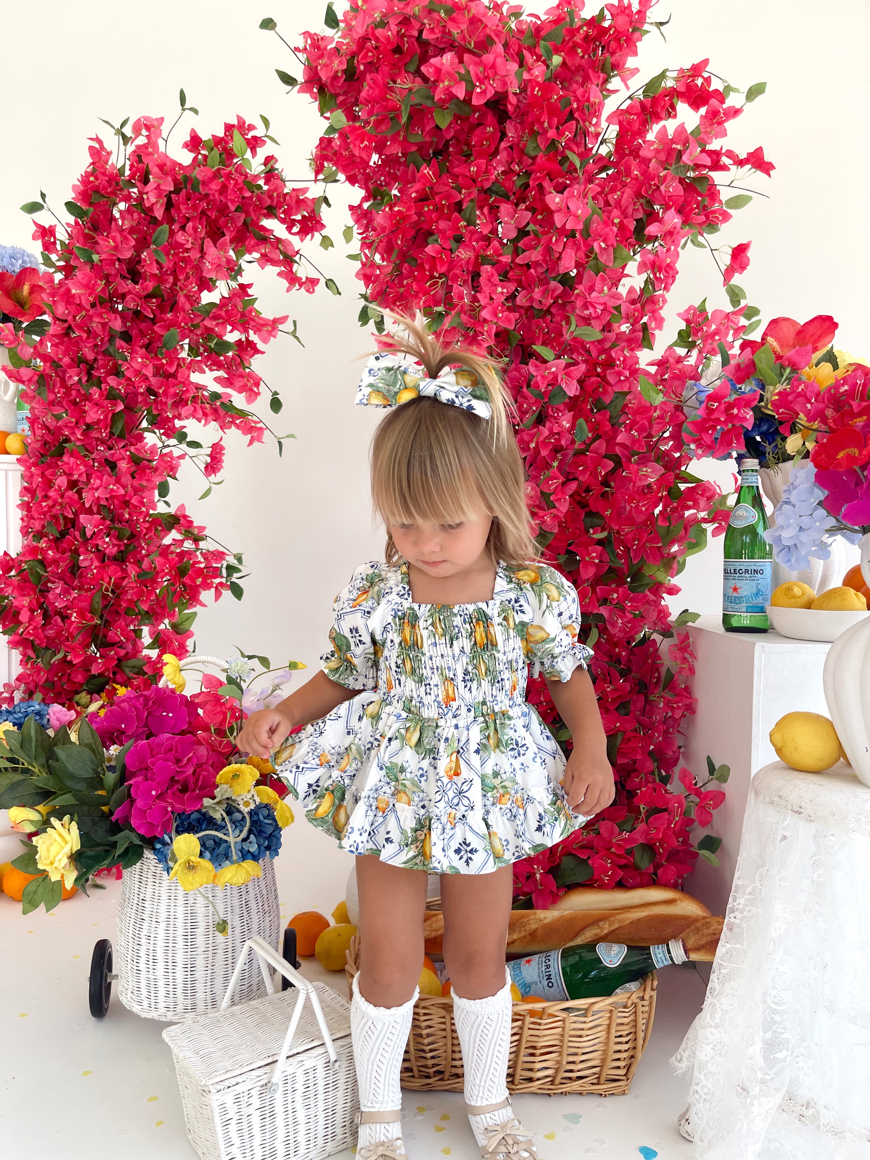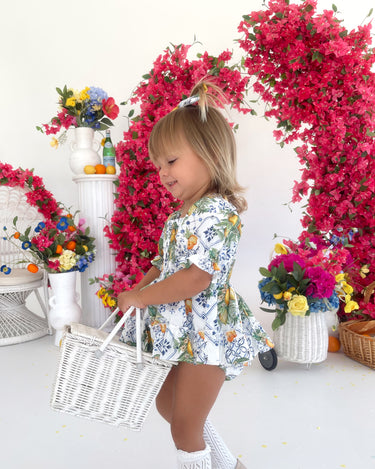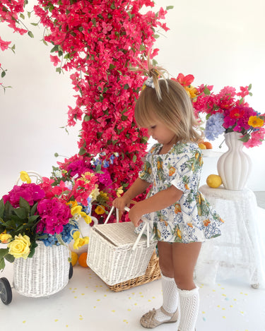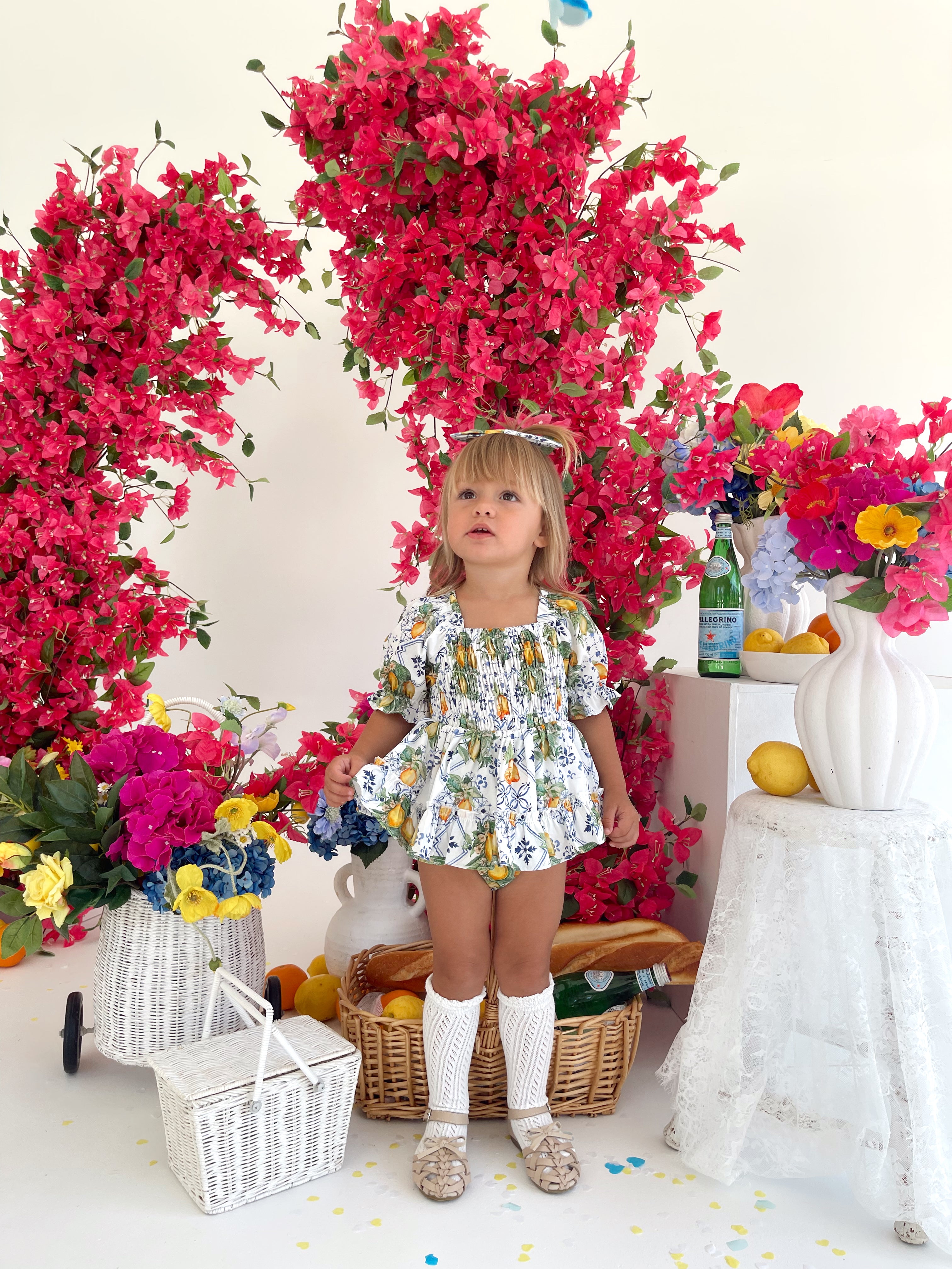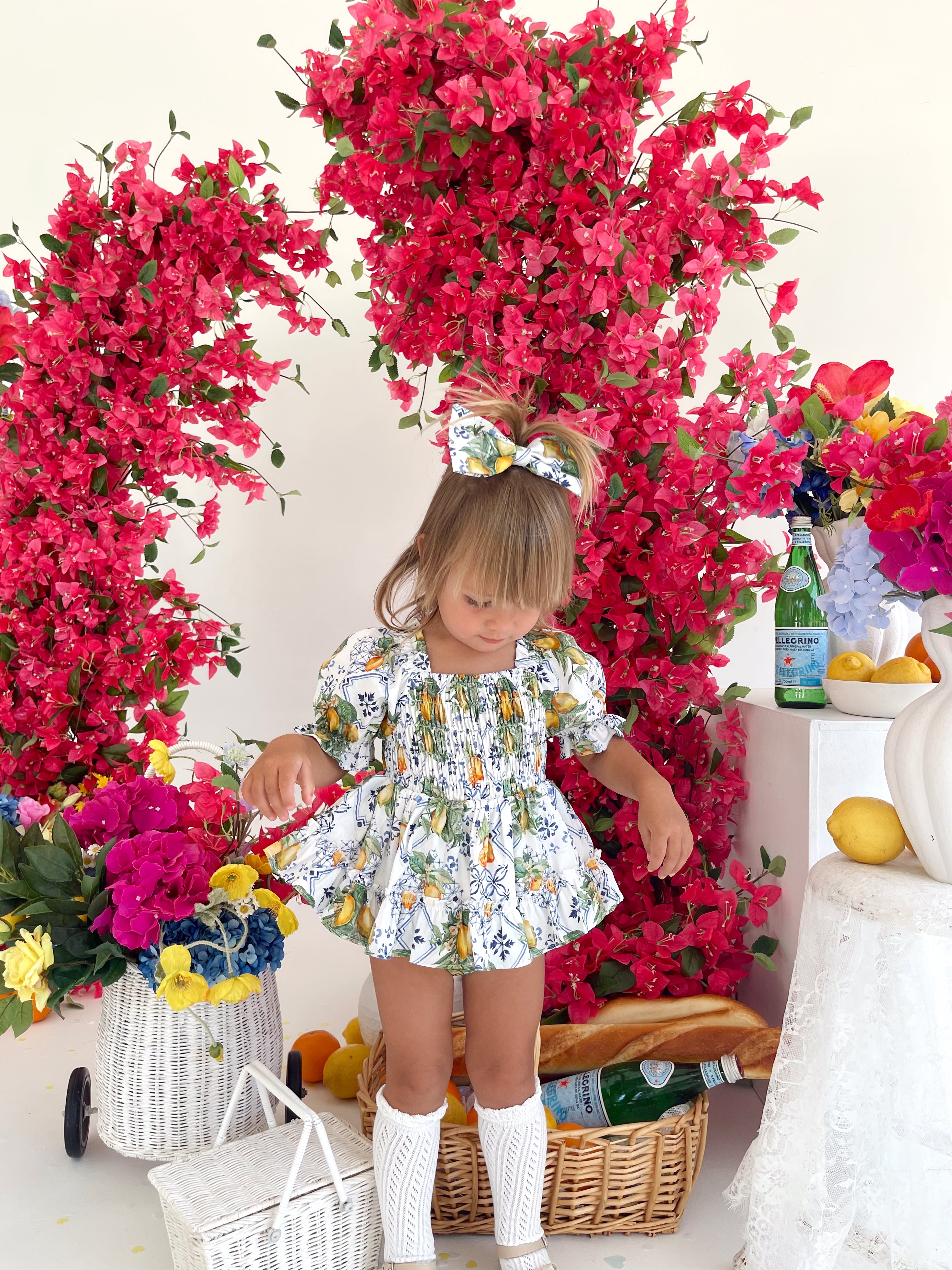 Made from 100% cotton, this romper is beautifully designed in our adorable Italian-inspired print with yellow lemons and blue details on a white base.