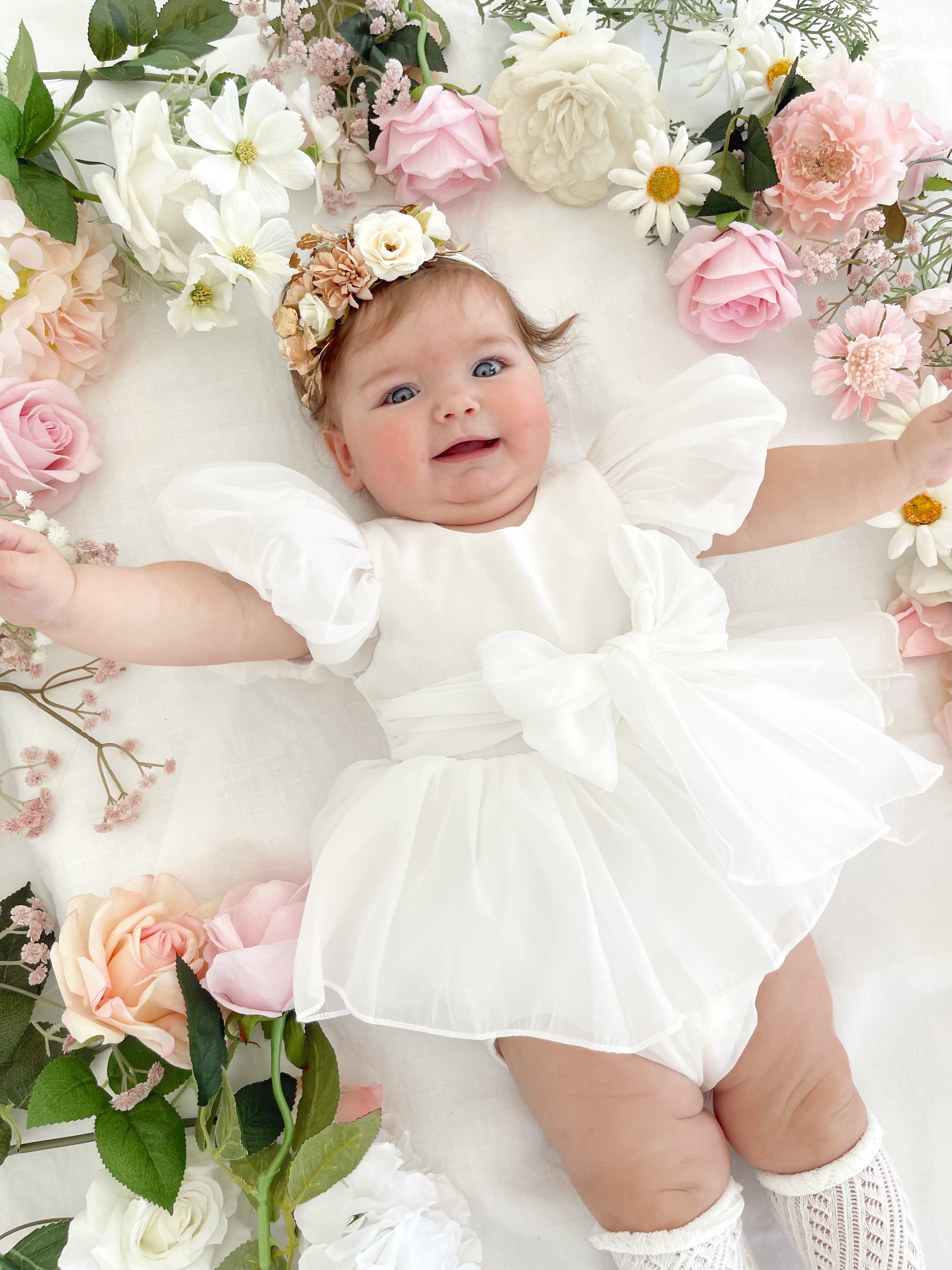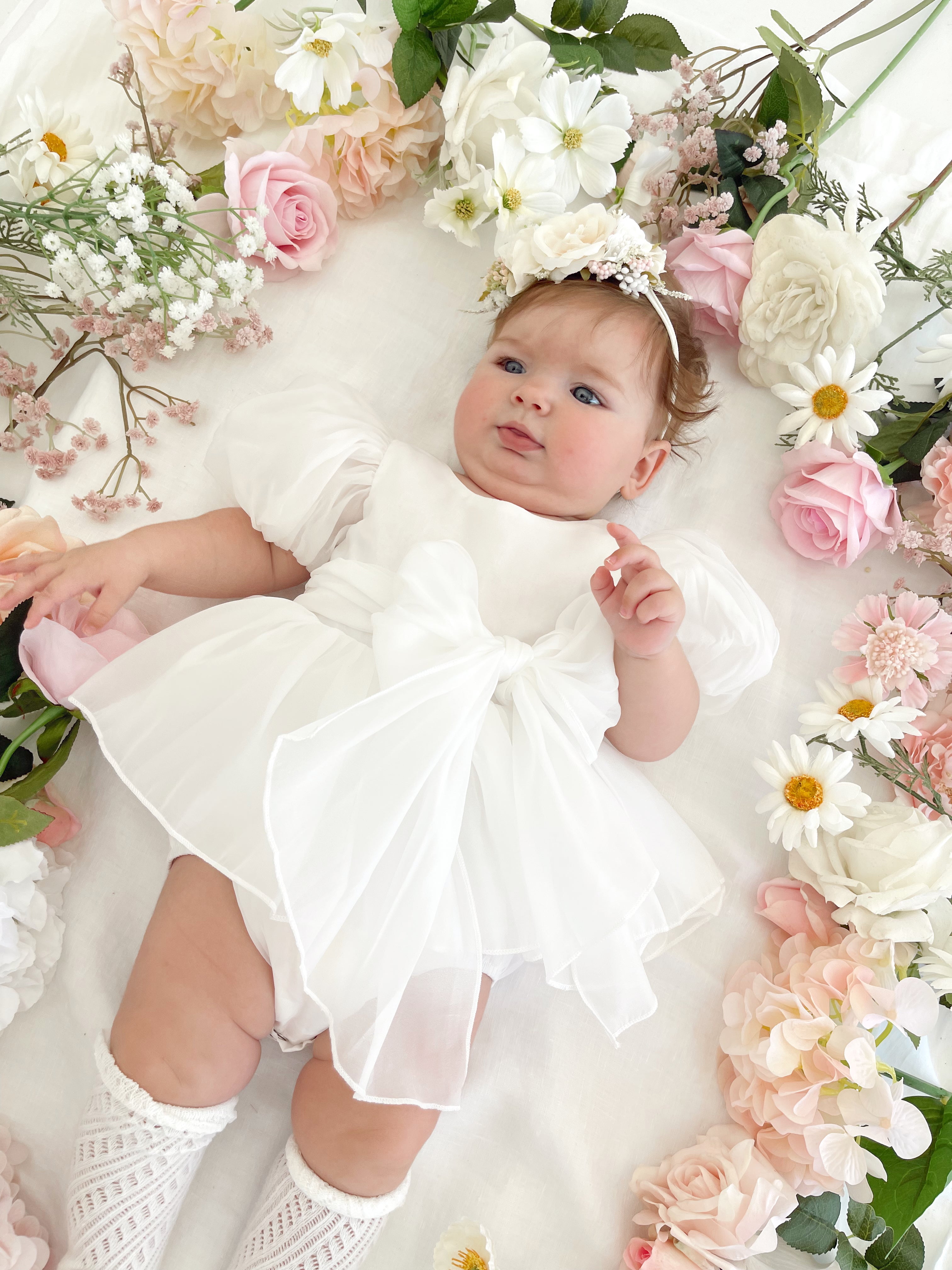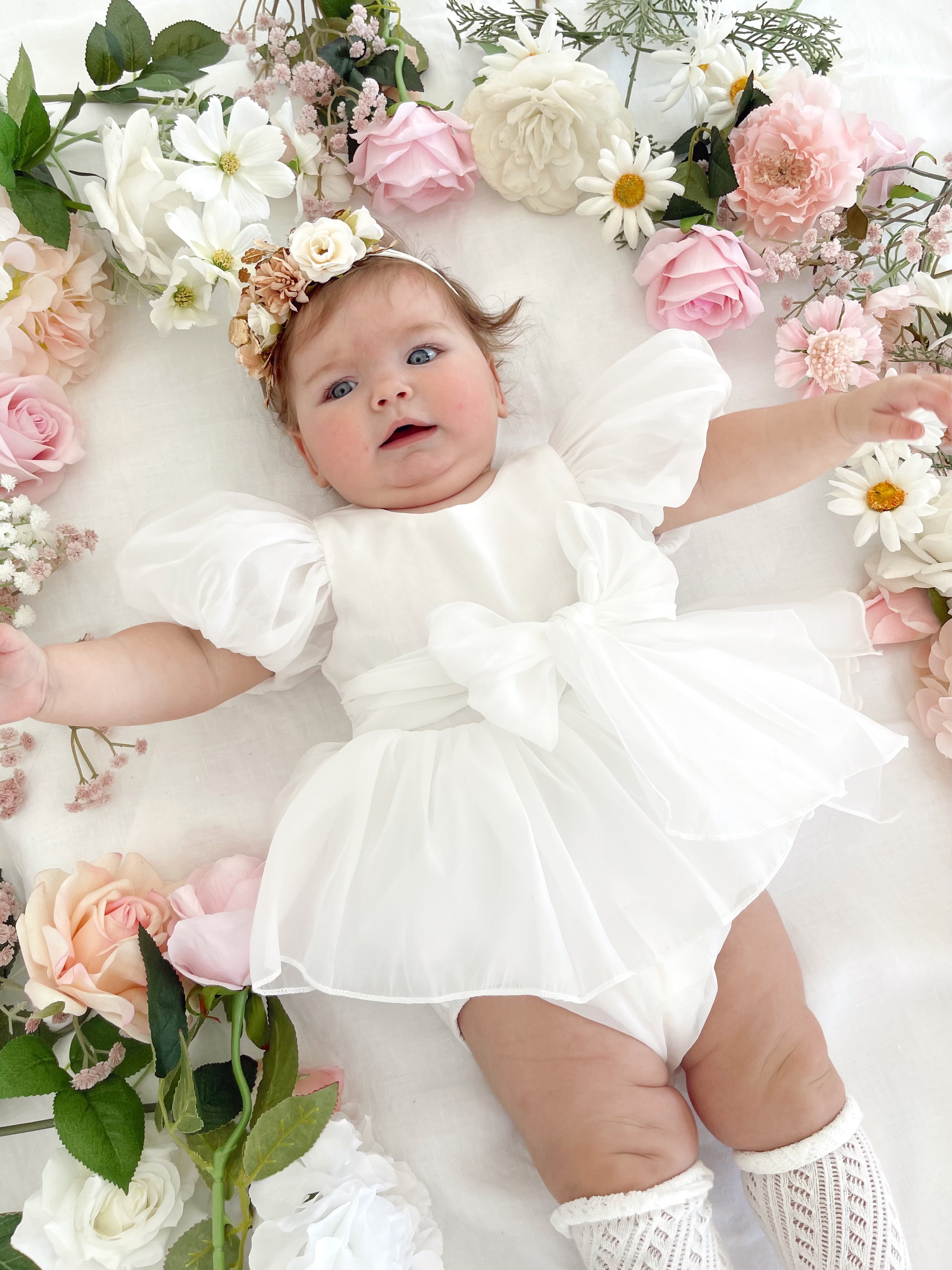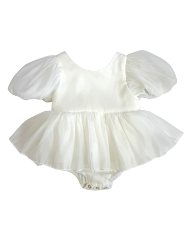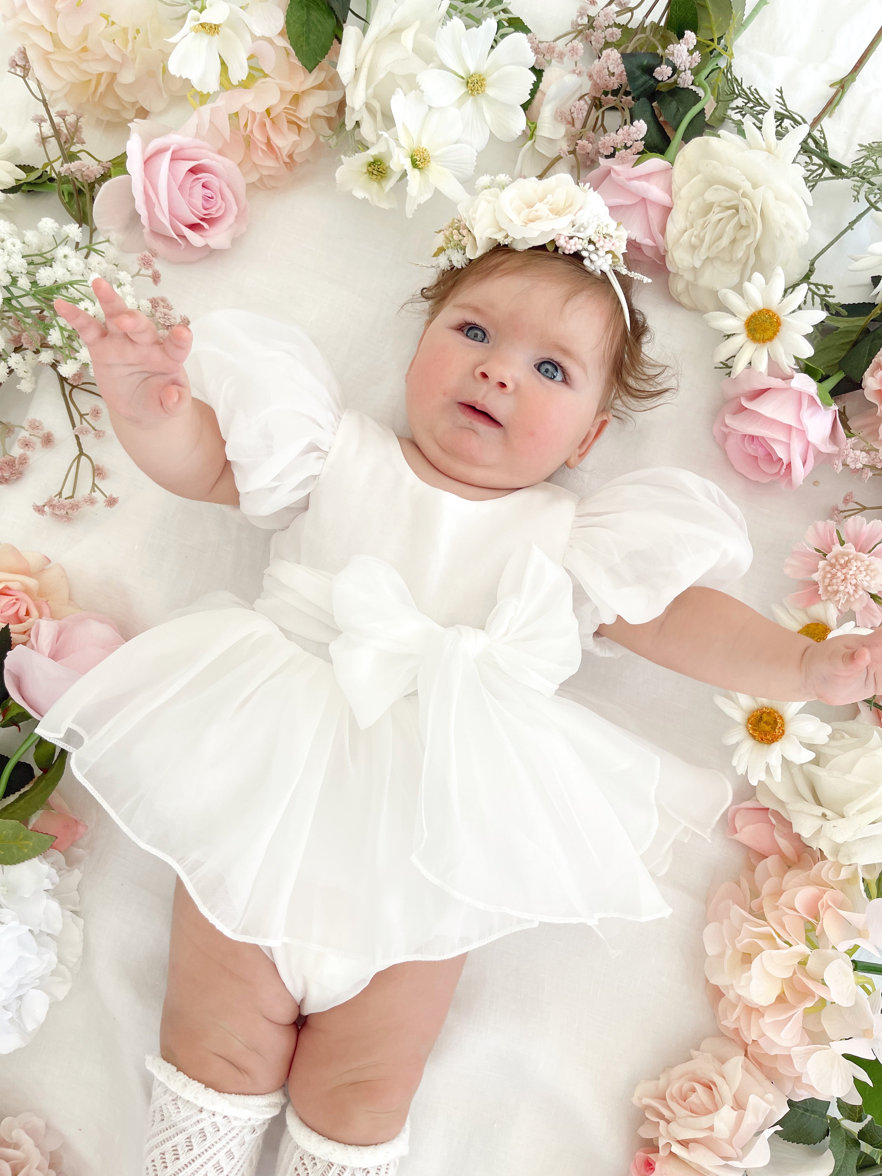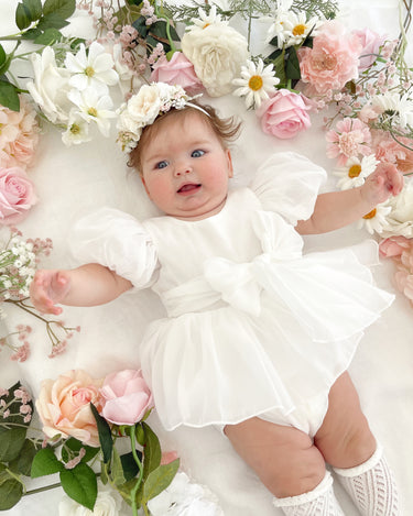 Prepare to be obsessed with the gorgeous Clementine Matte White Organza Baby Girl Romper!