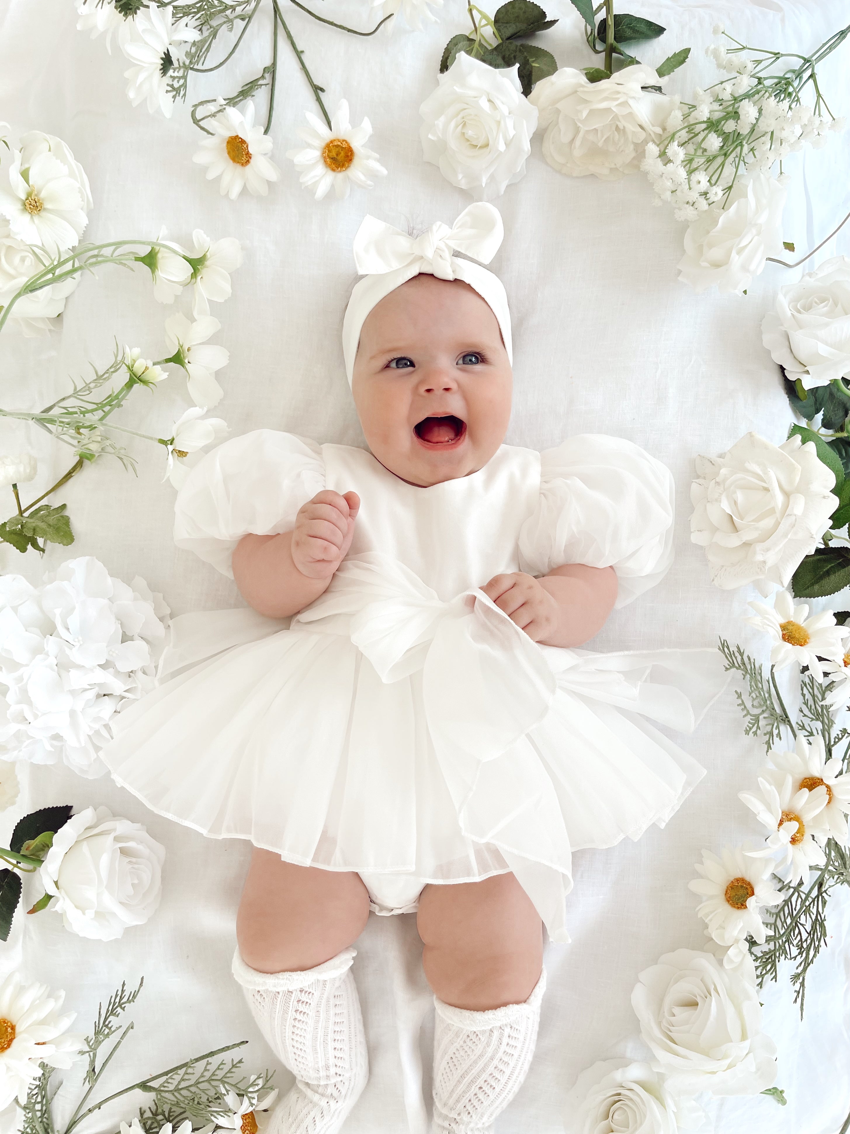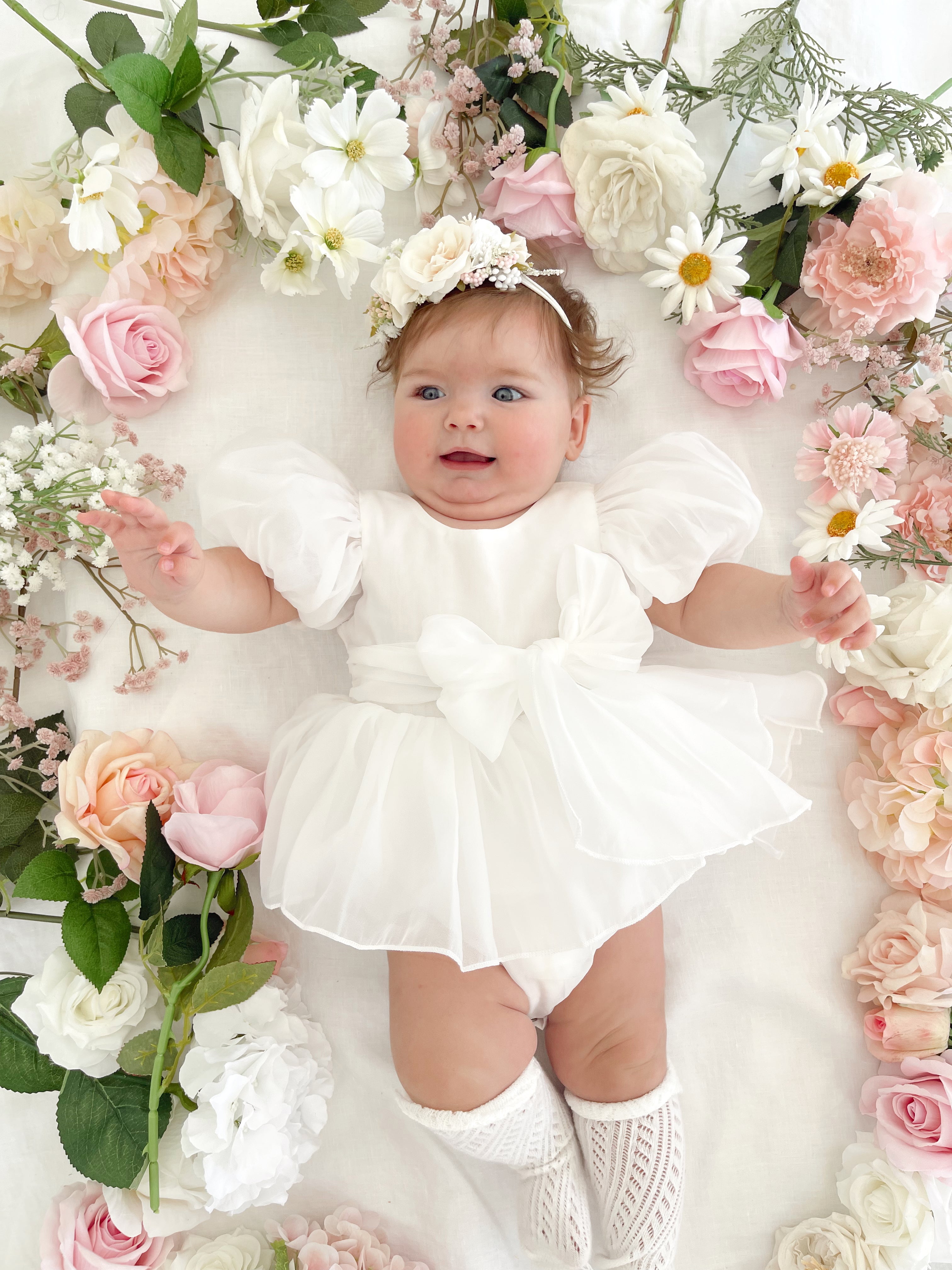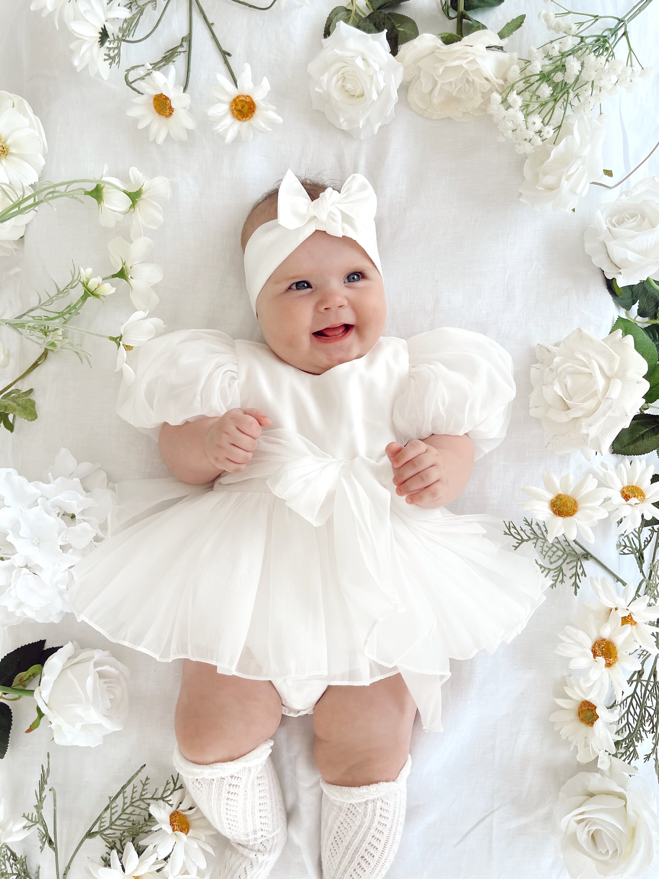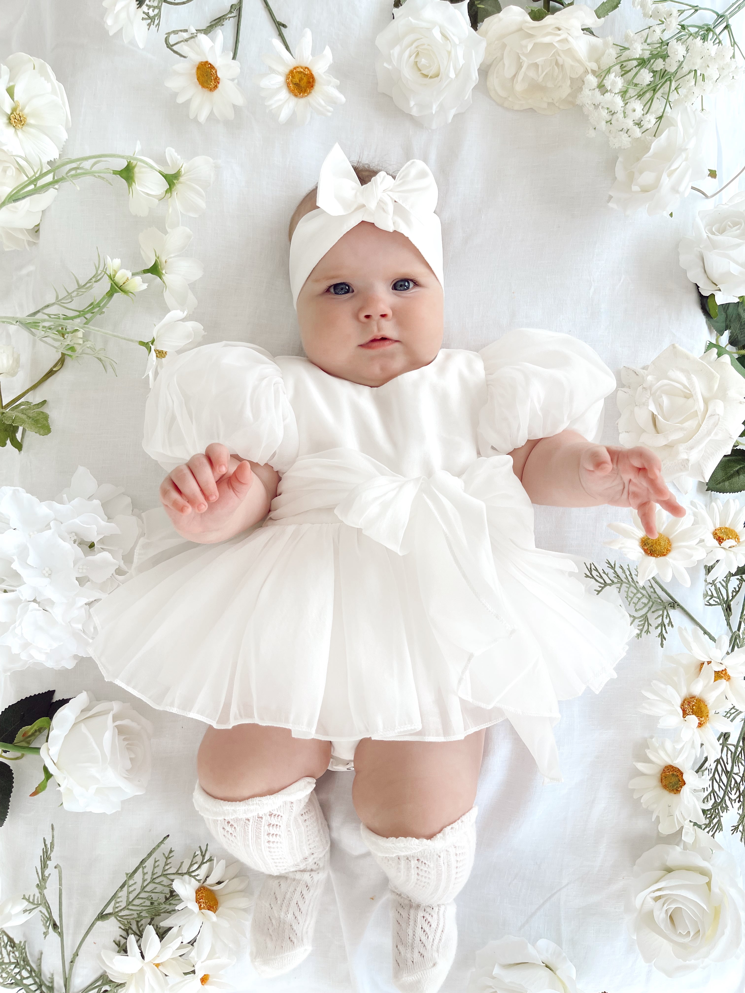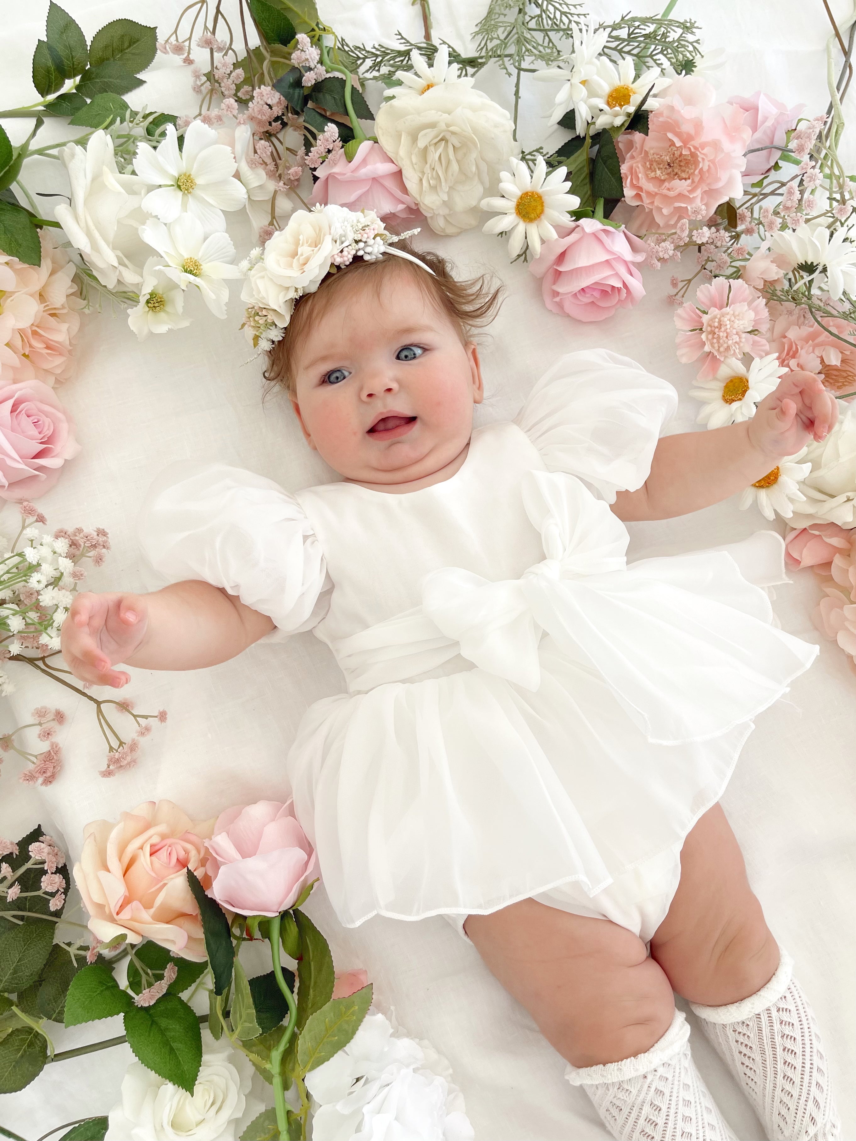 Prepare to be obsessed with the gorgeous Clementine Matte White Organza Baby Girl Romper!