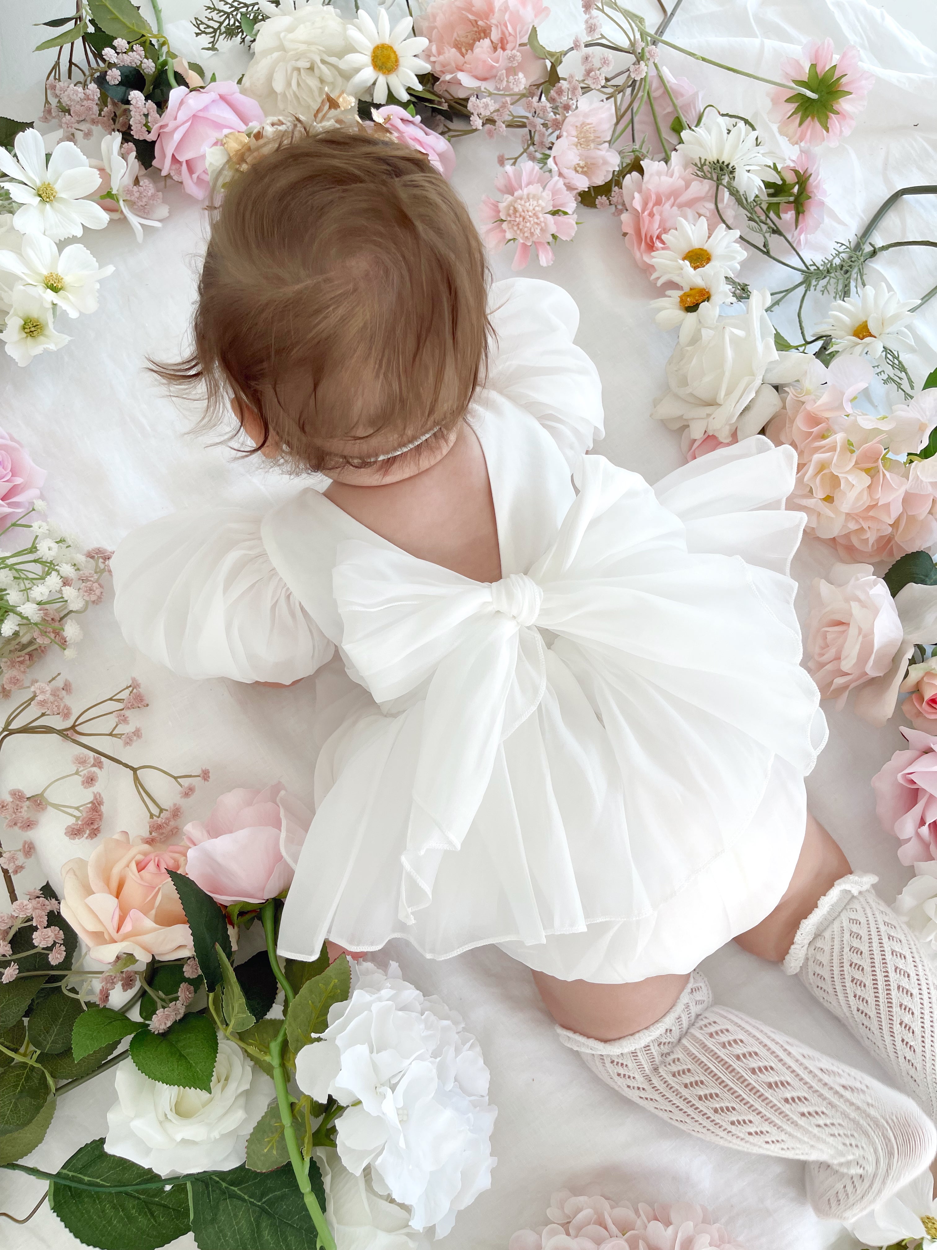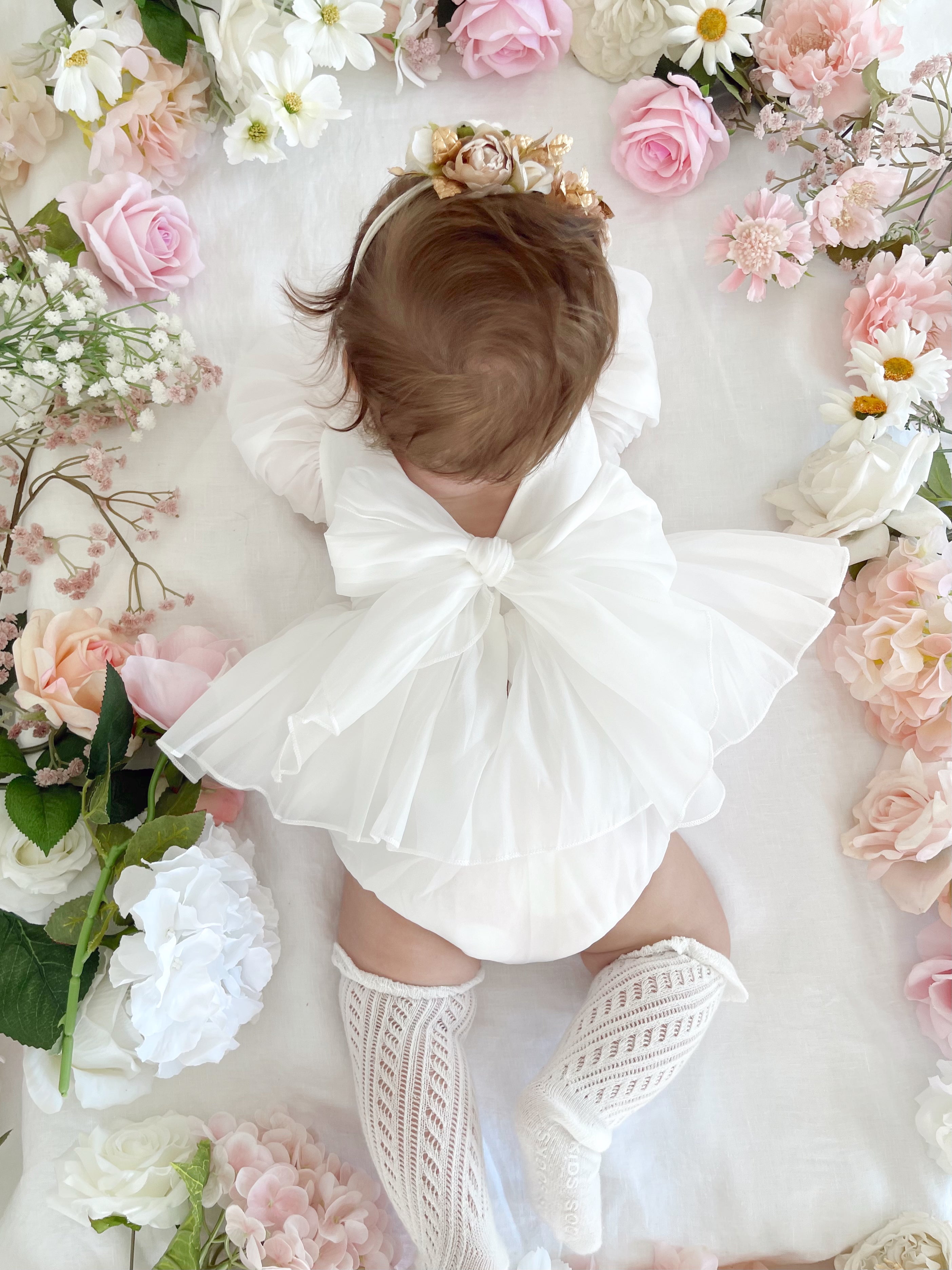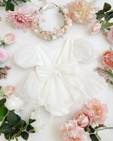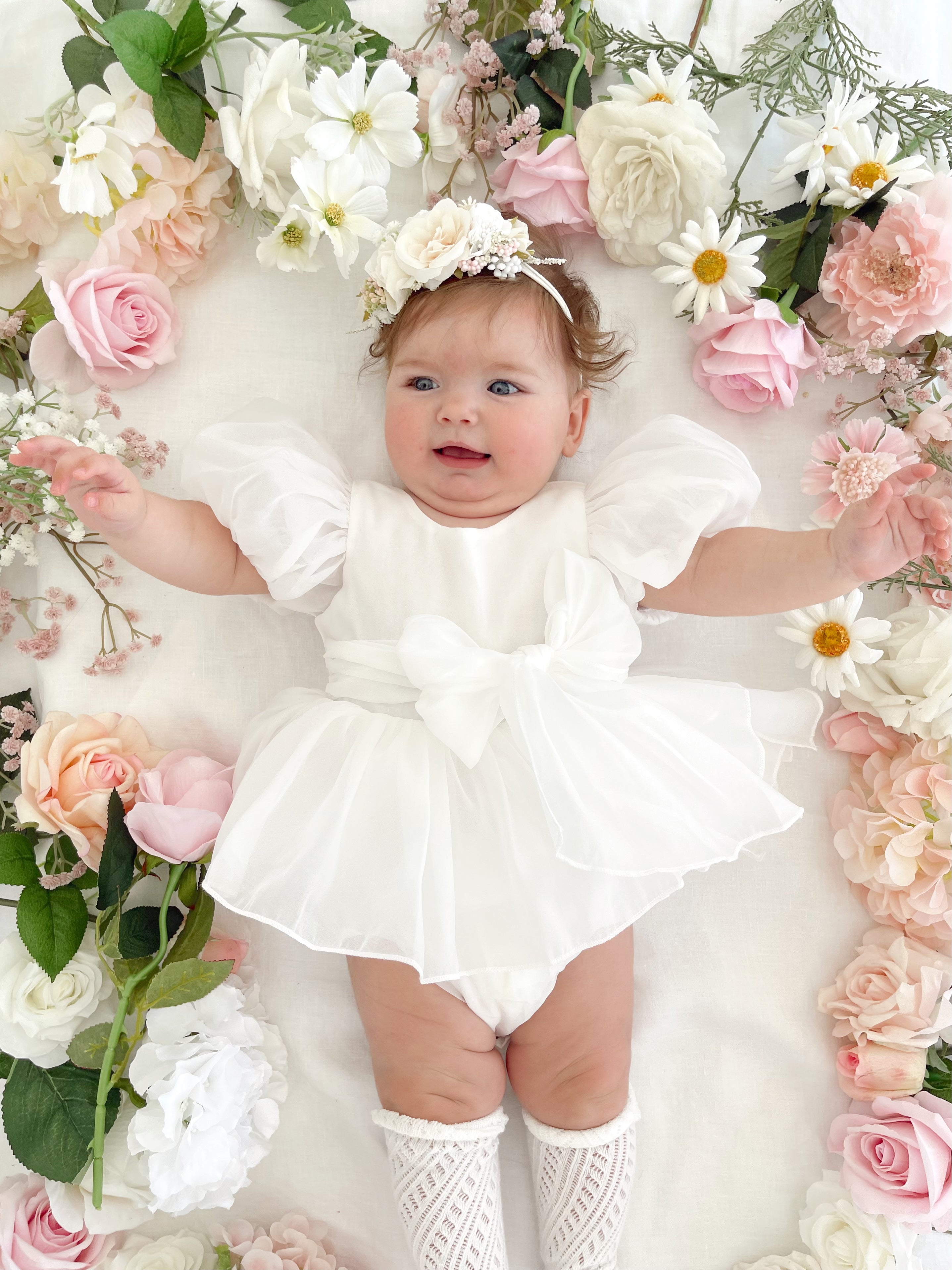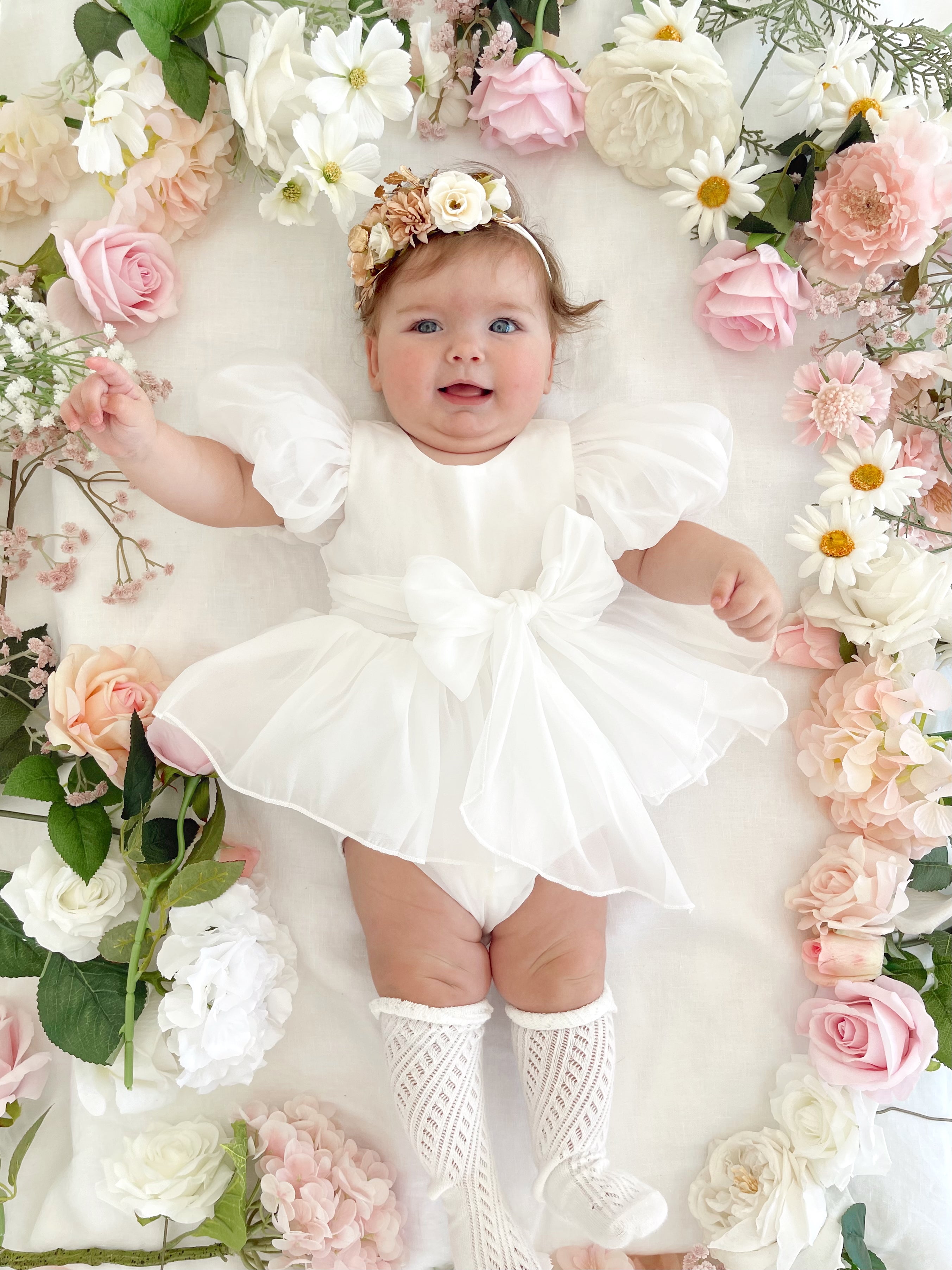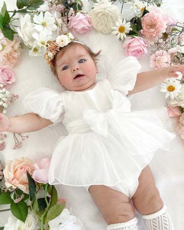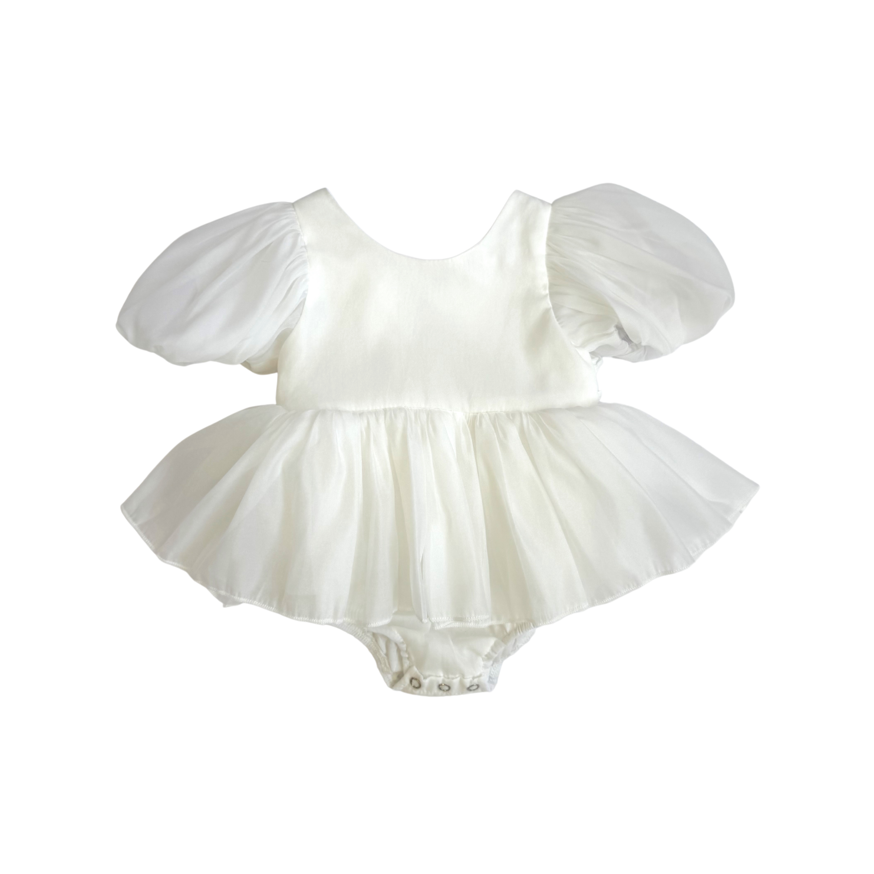 Prepare to be obsessed with the gorgeous Clementine Matte White Organza Baby Girl Romper!