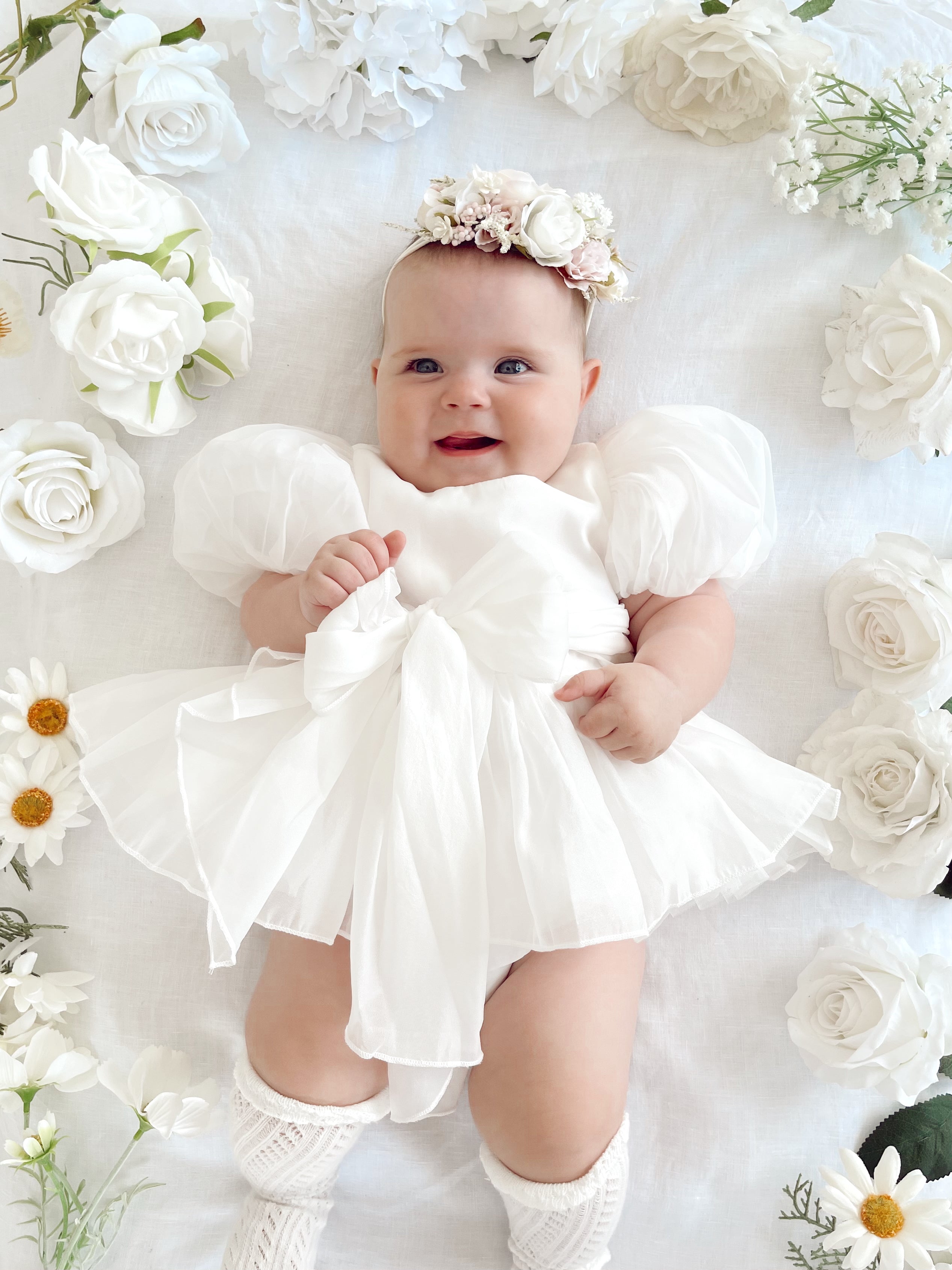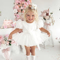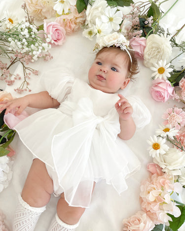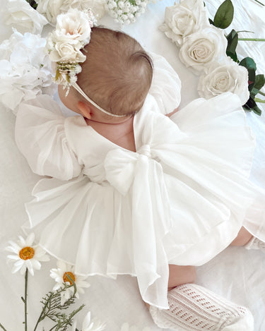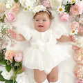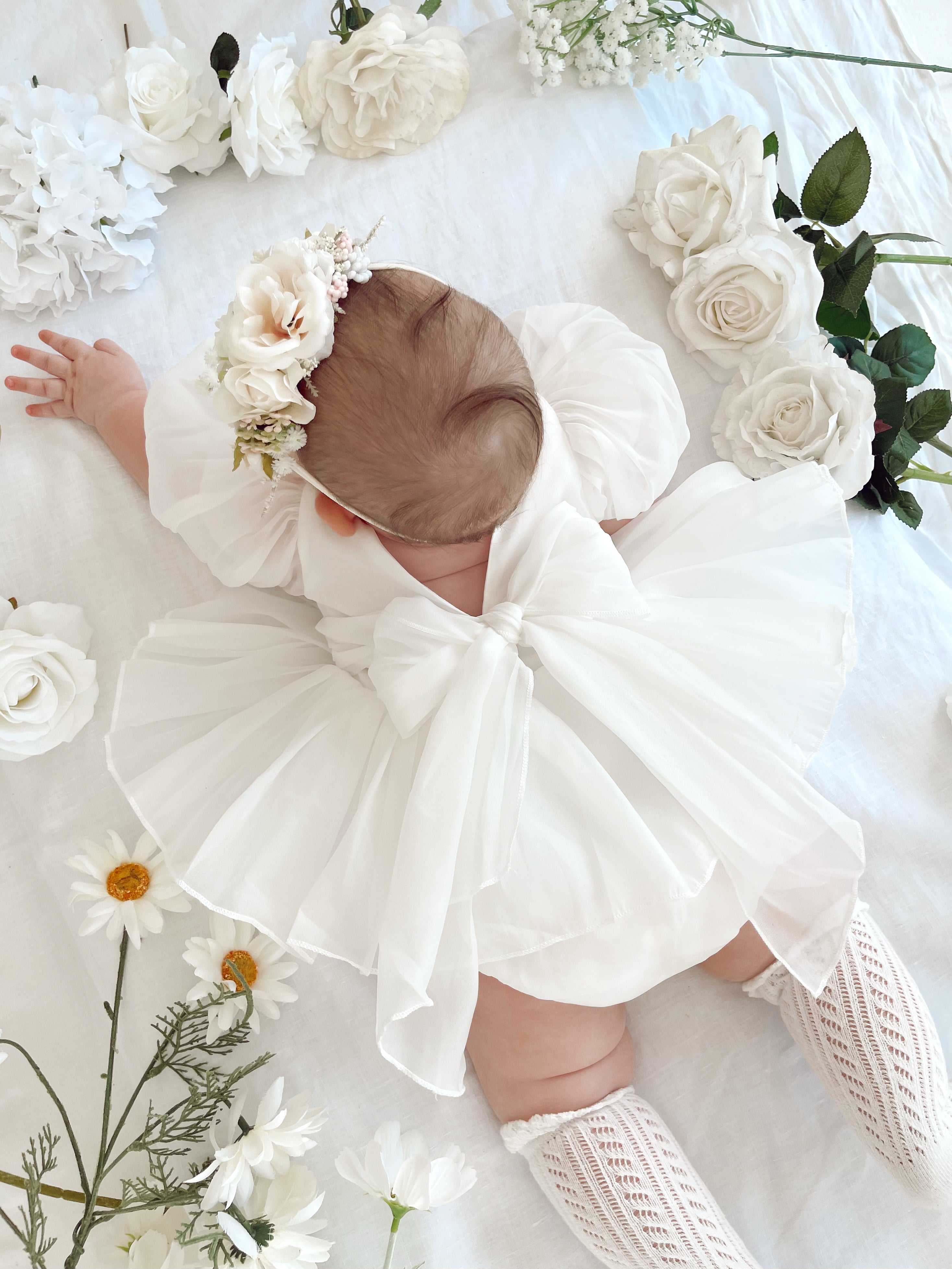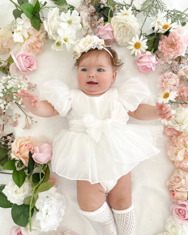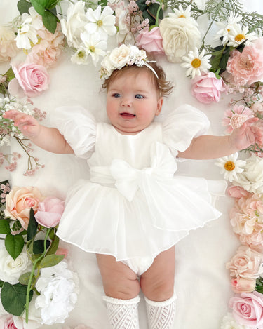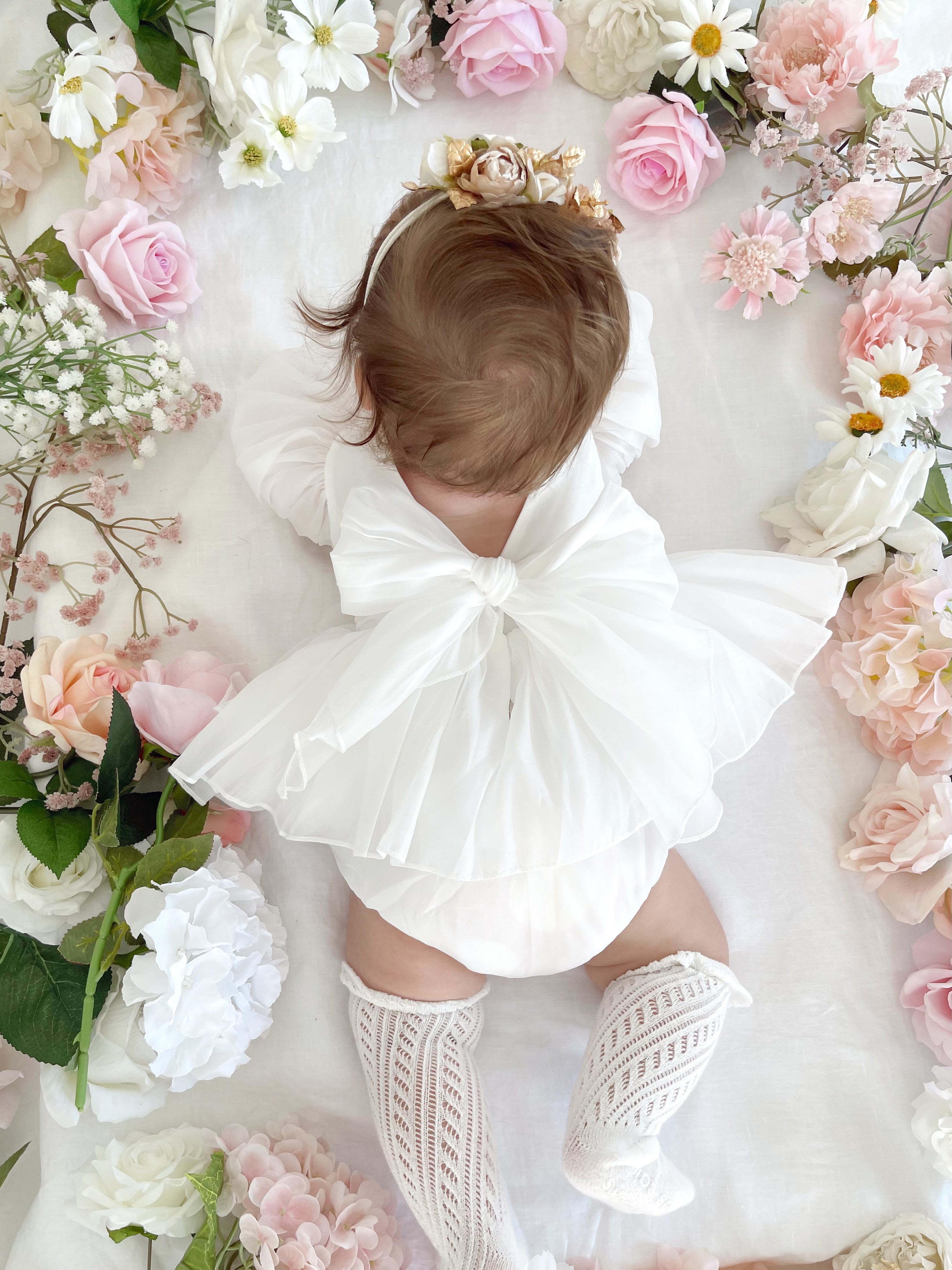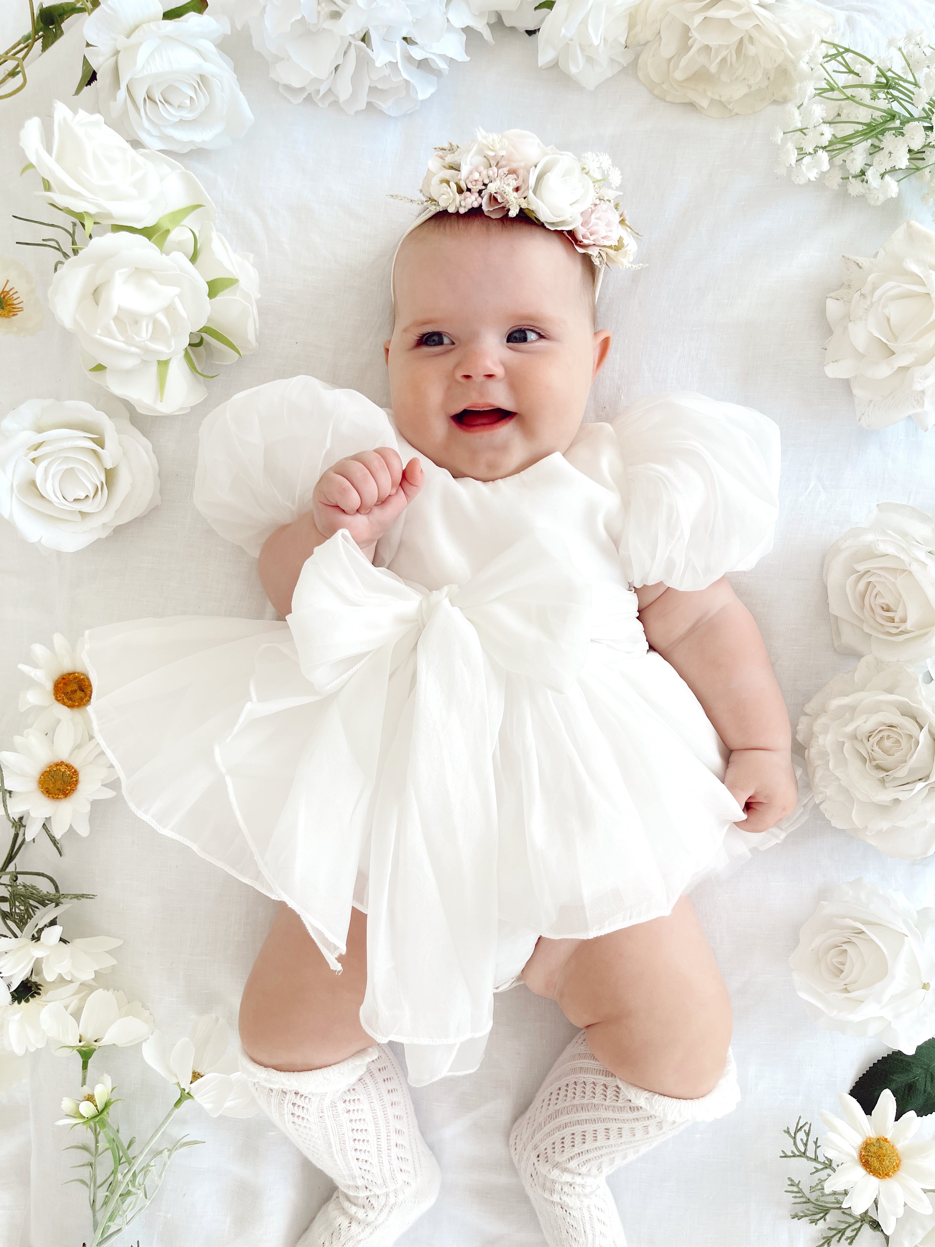 Prepare to be obsessed with the gorgeous Clementine Matte White Organza Baby Girl Romper!