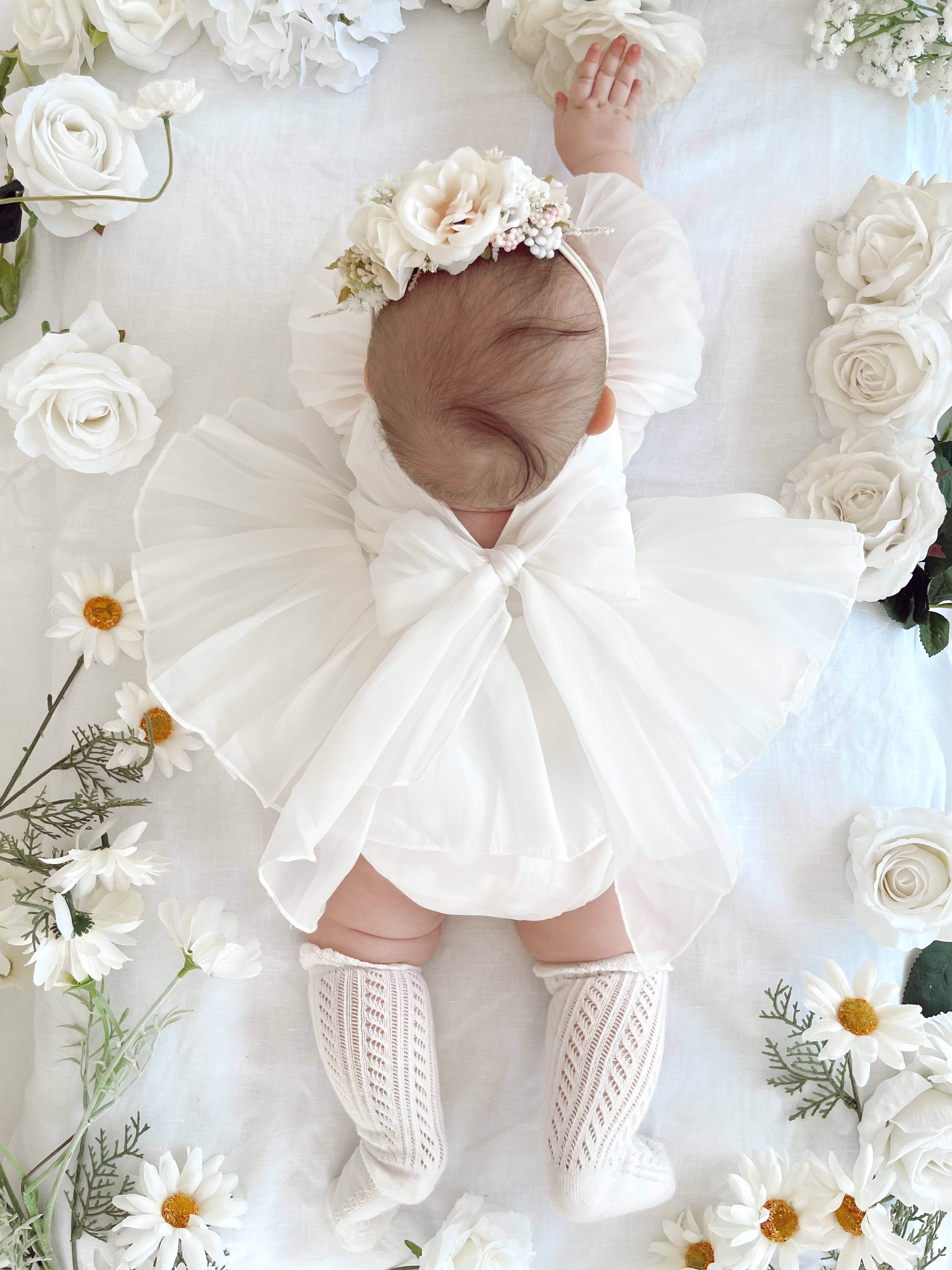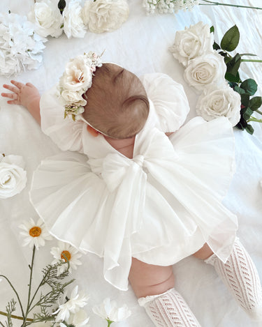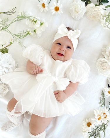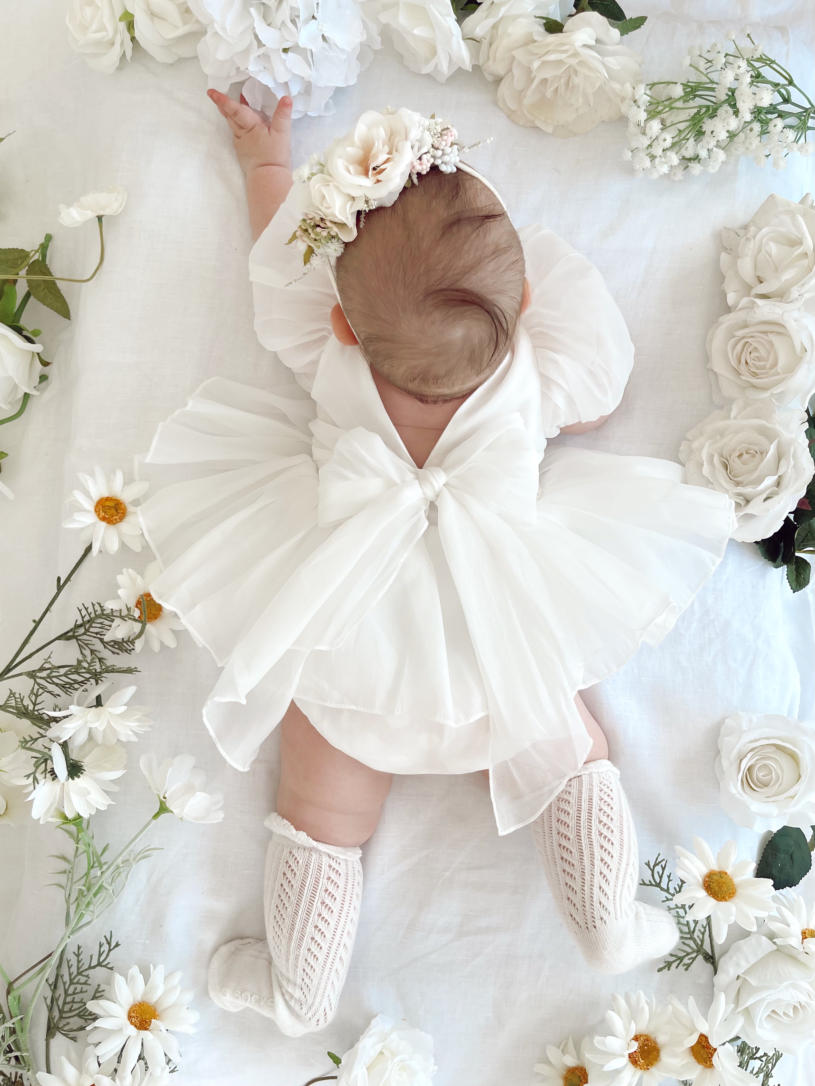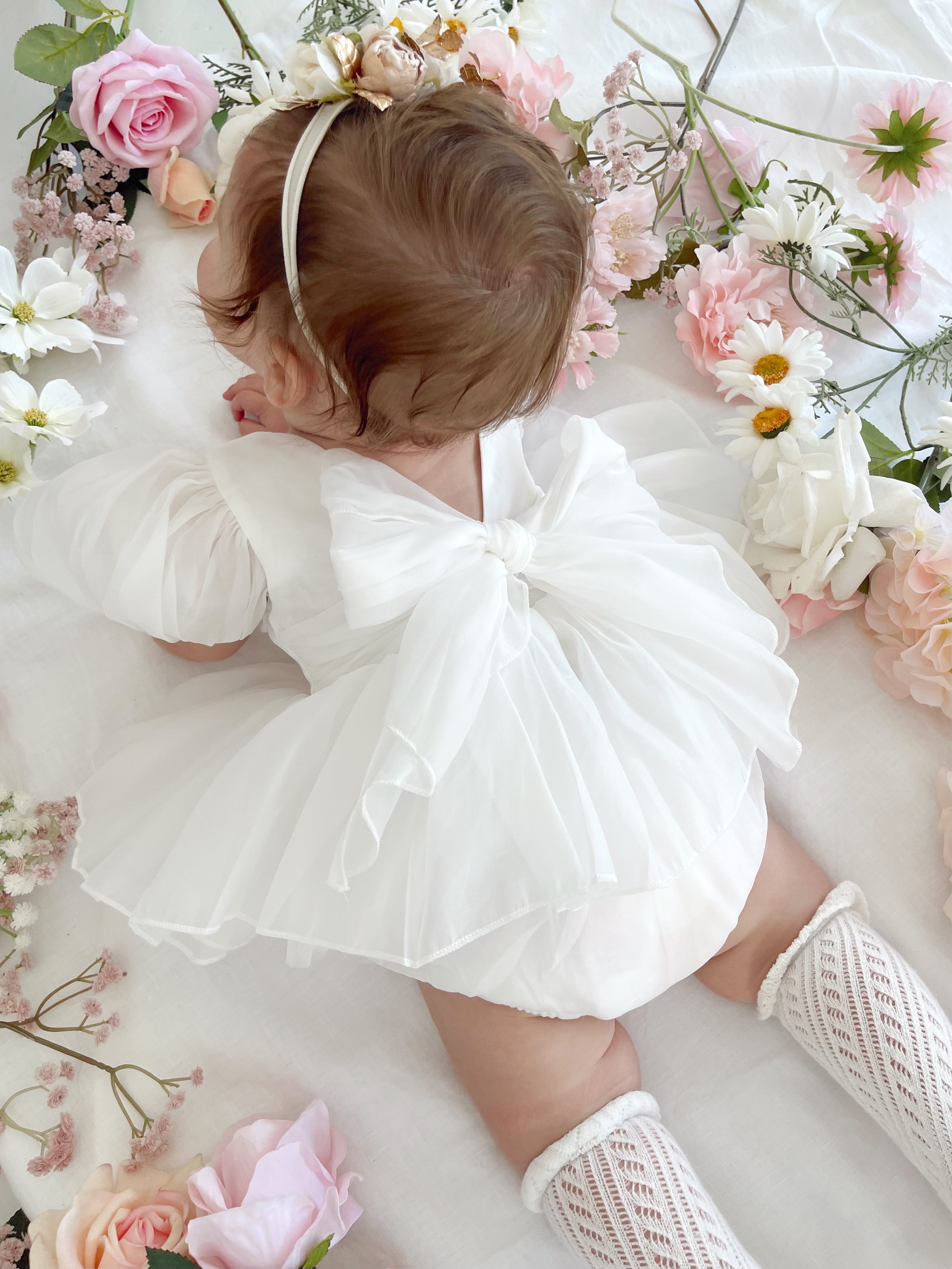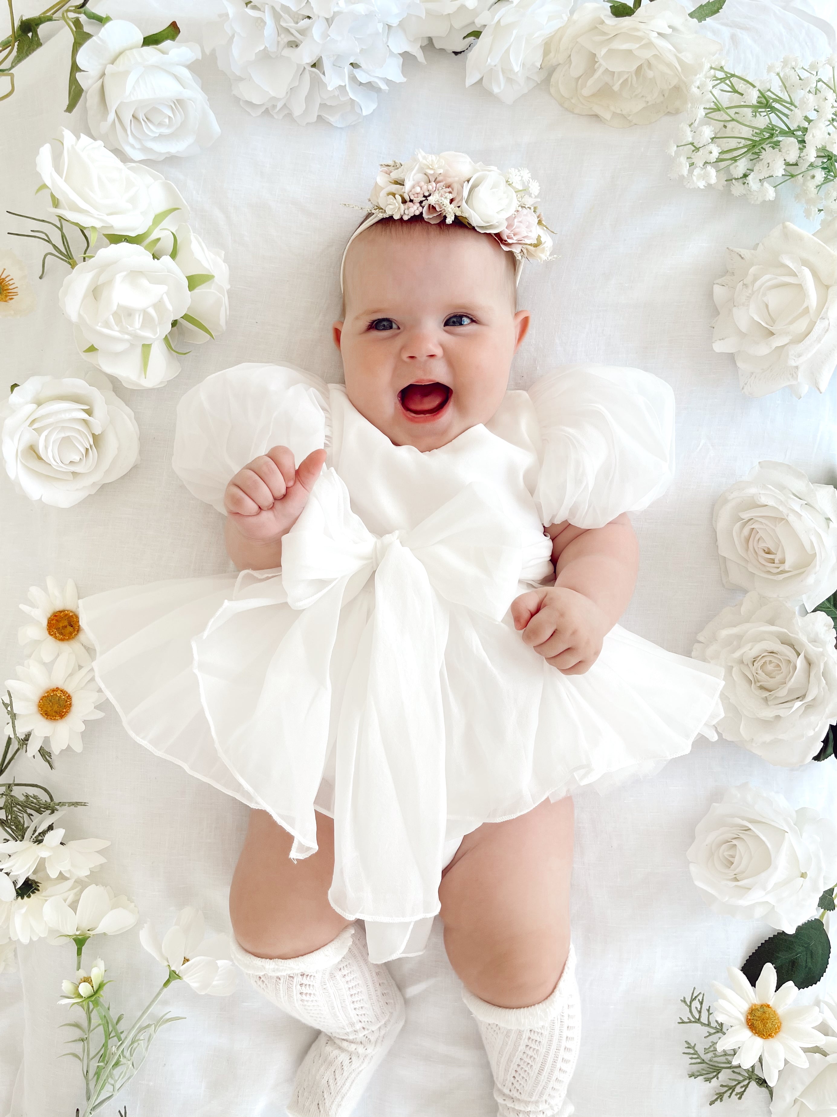 Prepare to be obsessed with the gorgeous Clementine Matte White Organza Baby Girl Romper!