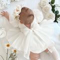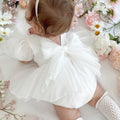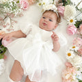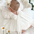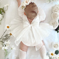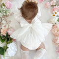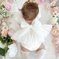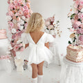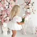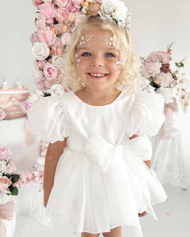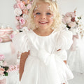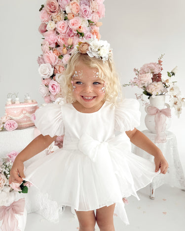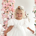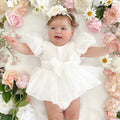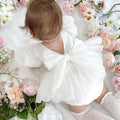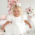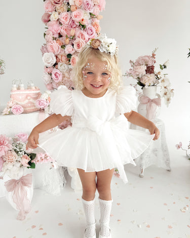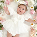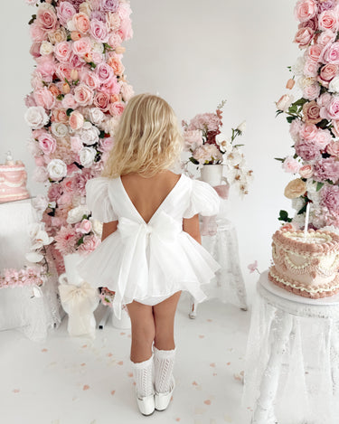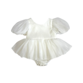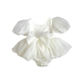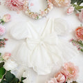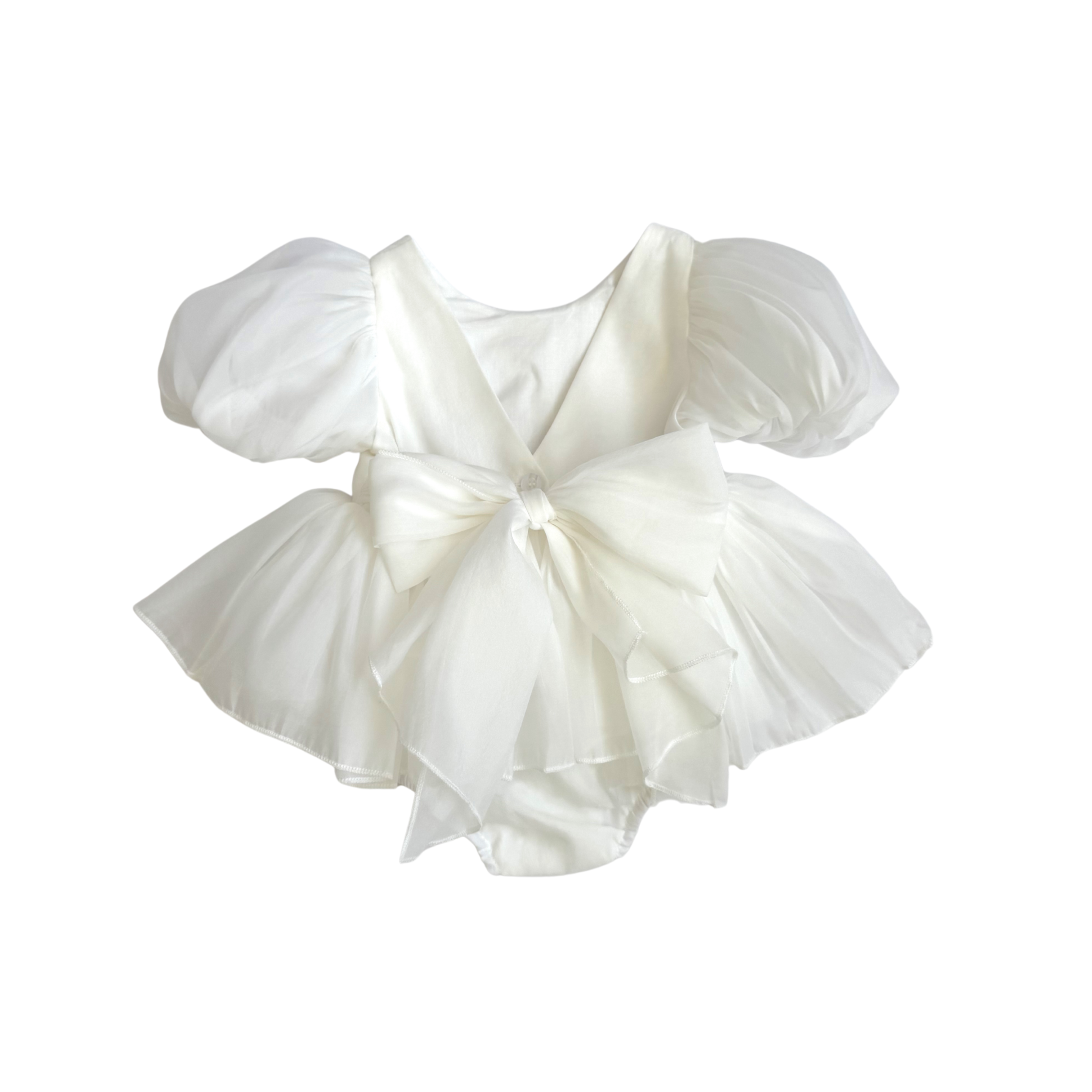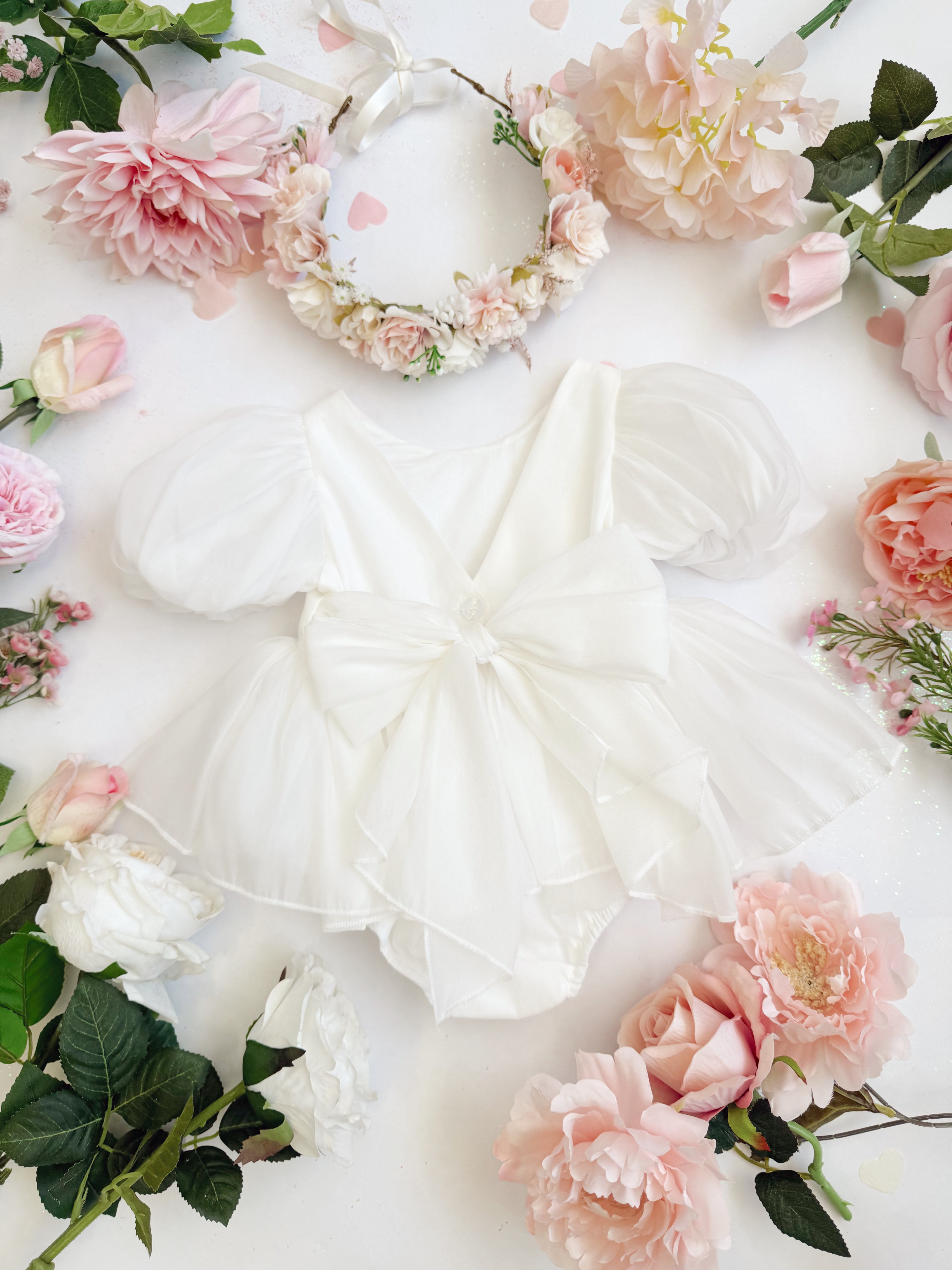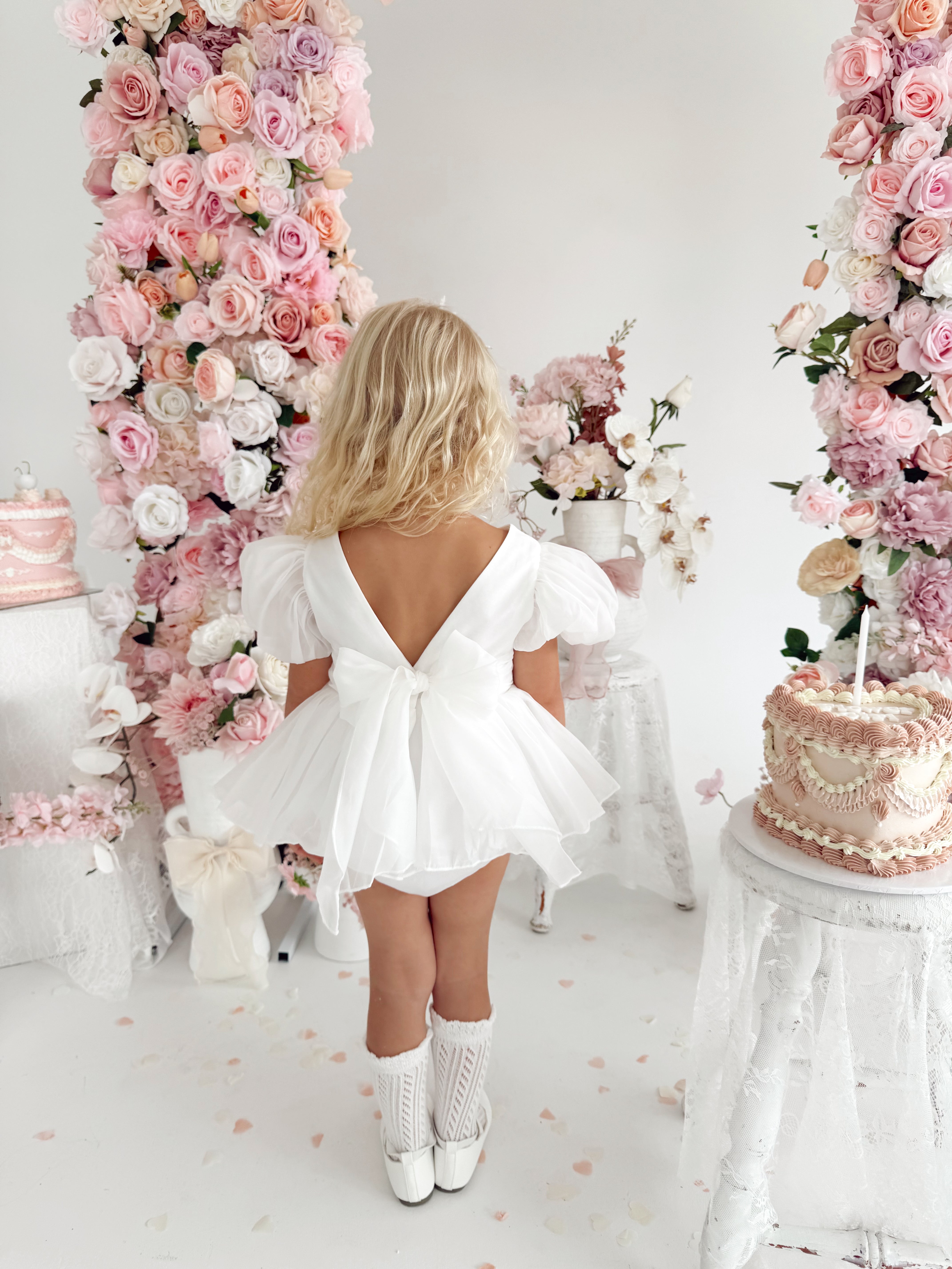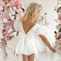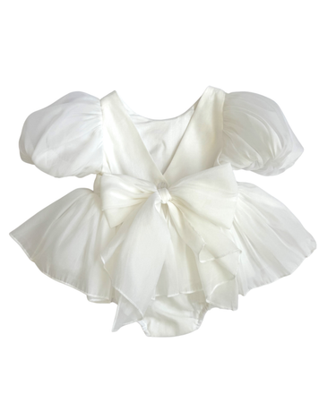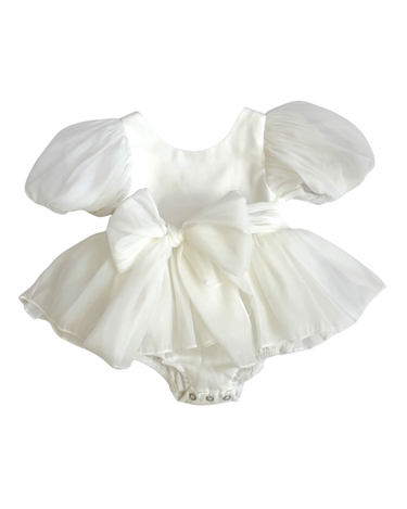 This matte white organza romper features the cutest puffed sleeves, a V-back, a peplum-style swing top, and a sweet bow detail that can be tied to the front or back. Your little girl will feel like a real-life princess with the matte organza layered tulle skirt!
