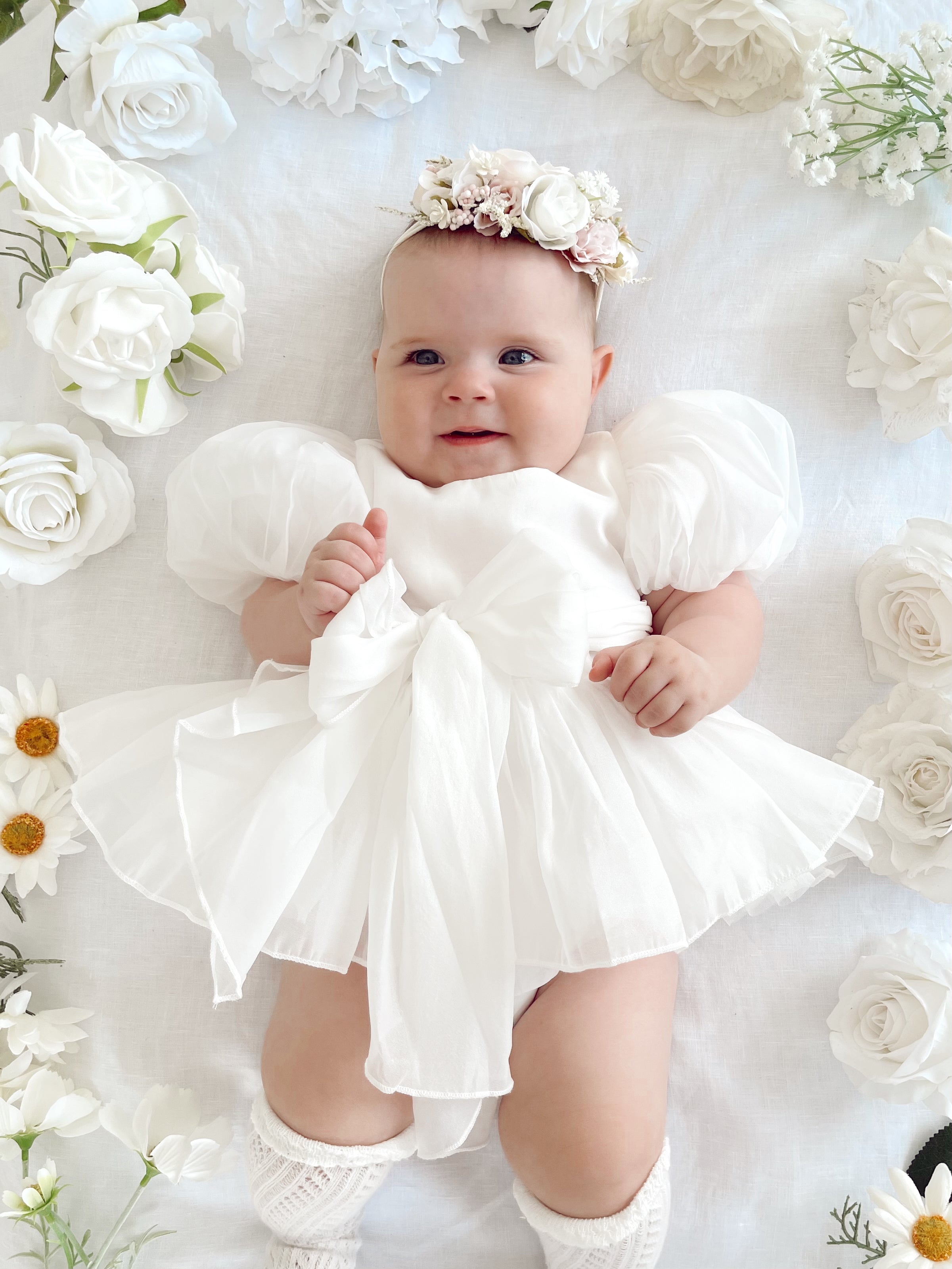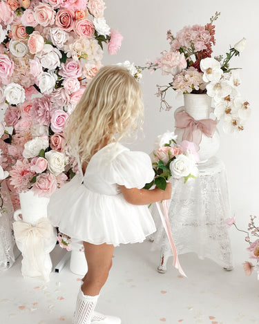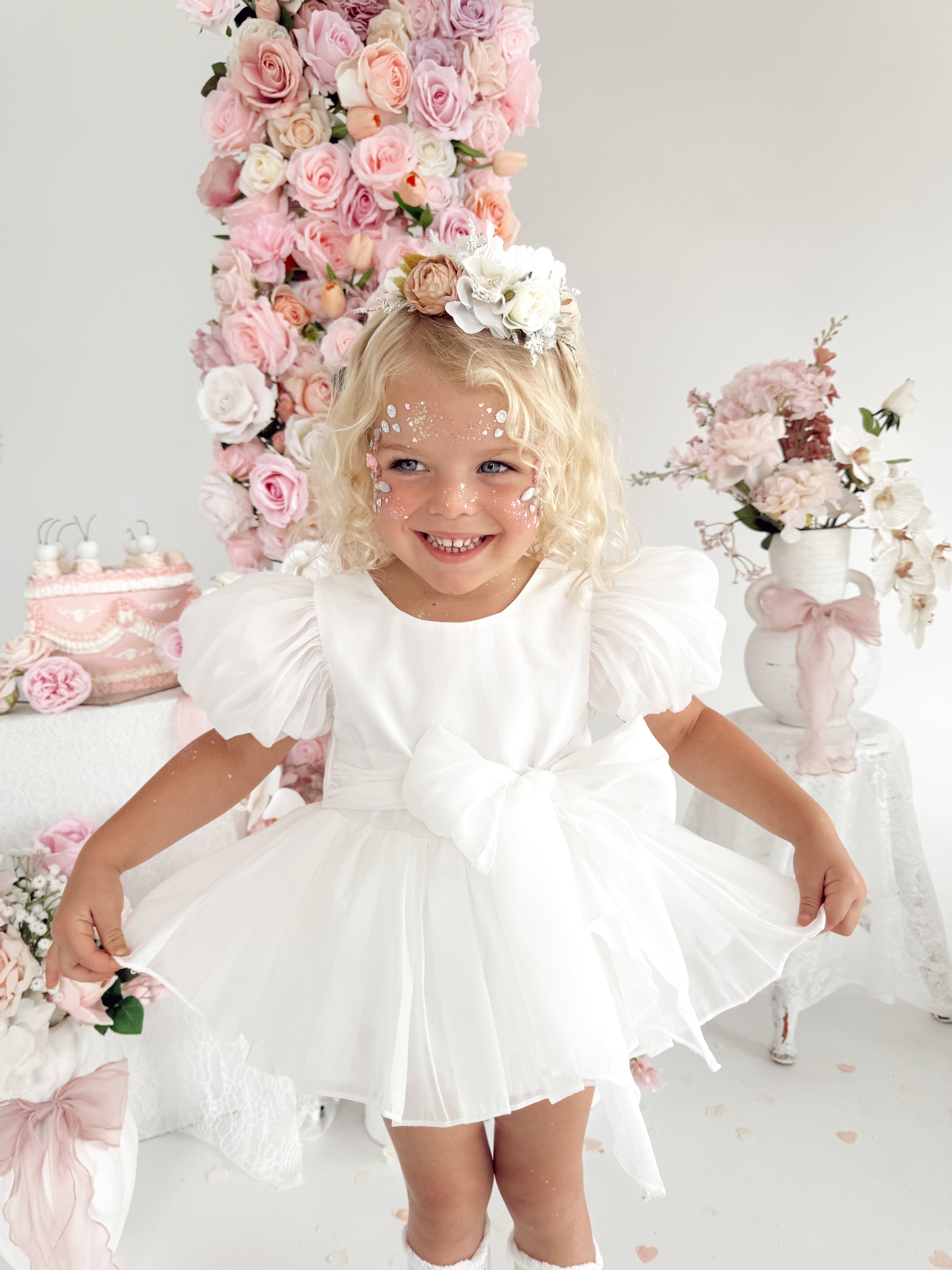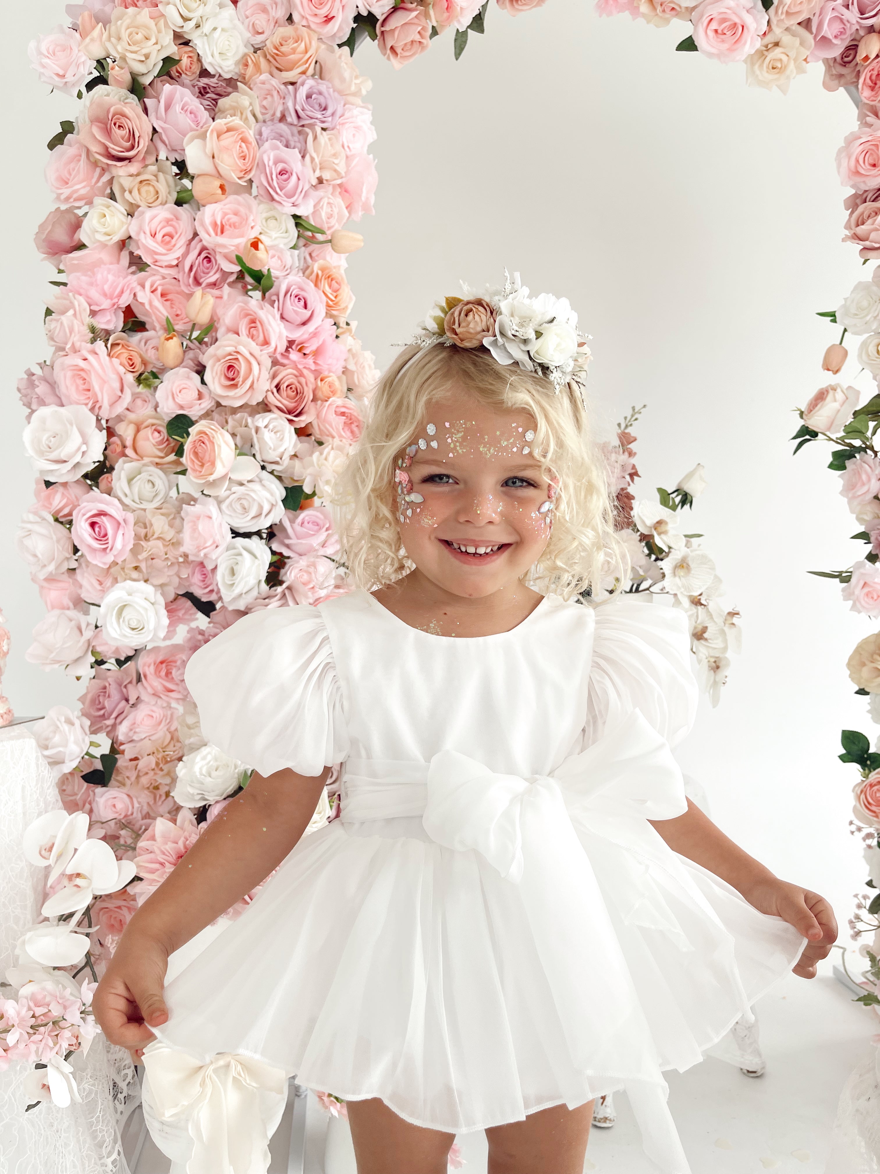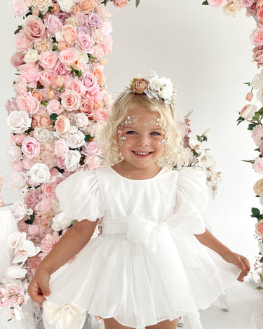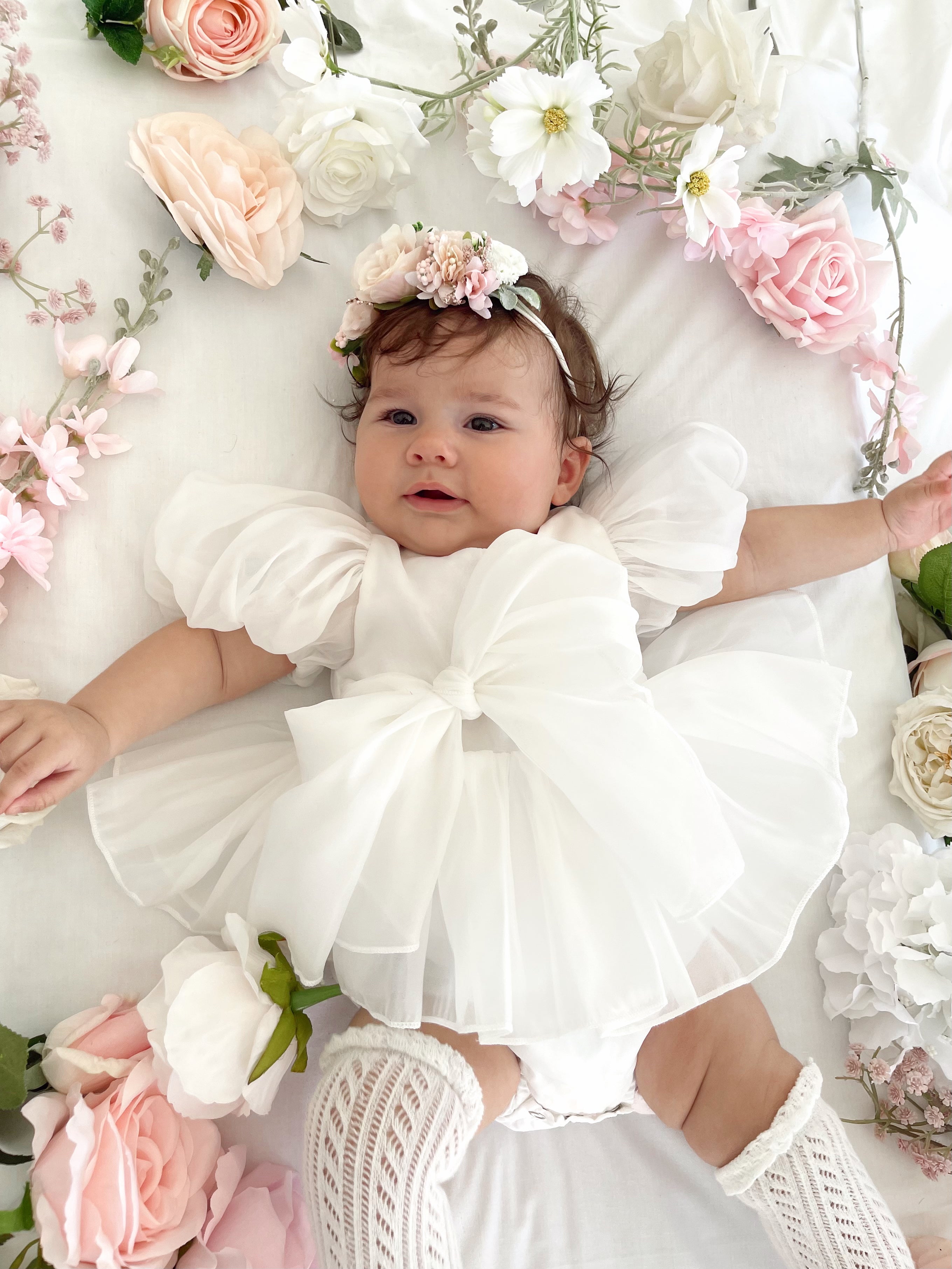 Introducing the Flower Girl Collection, a timeless blend of sweetness and elegance. This collection features our matte organza dresses and matching sister rompers in stunning, blush rose, white, and cream. Soft organza, delicate details, and gentle textures make each piece perfect for weddings, celebrations, and those picture-perfect moments. The collection is completed with matching accessories and matte organza hair bows for the sweetest finishing touch. Classic, dreamy, and beautifully refined, the Flower Girl Collection is made for magical moments.