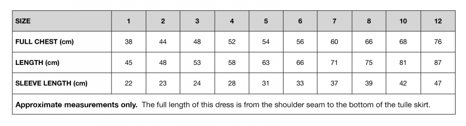 The bodice is crafted from incredibly soft lace and lined at the front with stretch jersey cotton, offering comfort against the skin. The dreamy knee-length skirt is made with four layers of soft tulle, cotton-lined for added comfort, and includes an elastic waistband for a flexible fit. Depending on your child’s height, the skirt typically falls around the knees.