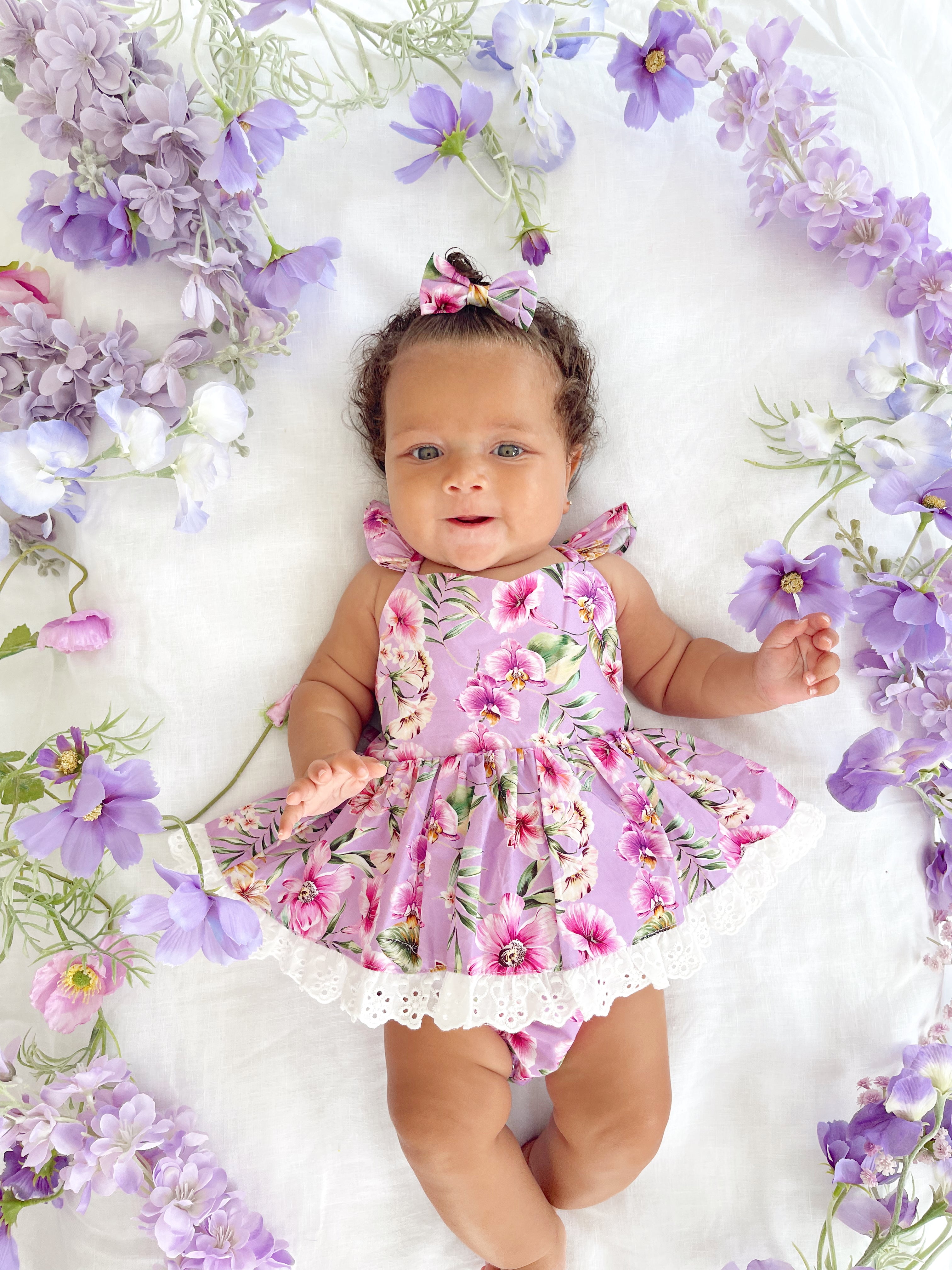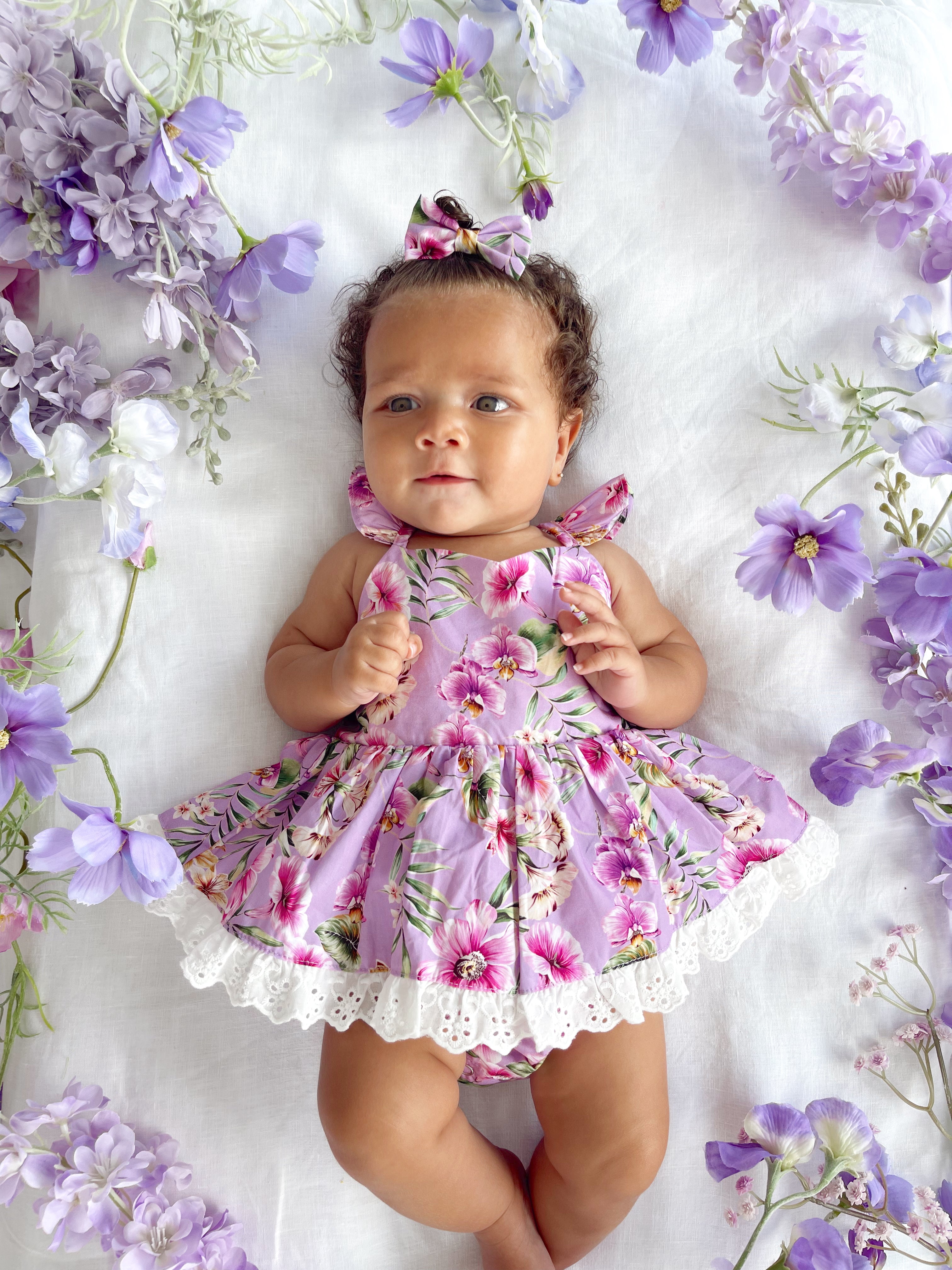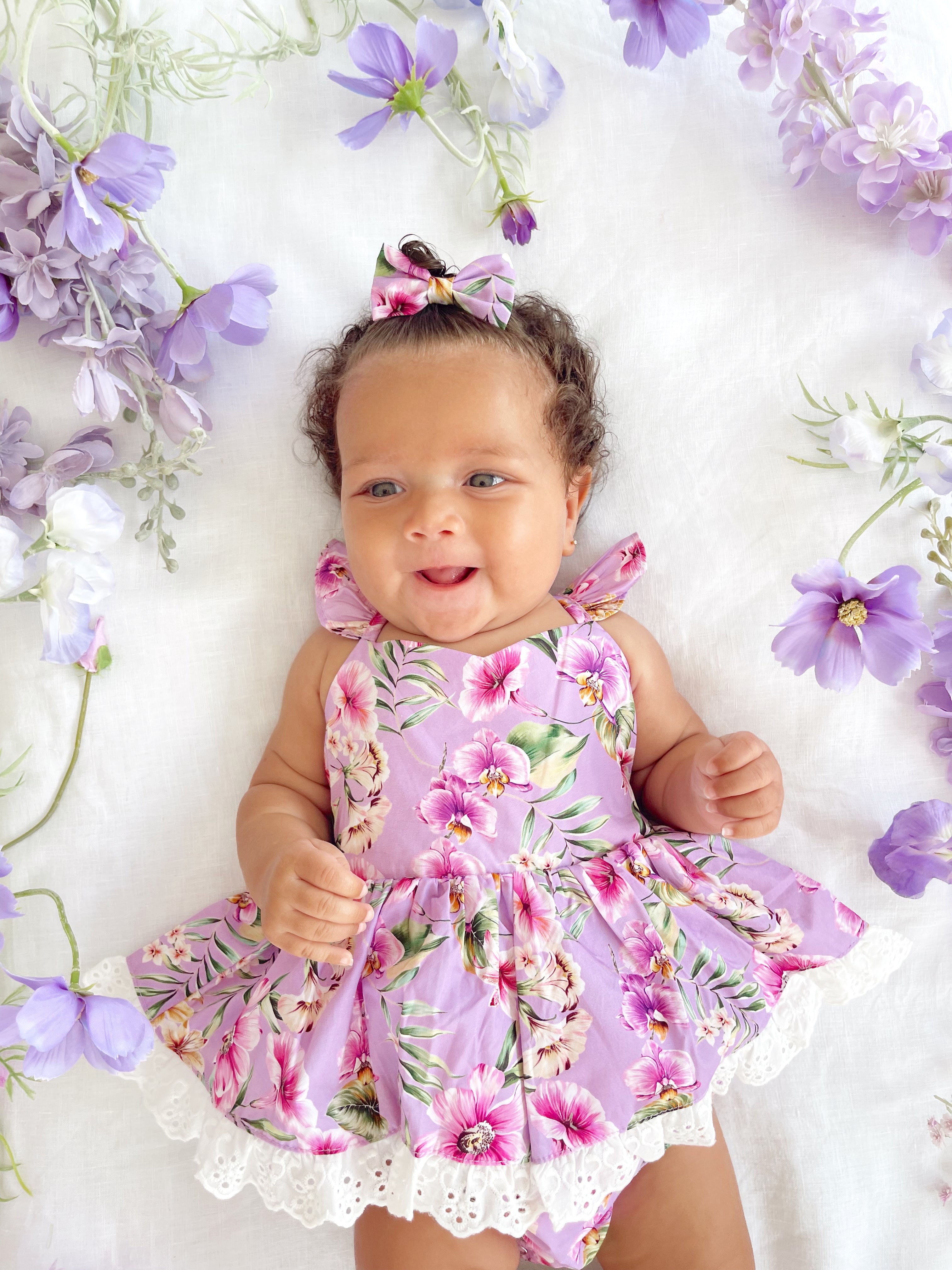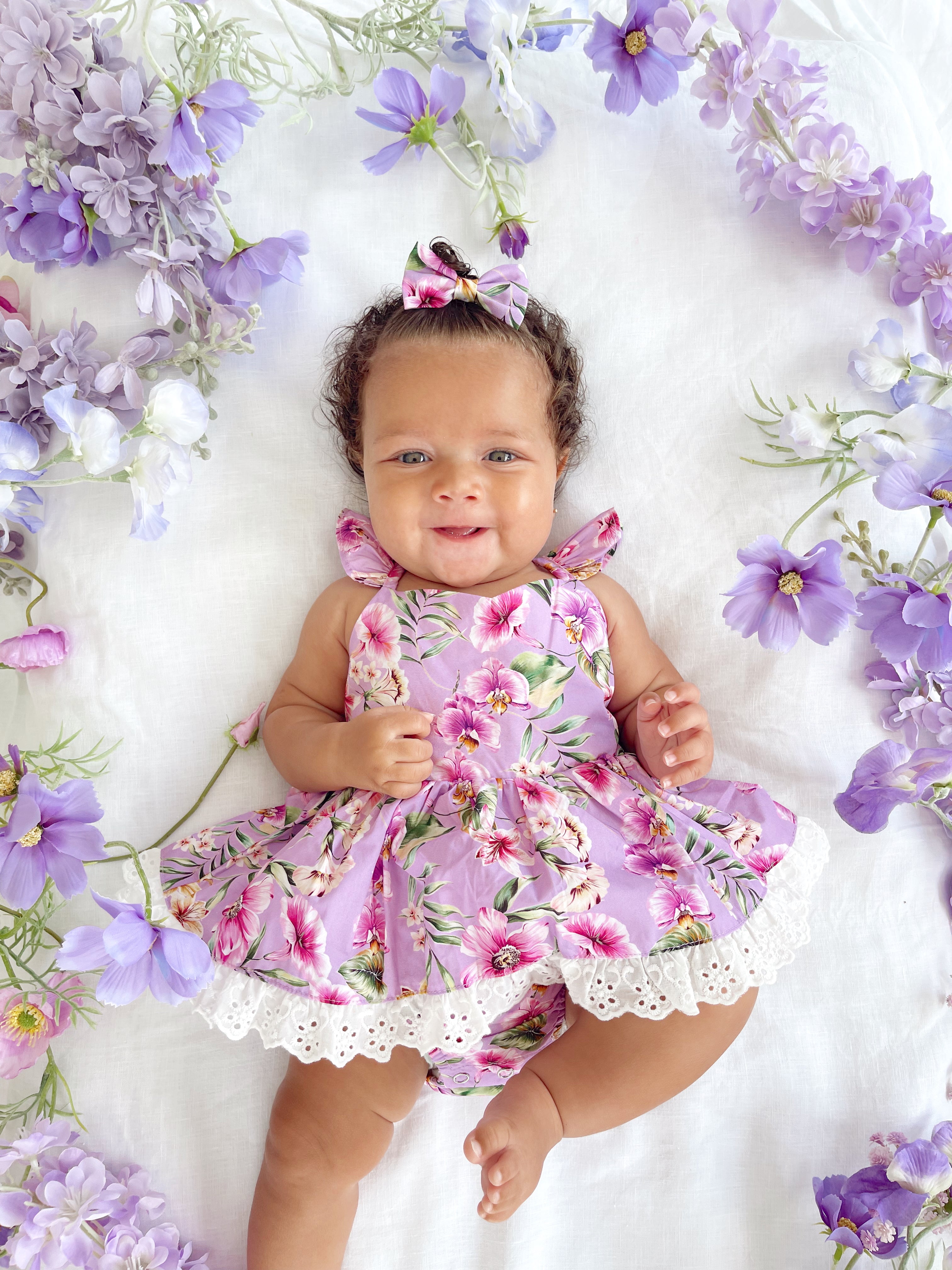 Oh so adorable! Say hello to our Hibiscus Breeze Baby Girl Purple Floral Cotton Romper!