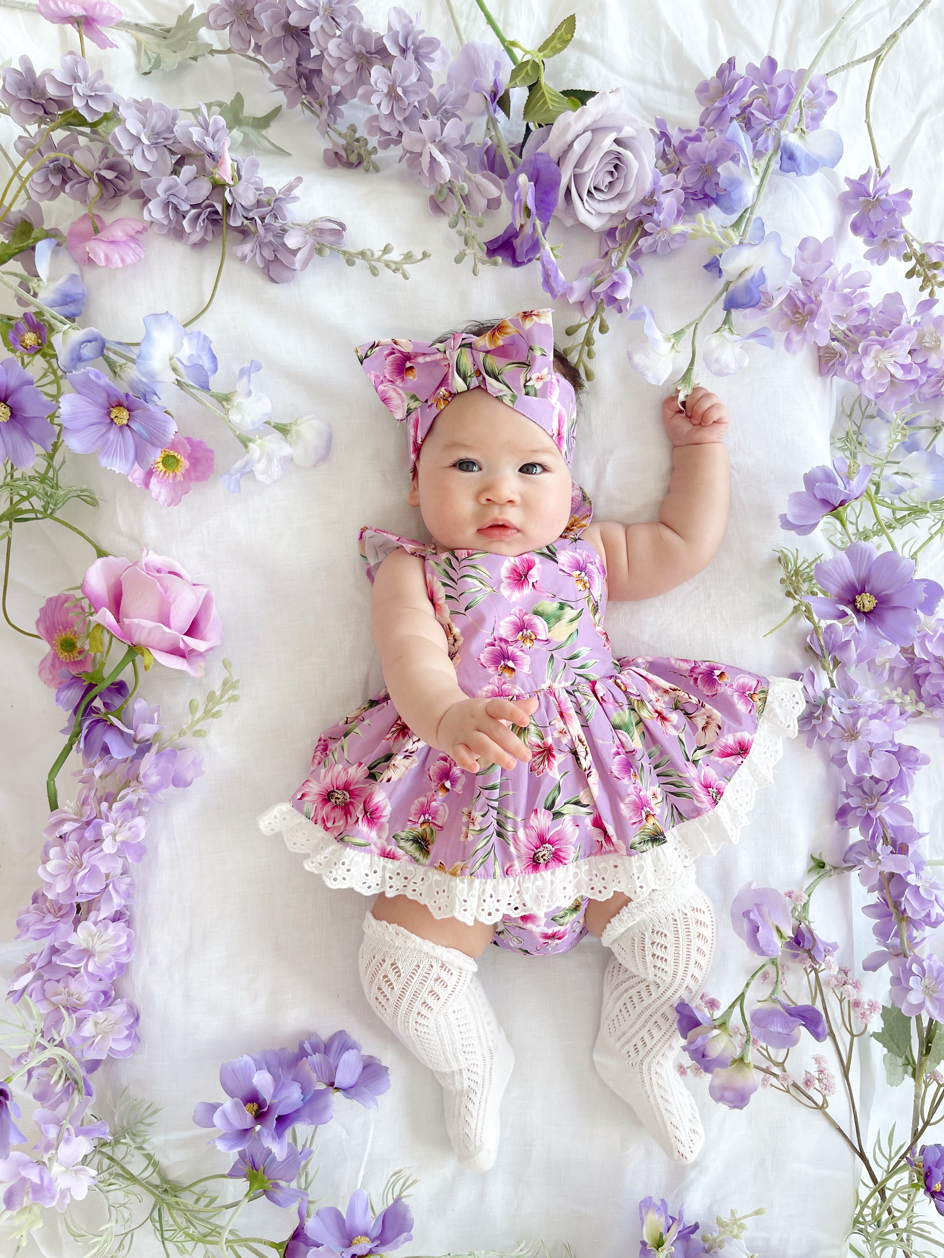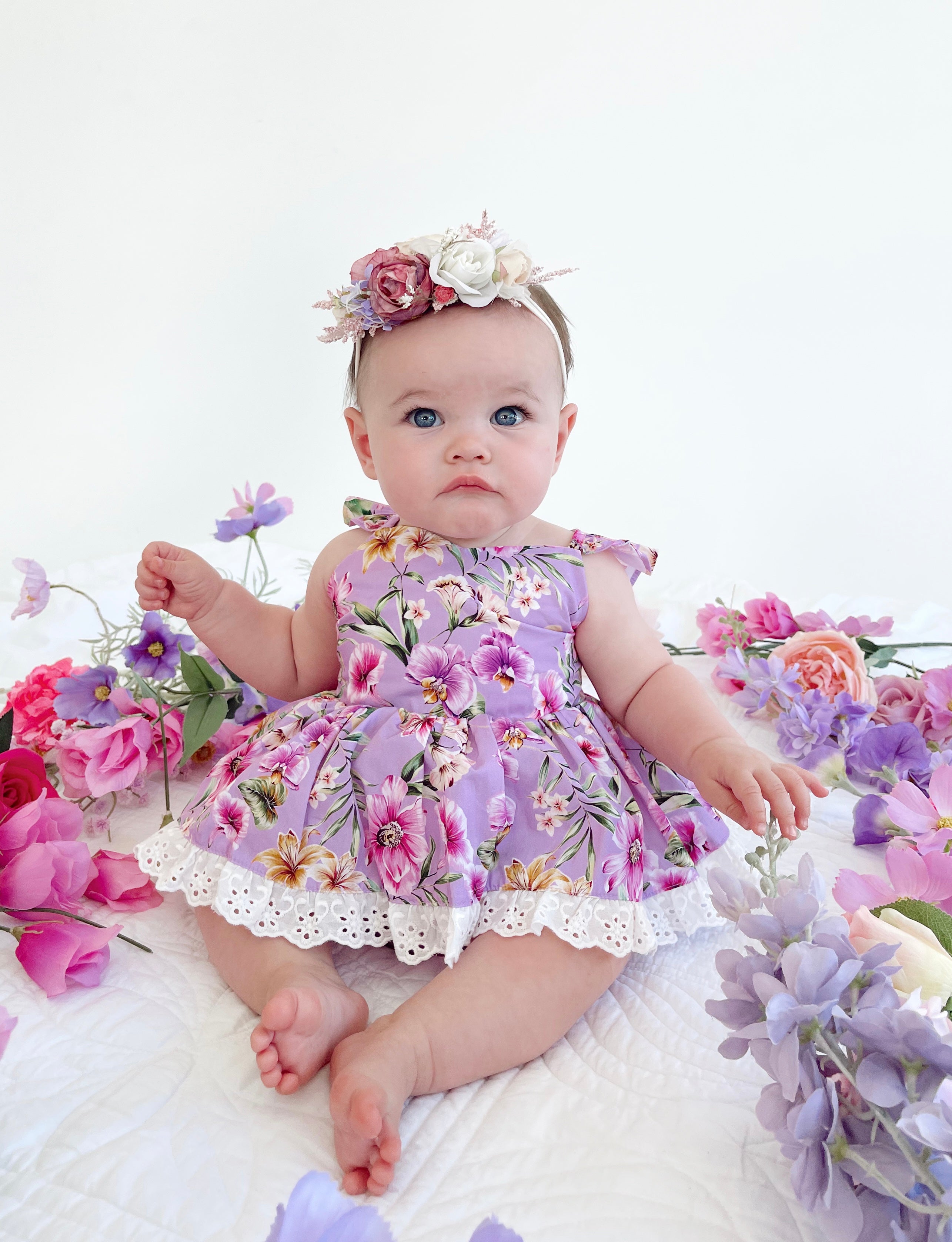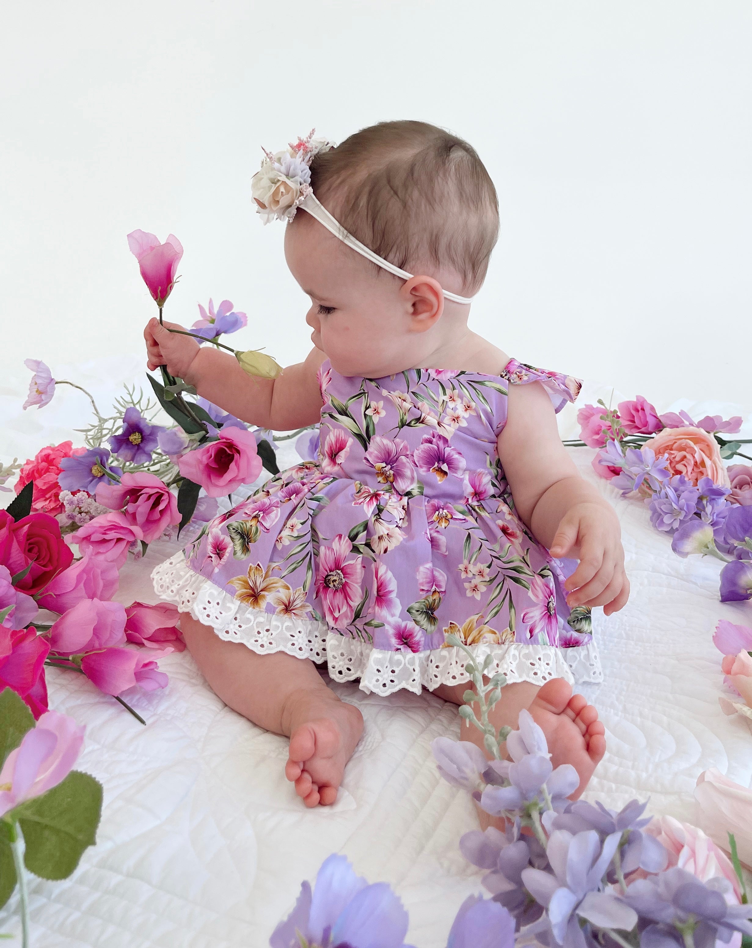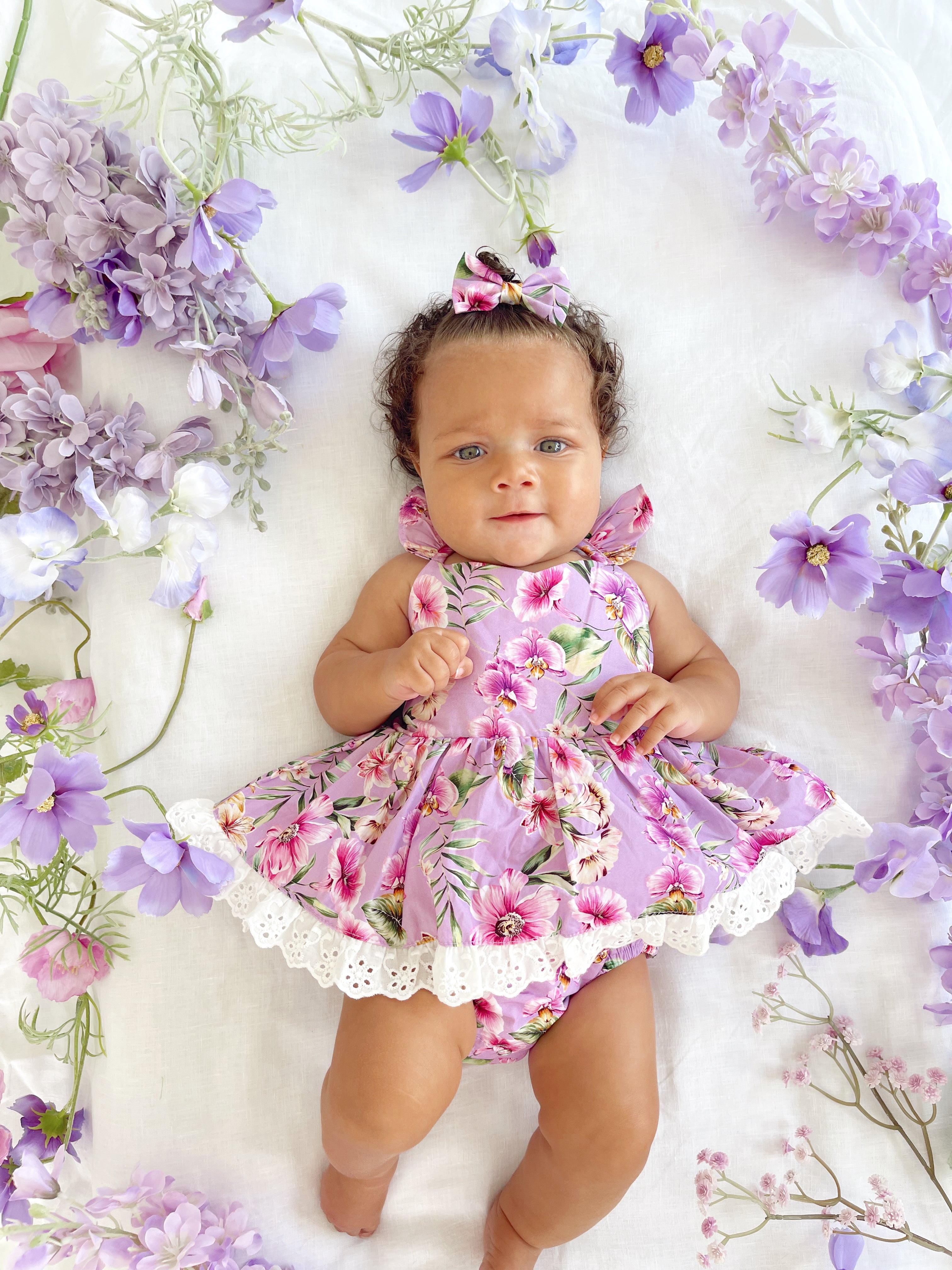 Oh so adorable! Say hello to our Hibiscus Breeze Baby Girl Purple Floral Cotton Romper!