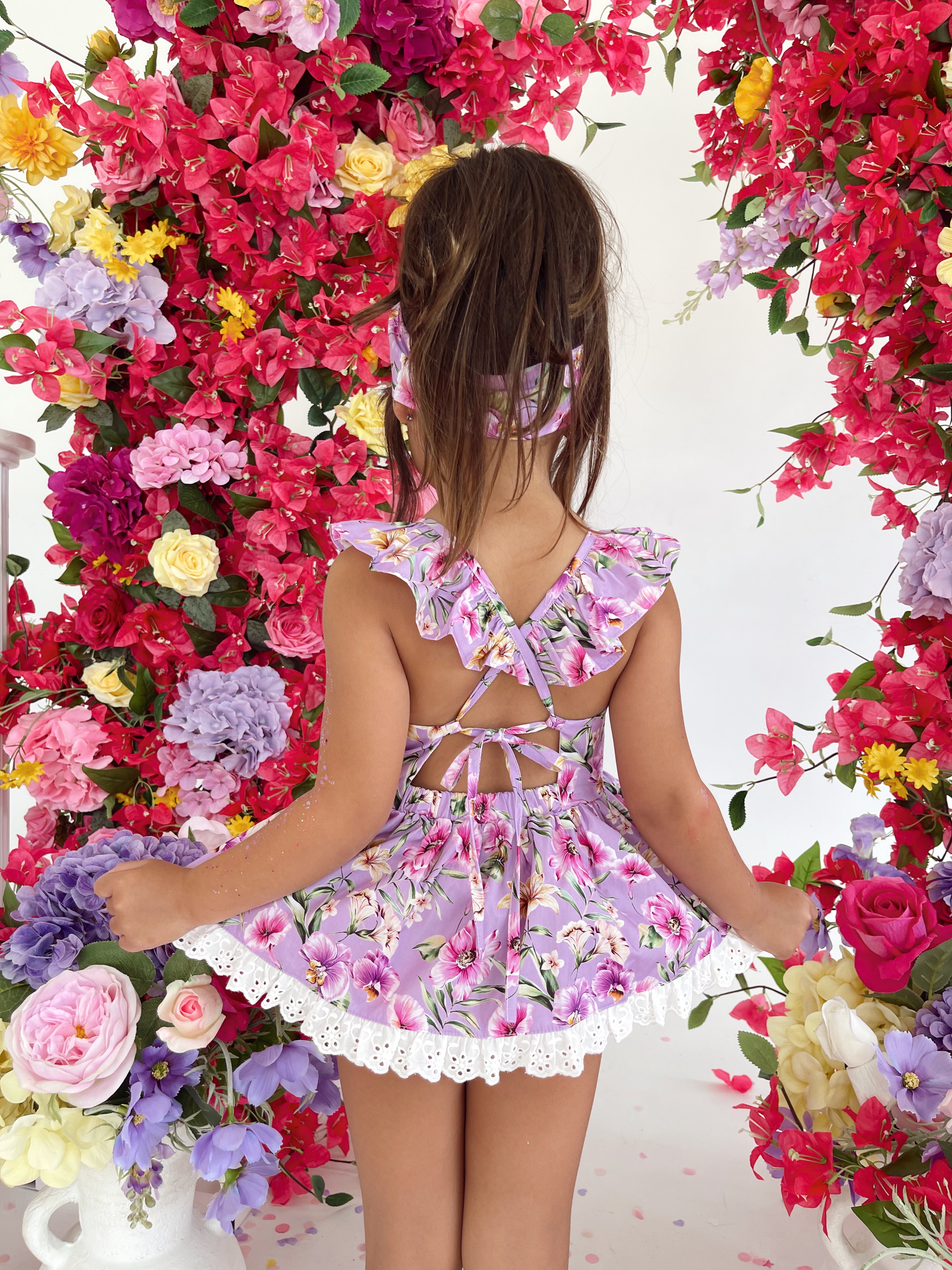 Crafted in the sweetest purple floral print, our Hibiscus Breeze Baby Girl Purple Floral Cotton Romper is a must-have addition to your little girl’s collection! It features a sweetheart neckline, adorable ruffled straps that cross over and tie into a bow at the back, a peplum-style swing top, and delicate broderie anglaise frill detailing.