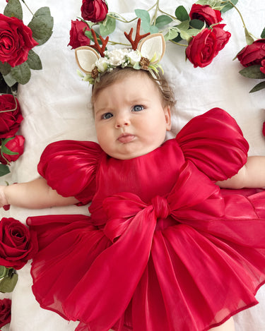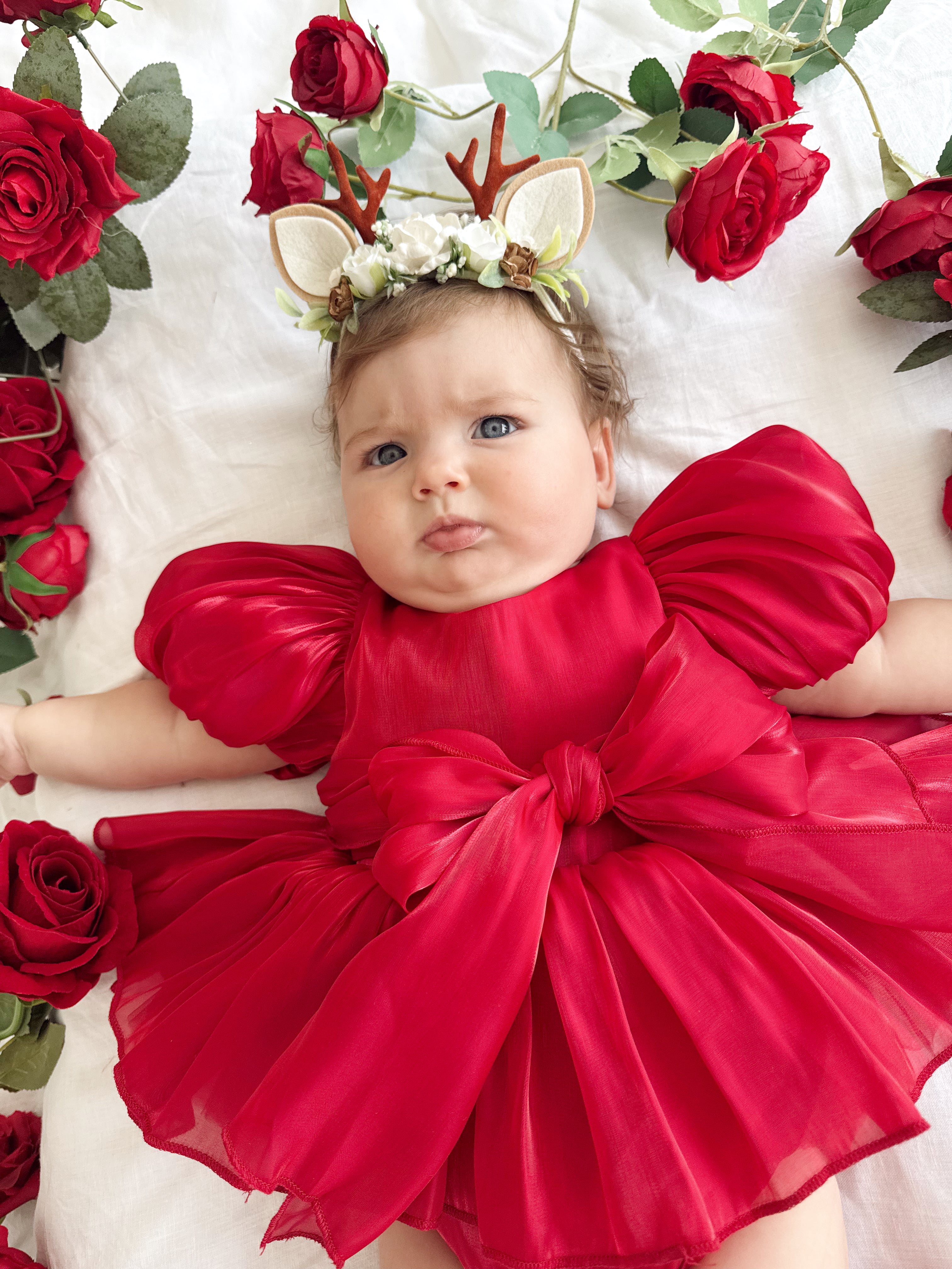 Our Angel Christmas Reindeer Stretch Headband features sweet white florals with reindeer antlers. Add that extra special touch to your baby girls festive outfit.