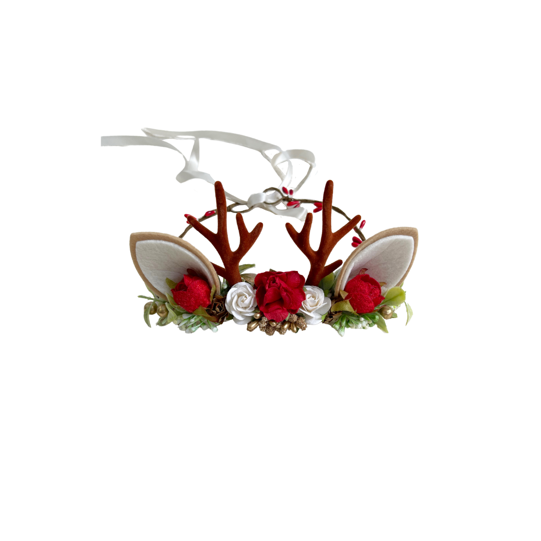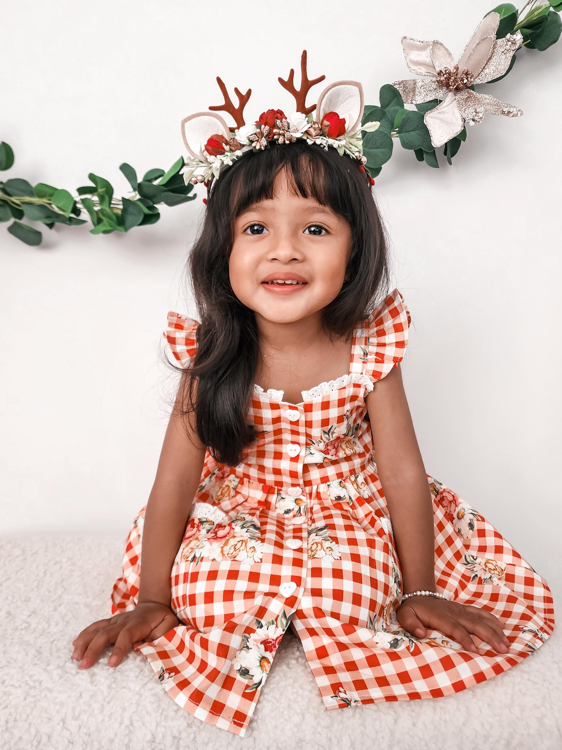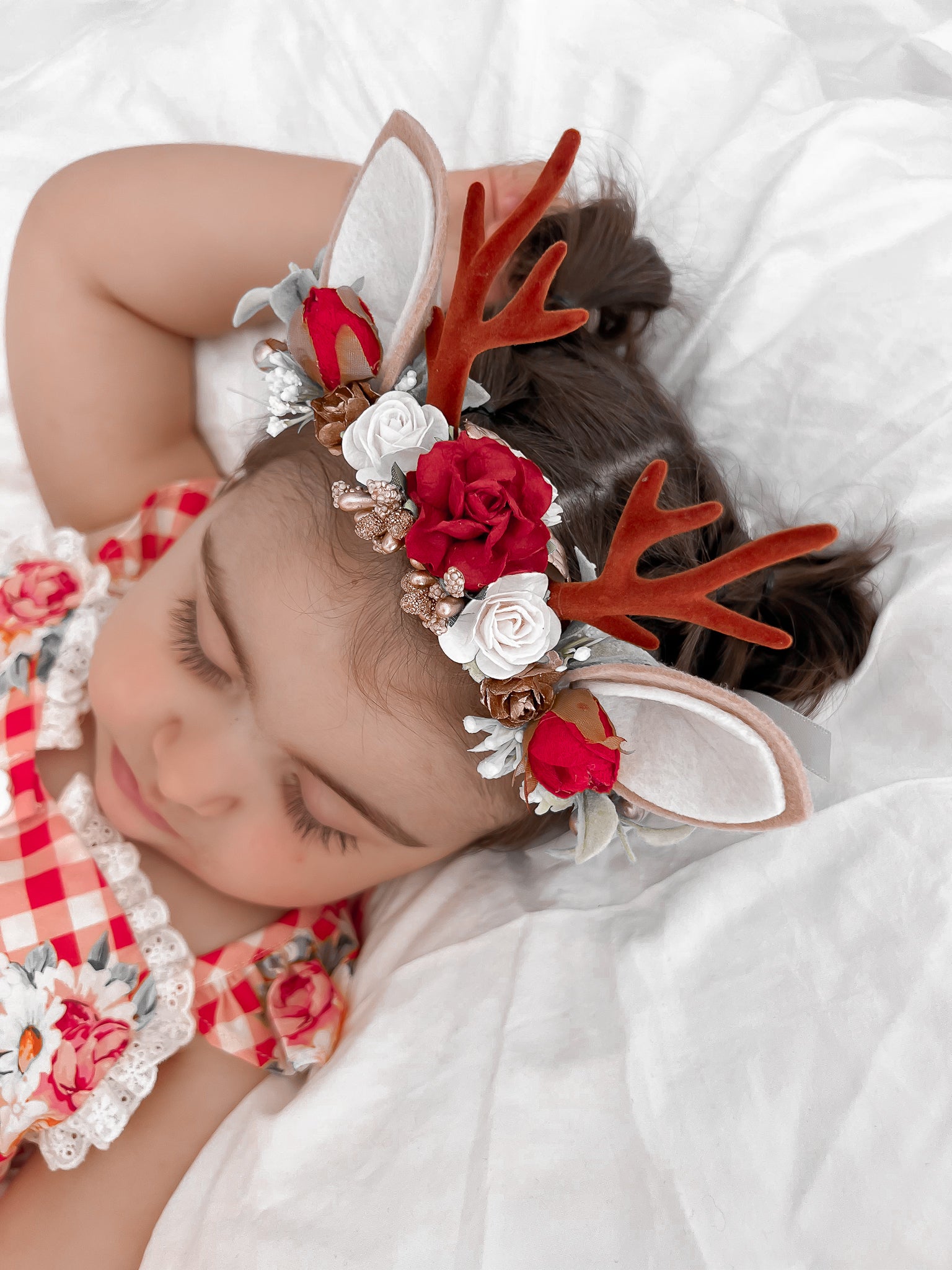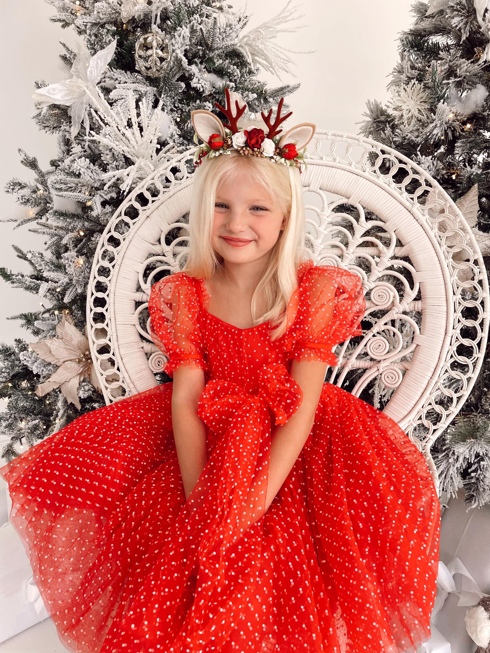 Notre guirlande de Noël rouge Rudolph, ornée de jolies fleurs rouges et de bois de renne, apportera une touche d'originalité à la tenue festive de votre petite fille.
