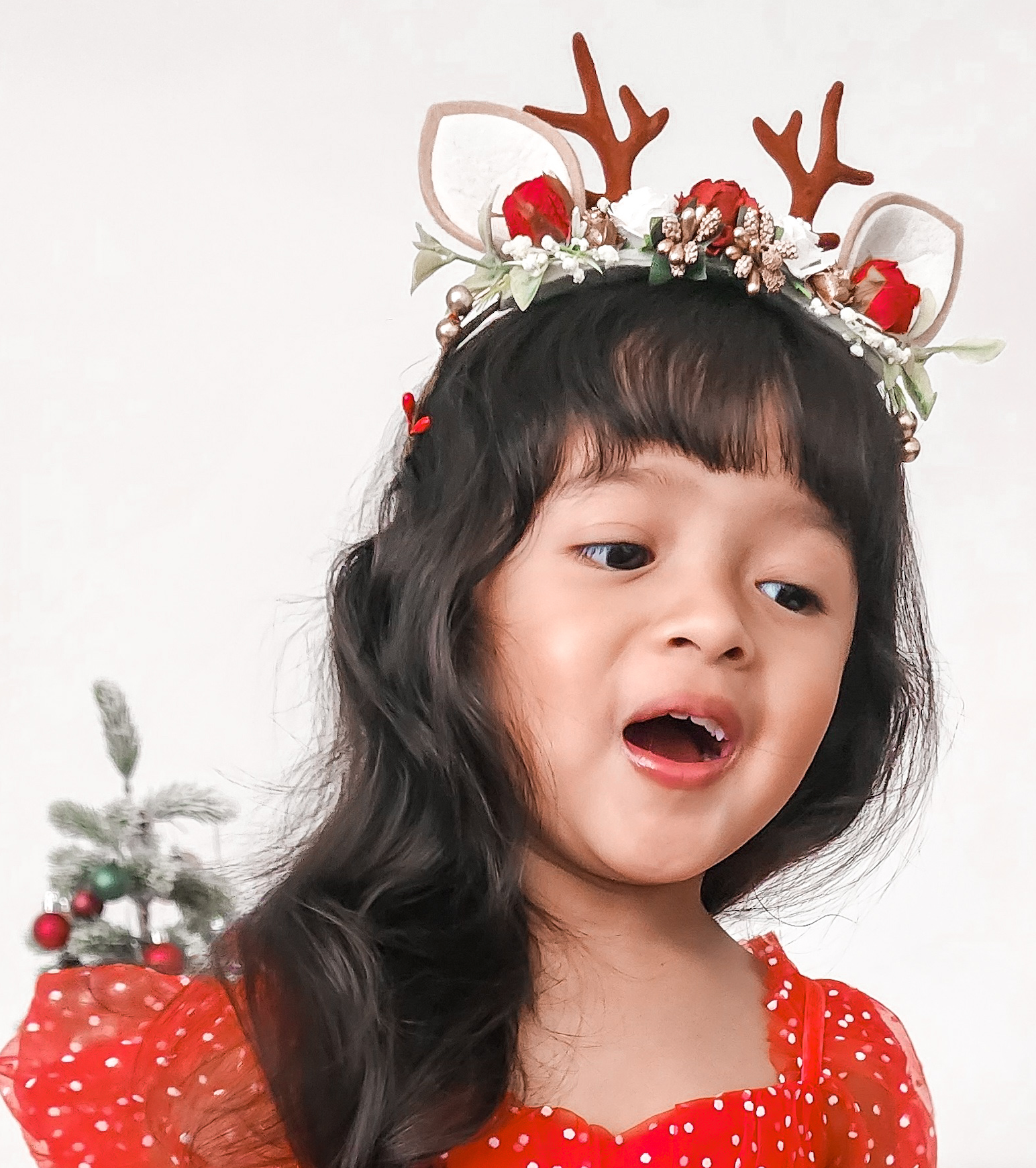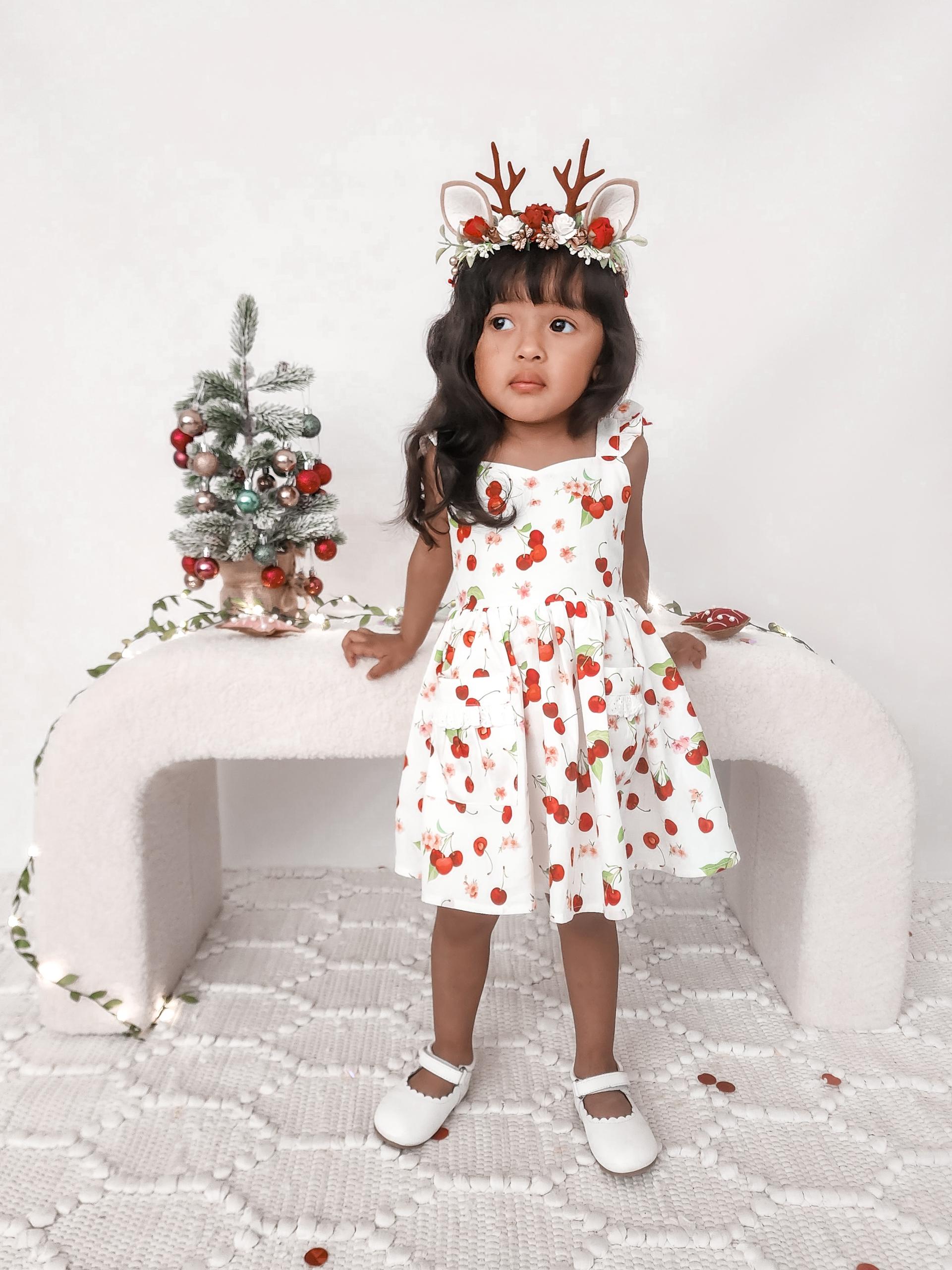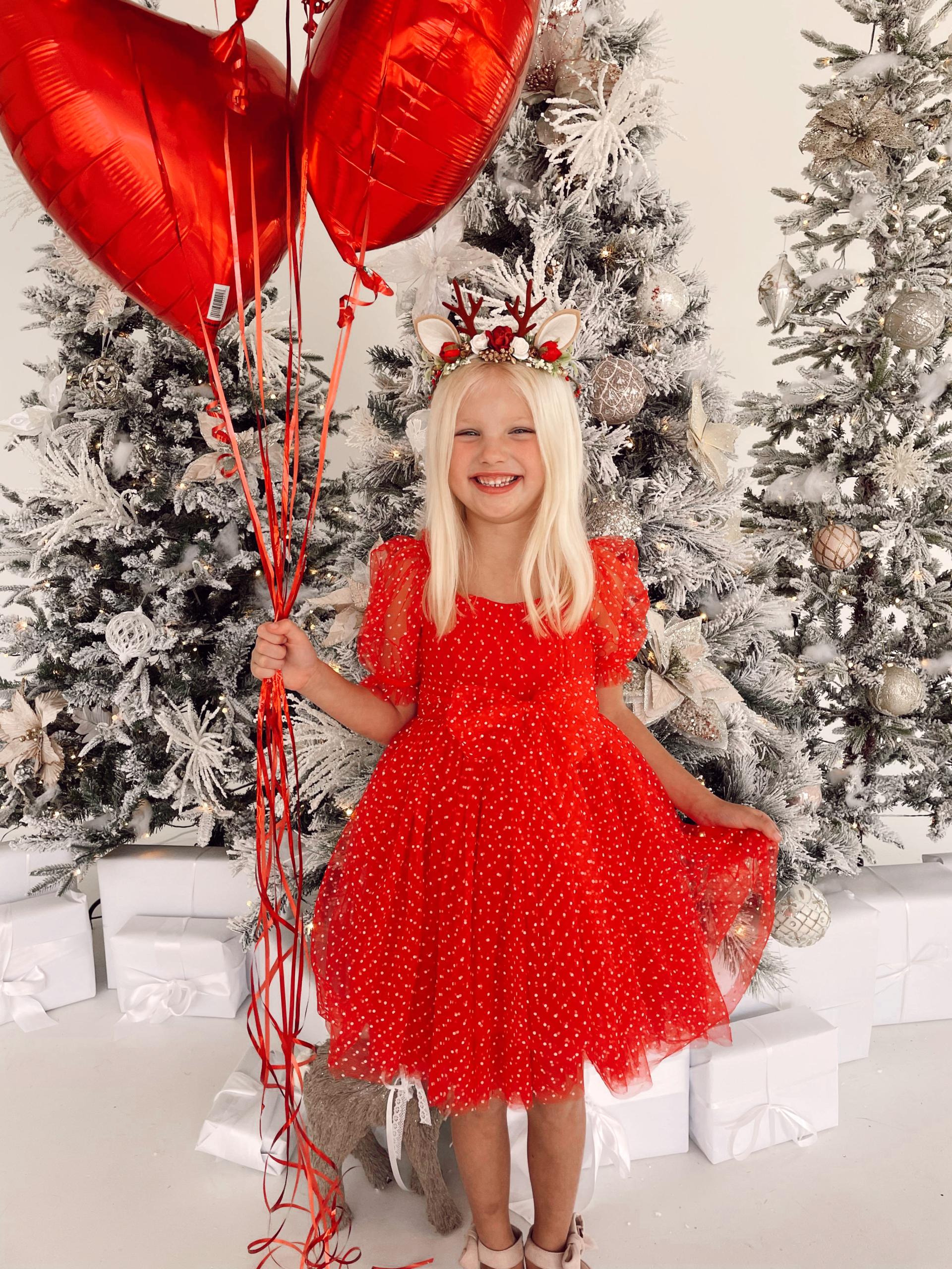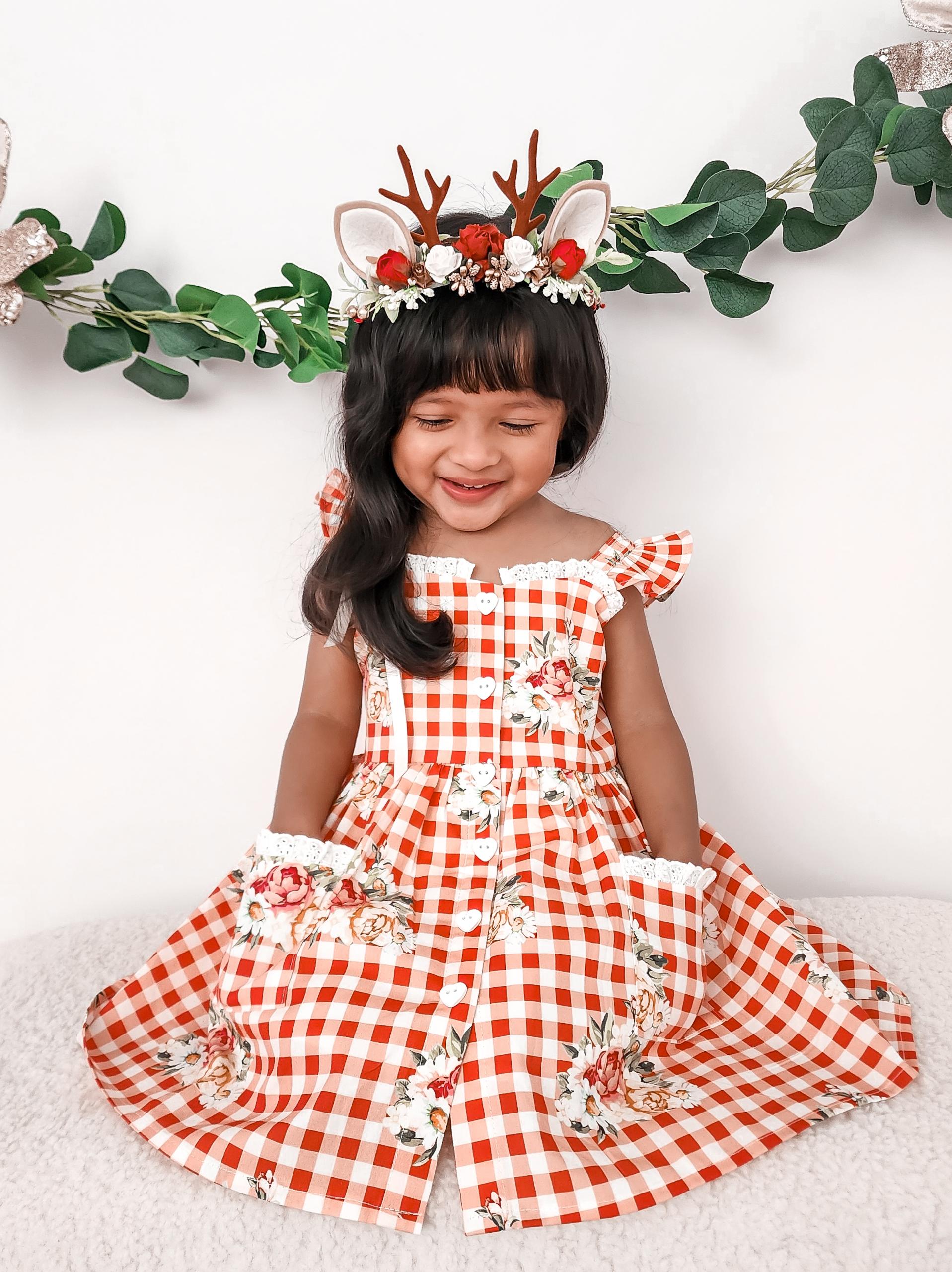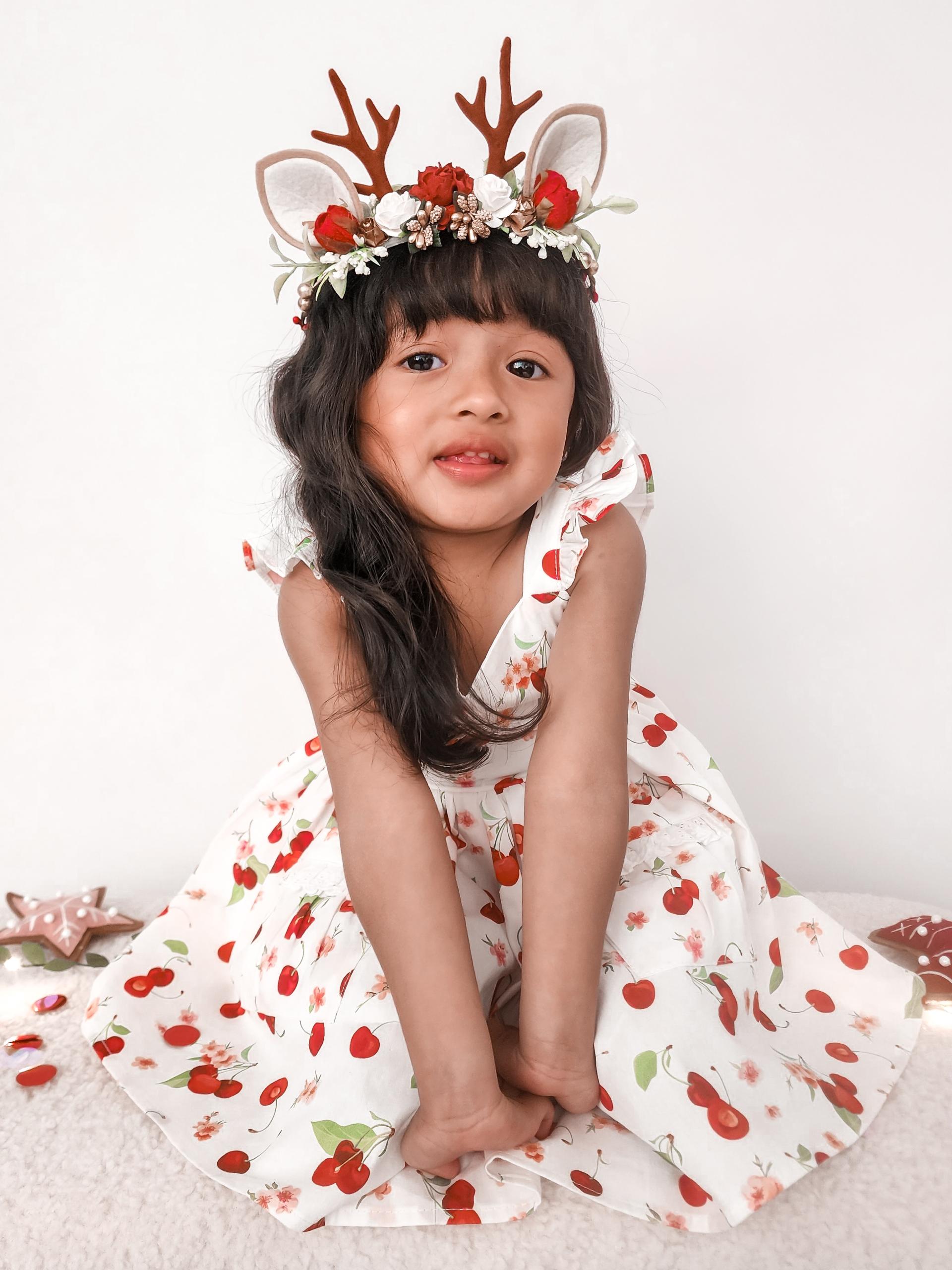 Notre guirlande de Noël rouge Rudolph, ornée de jolies fleurs rouges et de bois de renne, apportera une touche d'originalité à la tenue festive de votre petite fille.