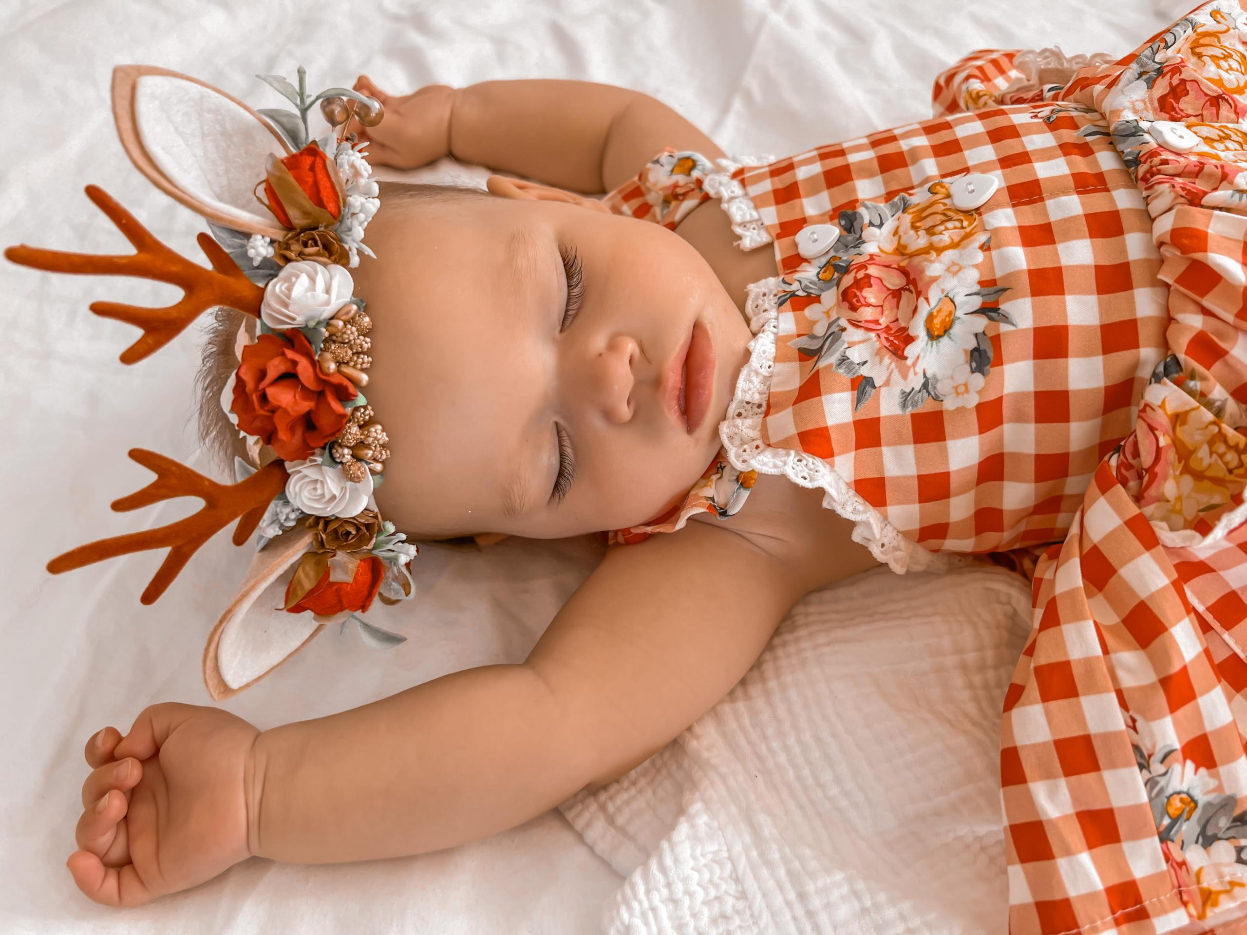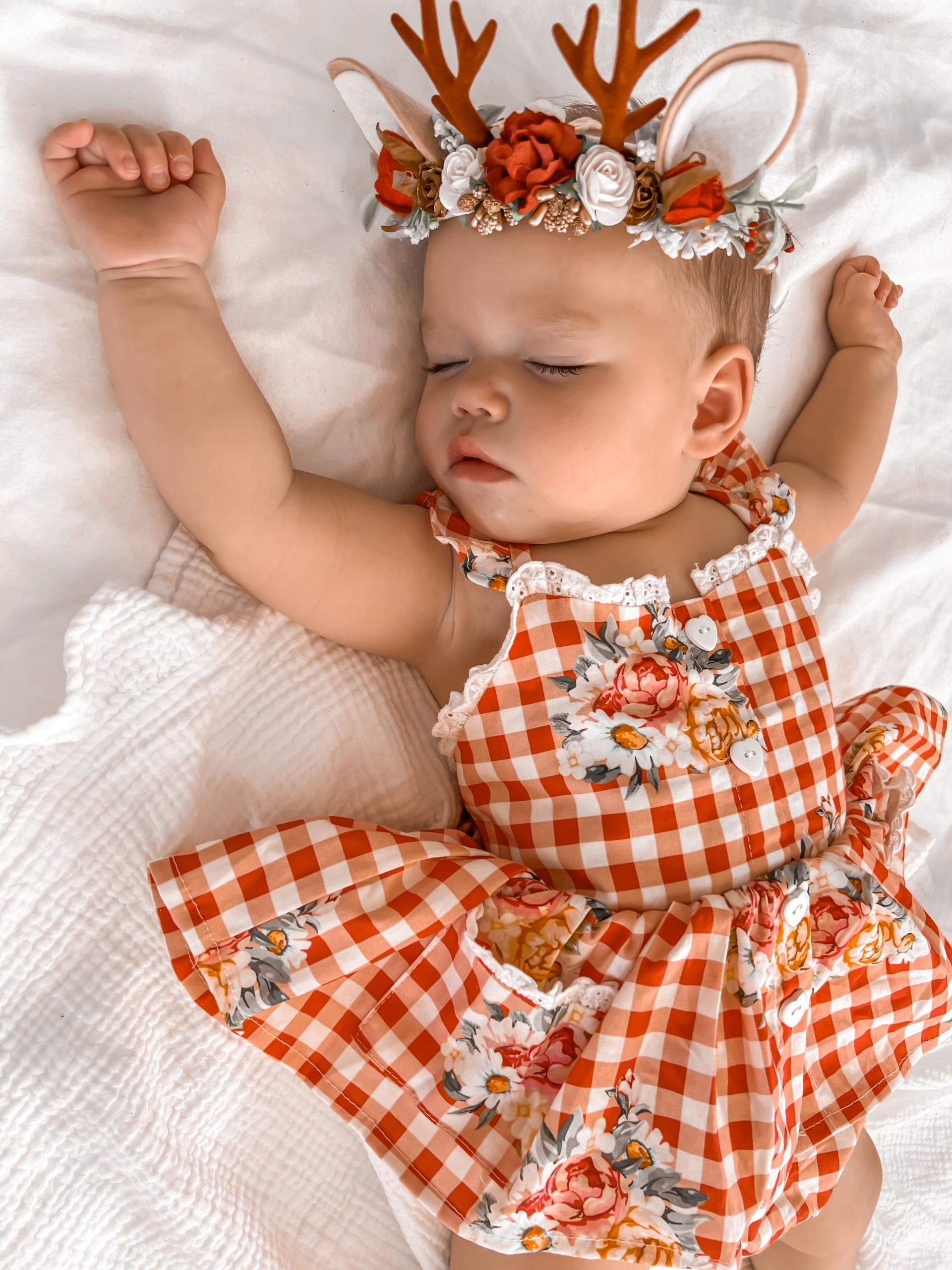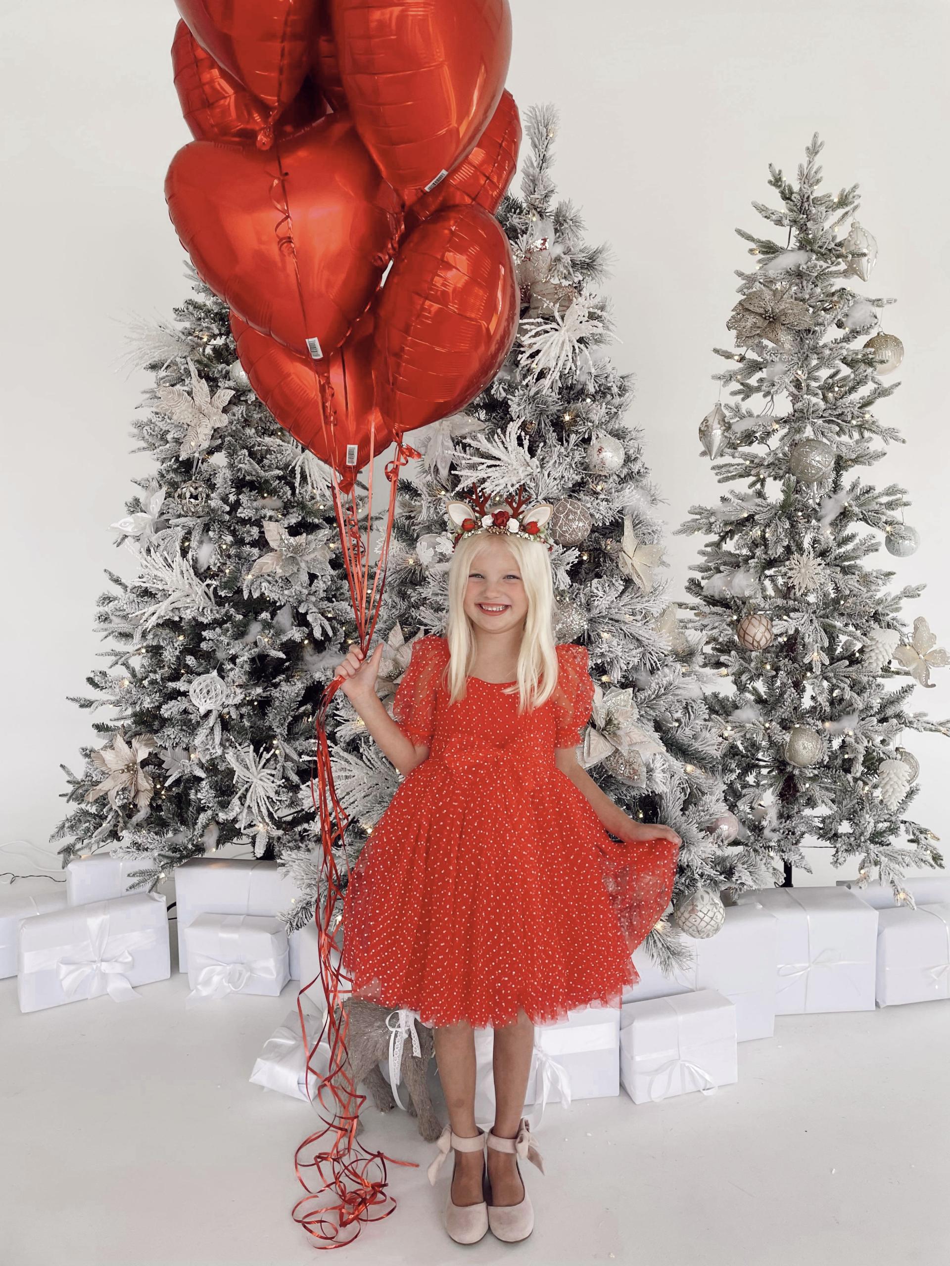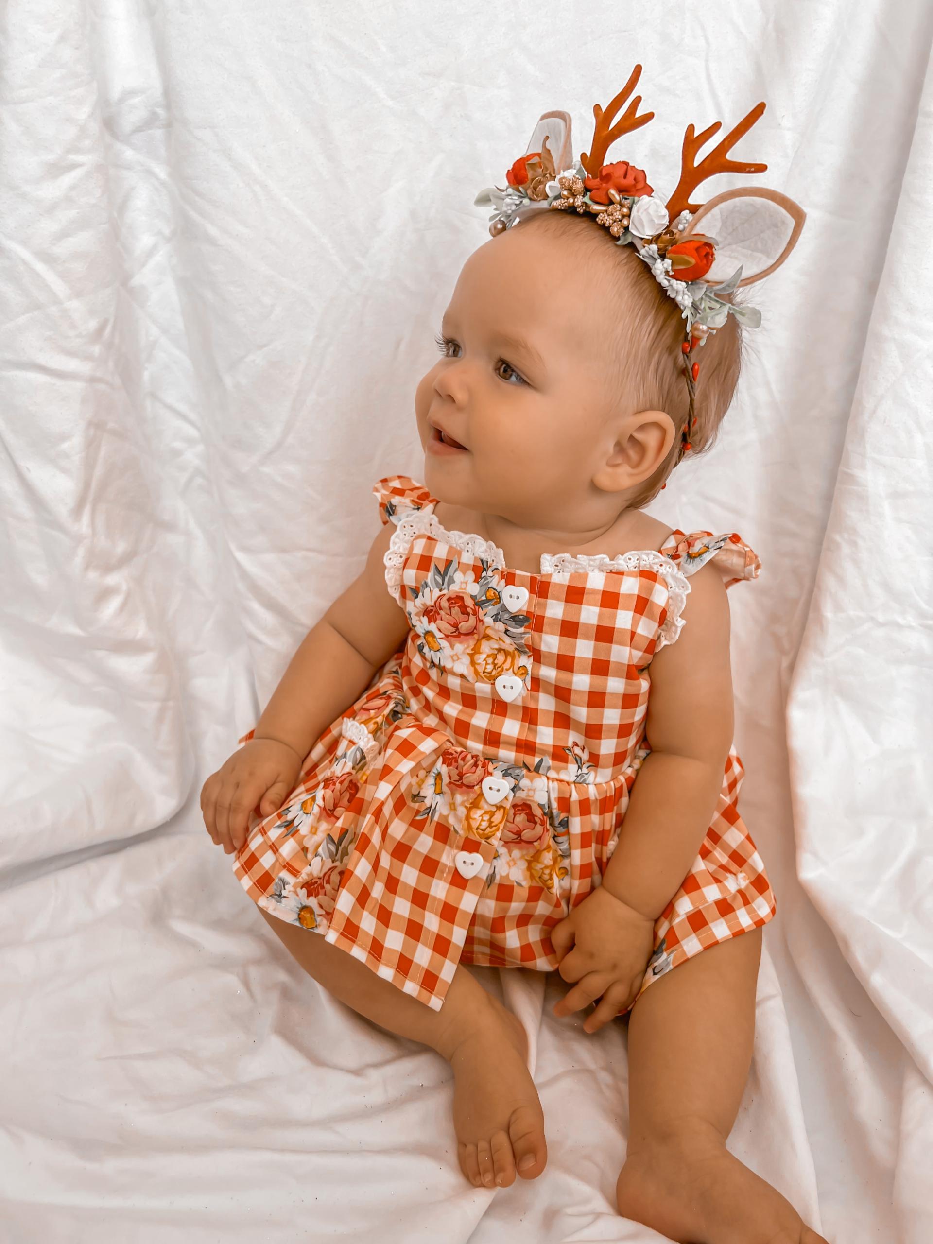 Notre guirlande de Noël rouge Rudolph, ornée de jolies fleurs rouges et de bois de renne, apportera une touche d'originalité à la tenue festive de votre petite fille.