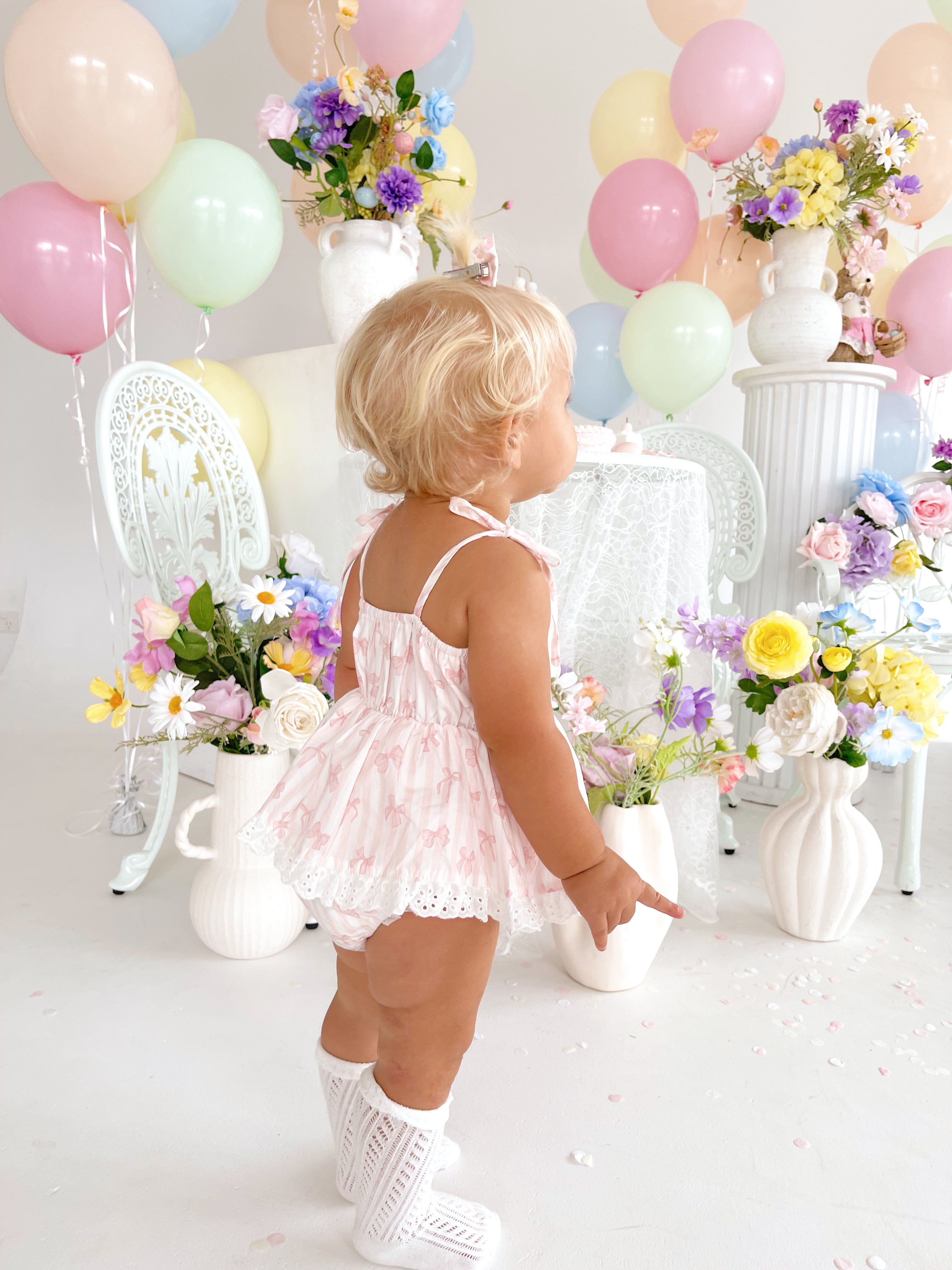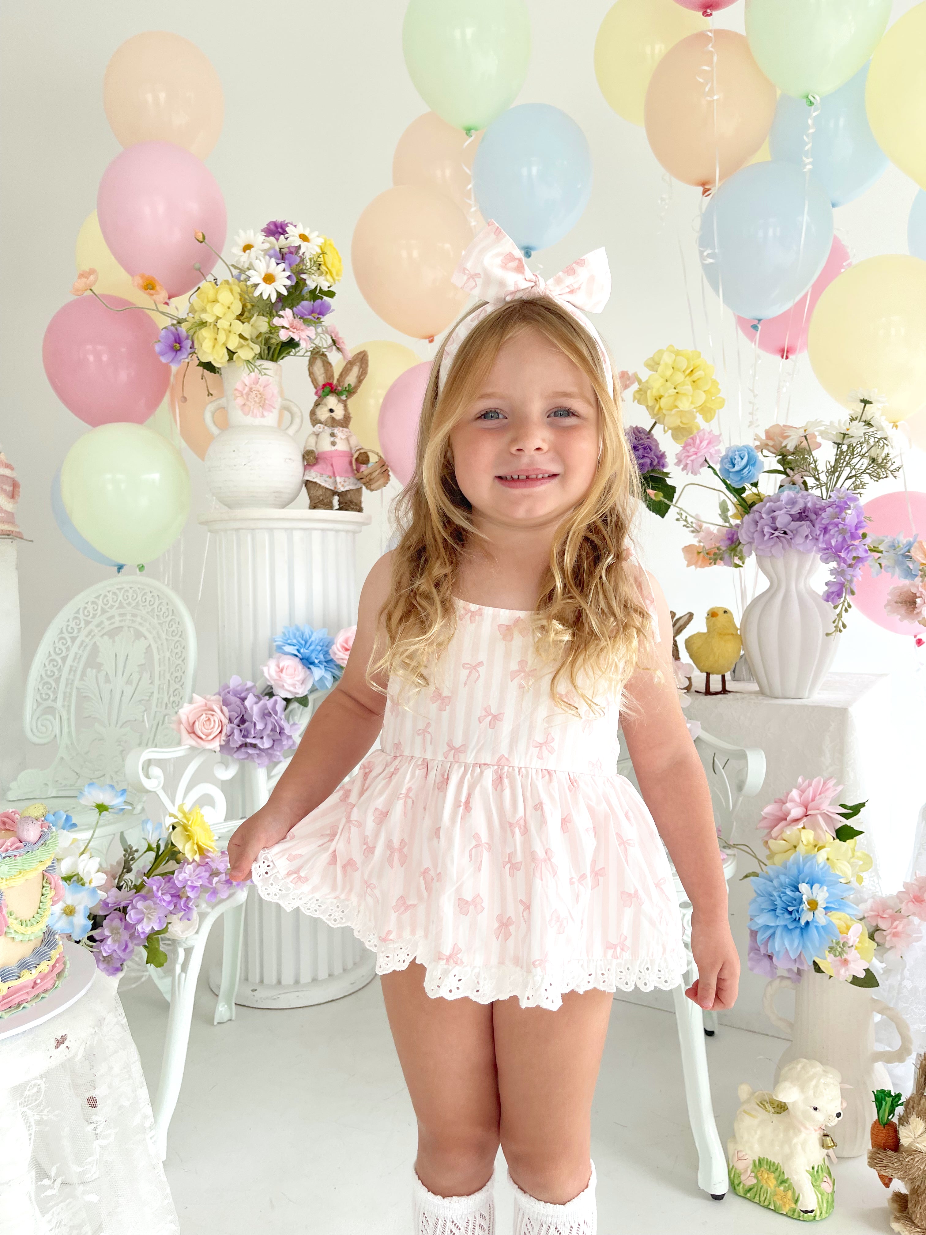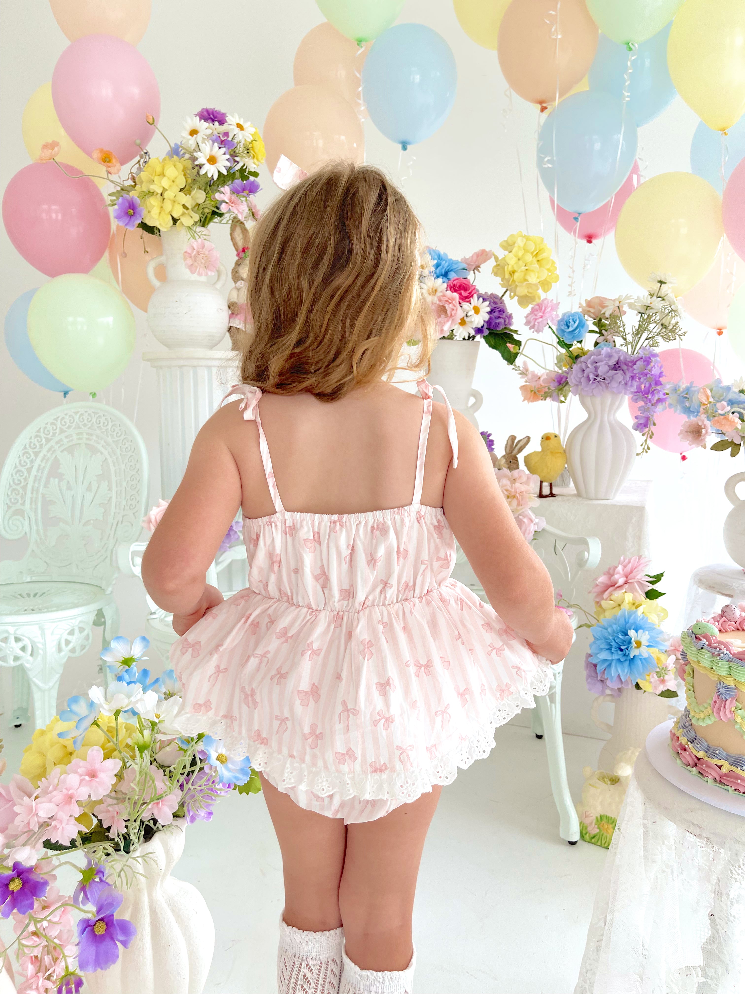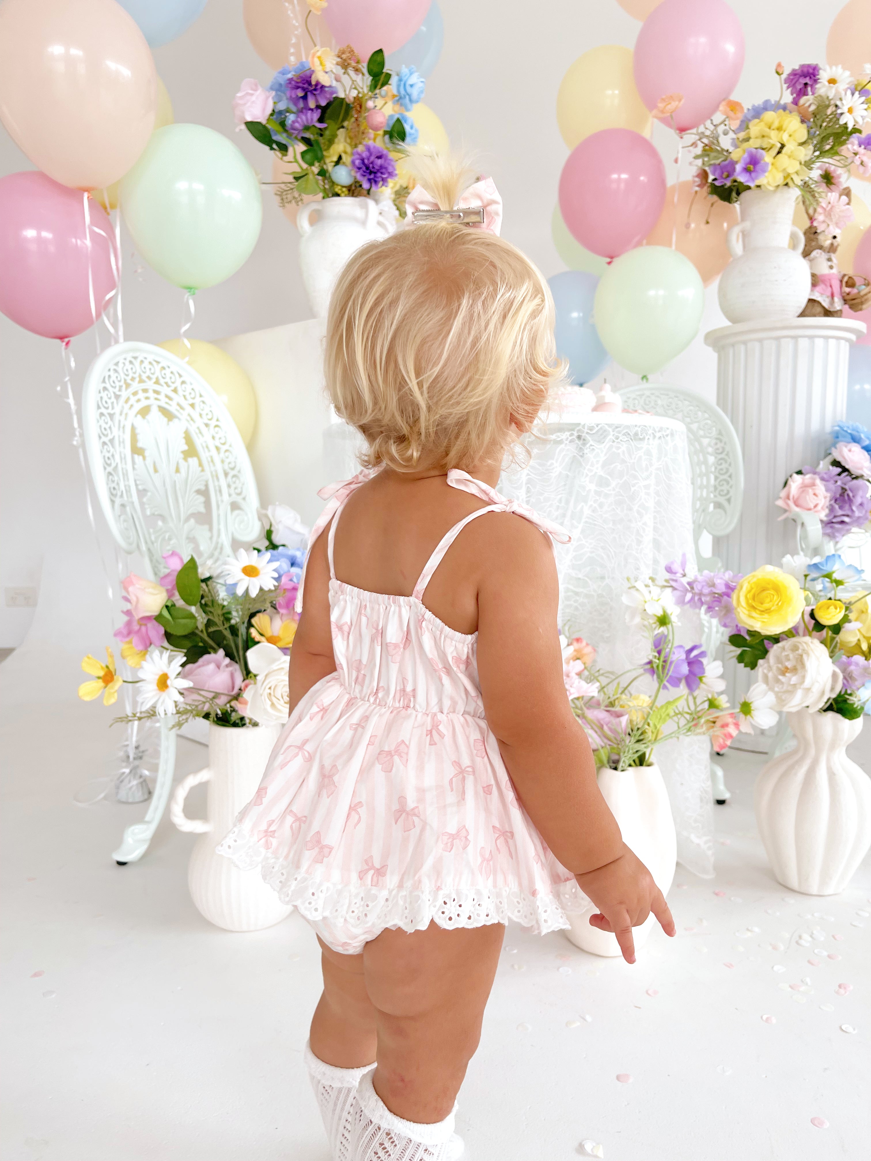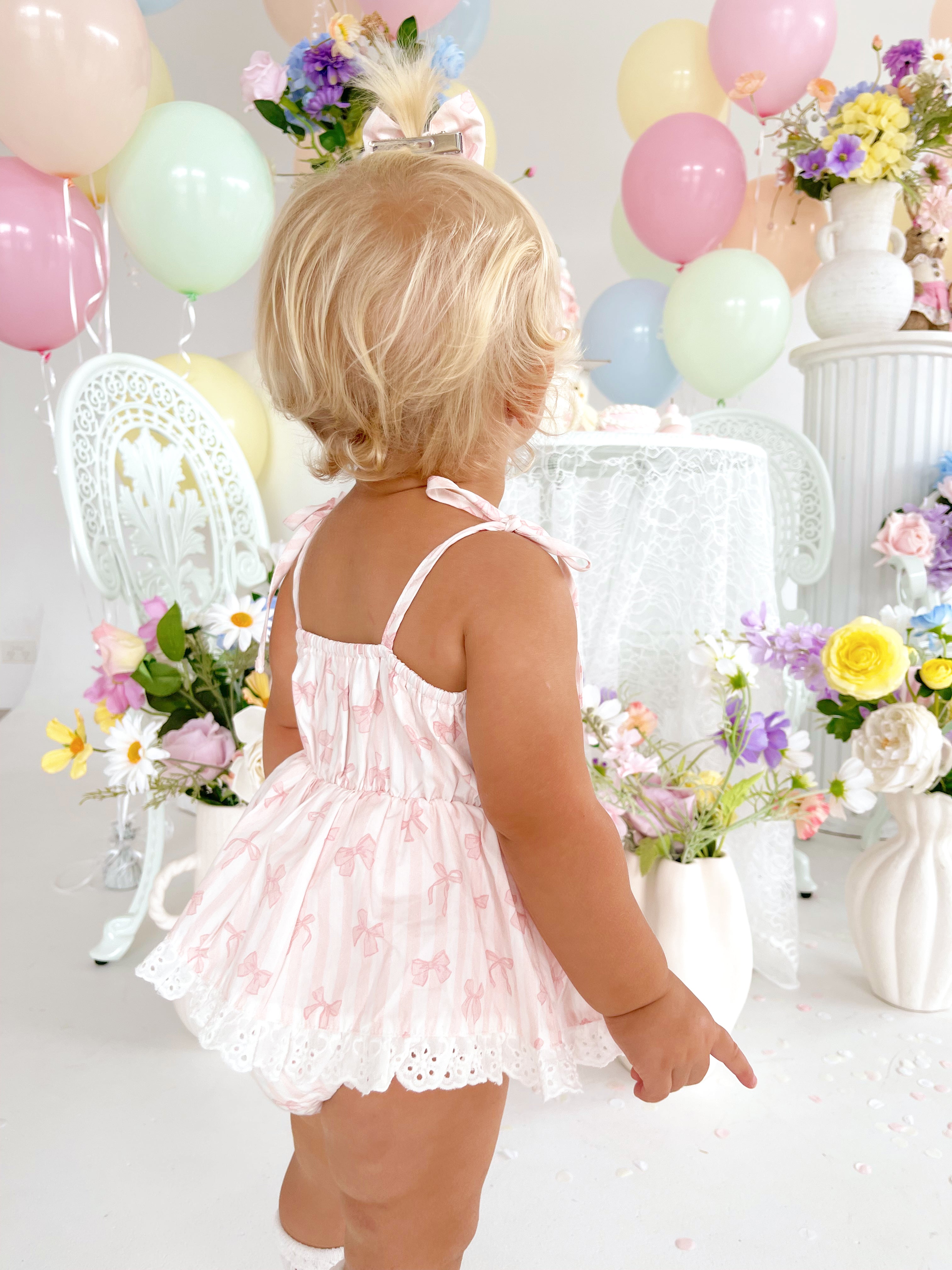Crafted in a sweet light pink stripe and bow print, this romper is a must-have addition to your little girl’s wardrobe! It features a scoop neckline, a peplum-style swing top, and delicate broderie anglaise frill detailing.