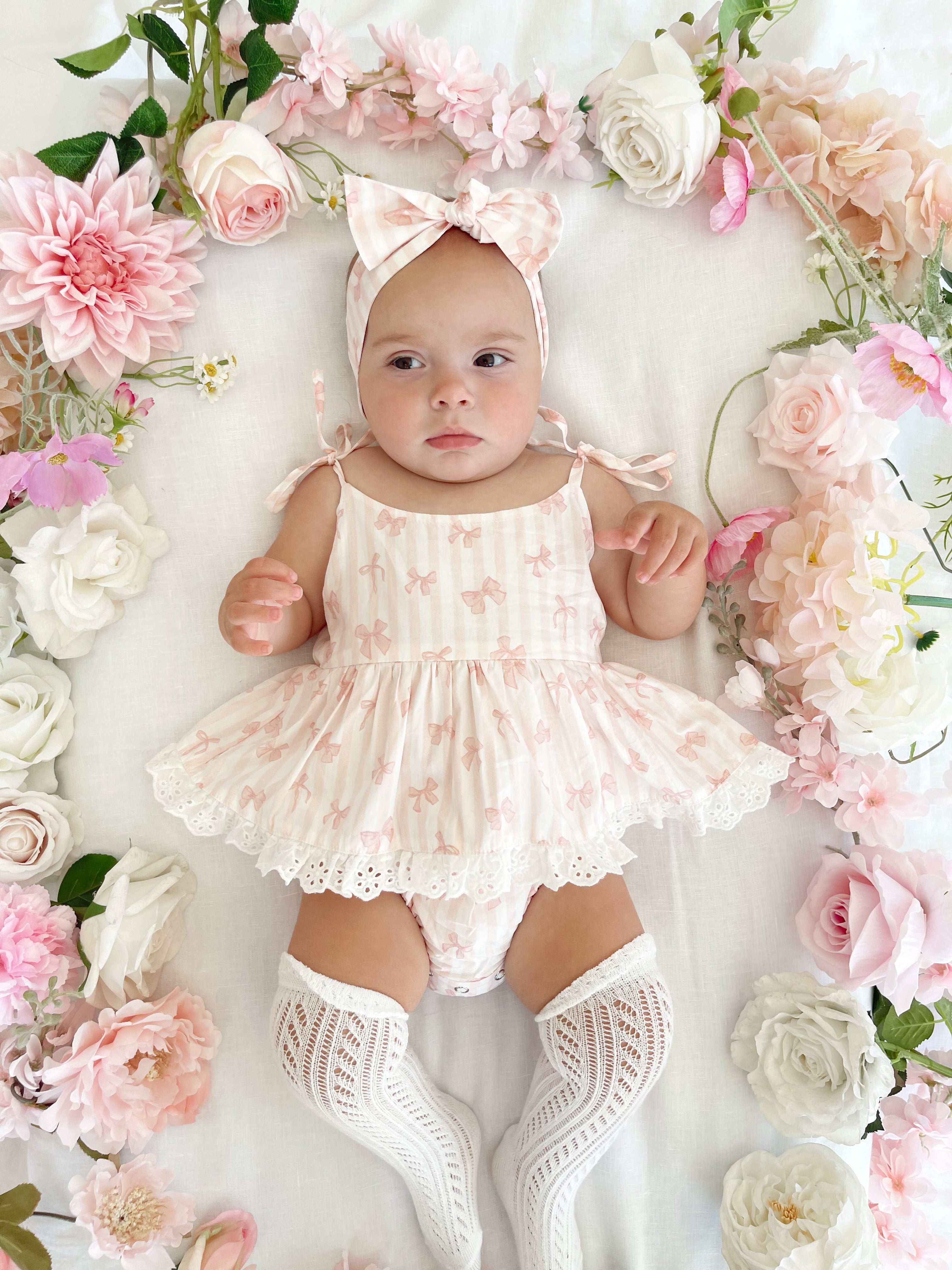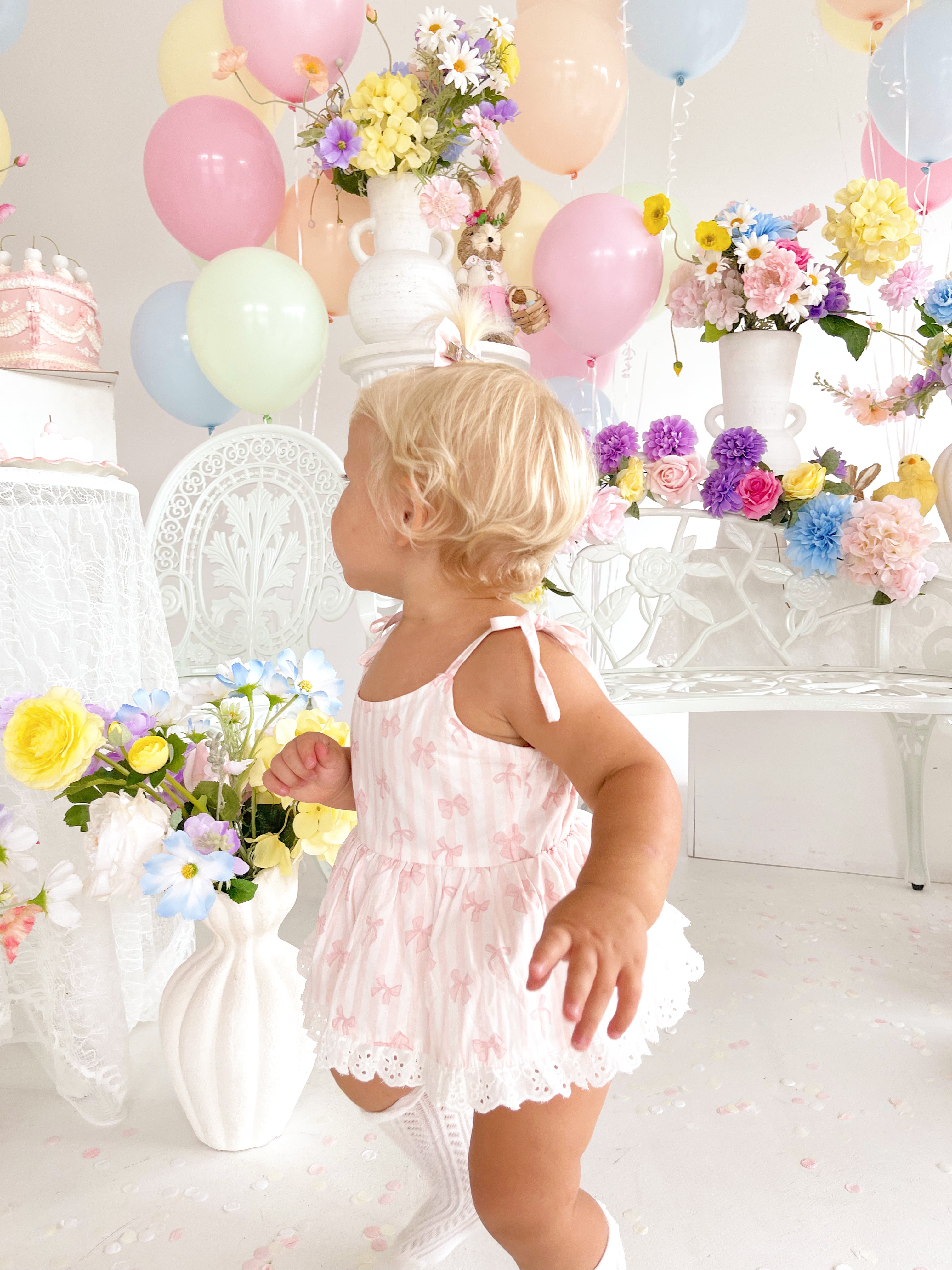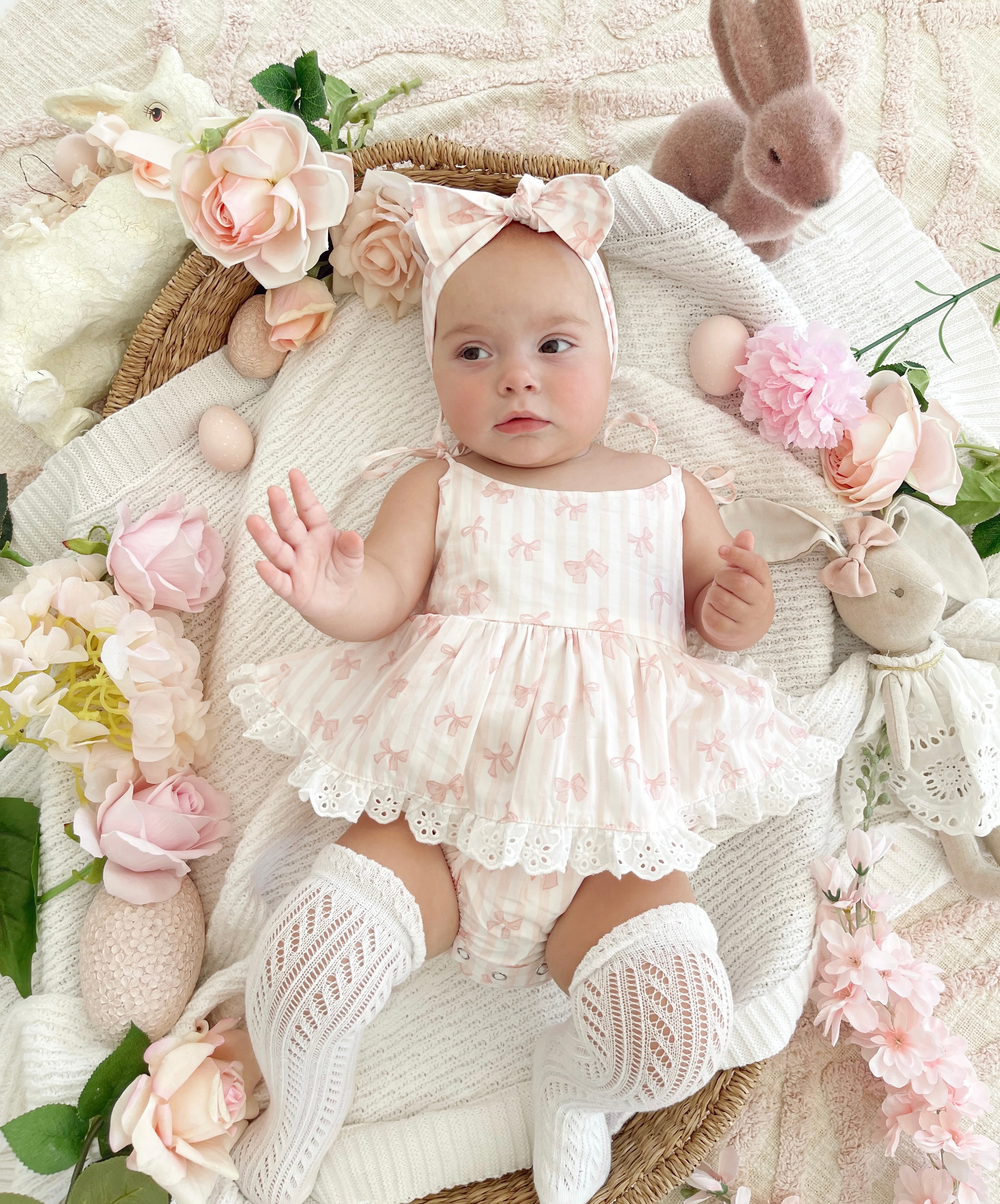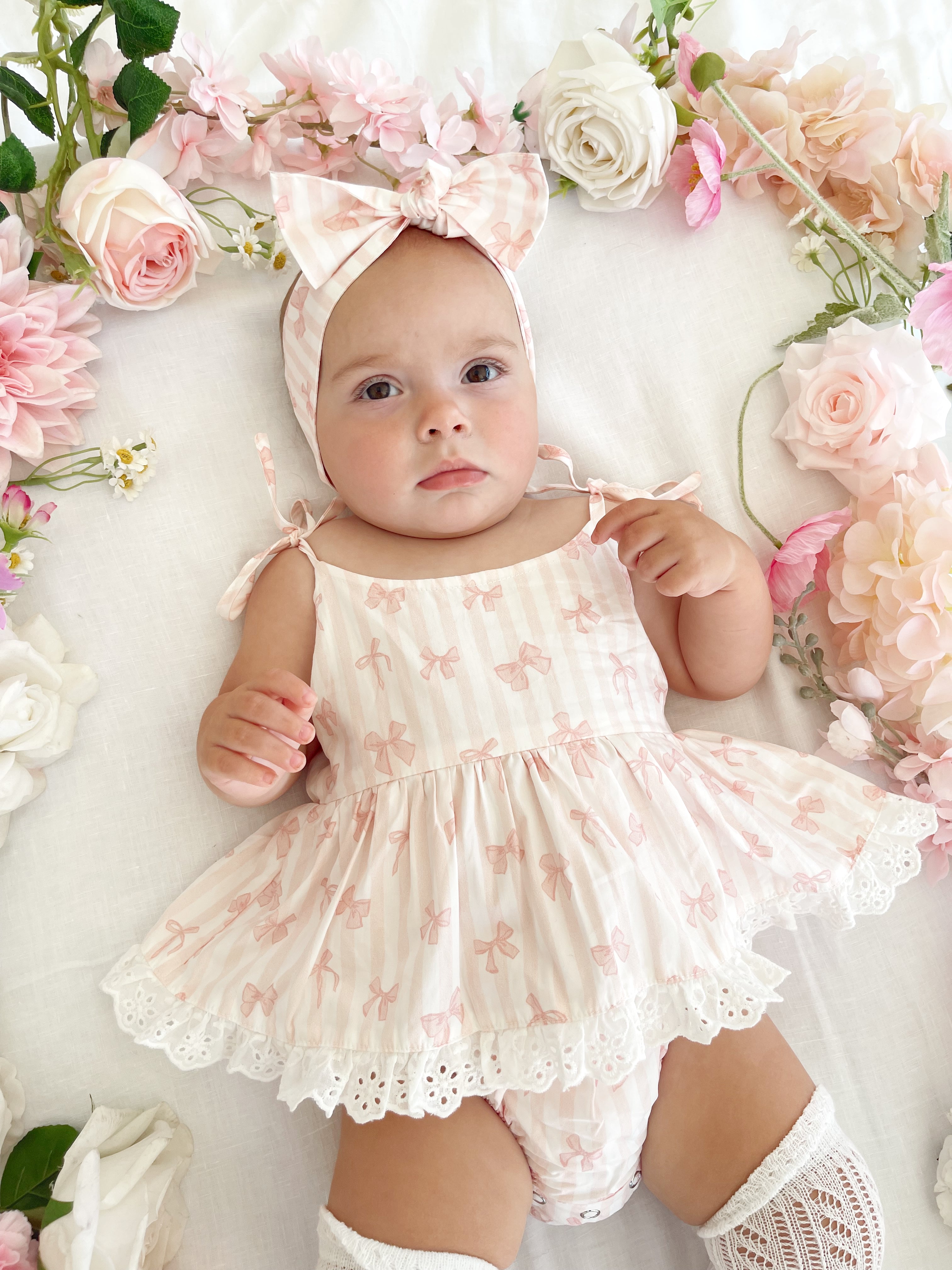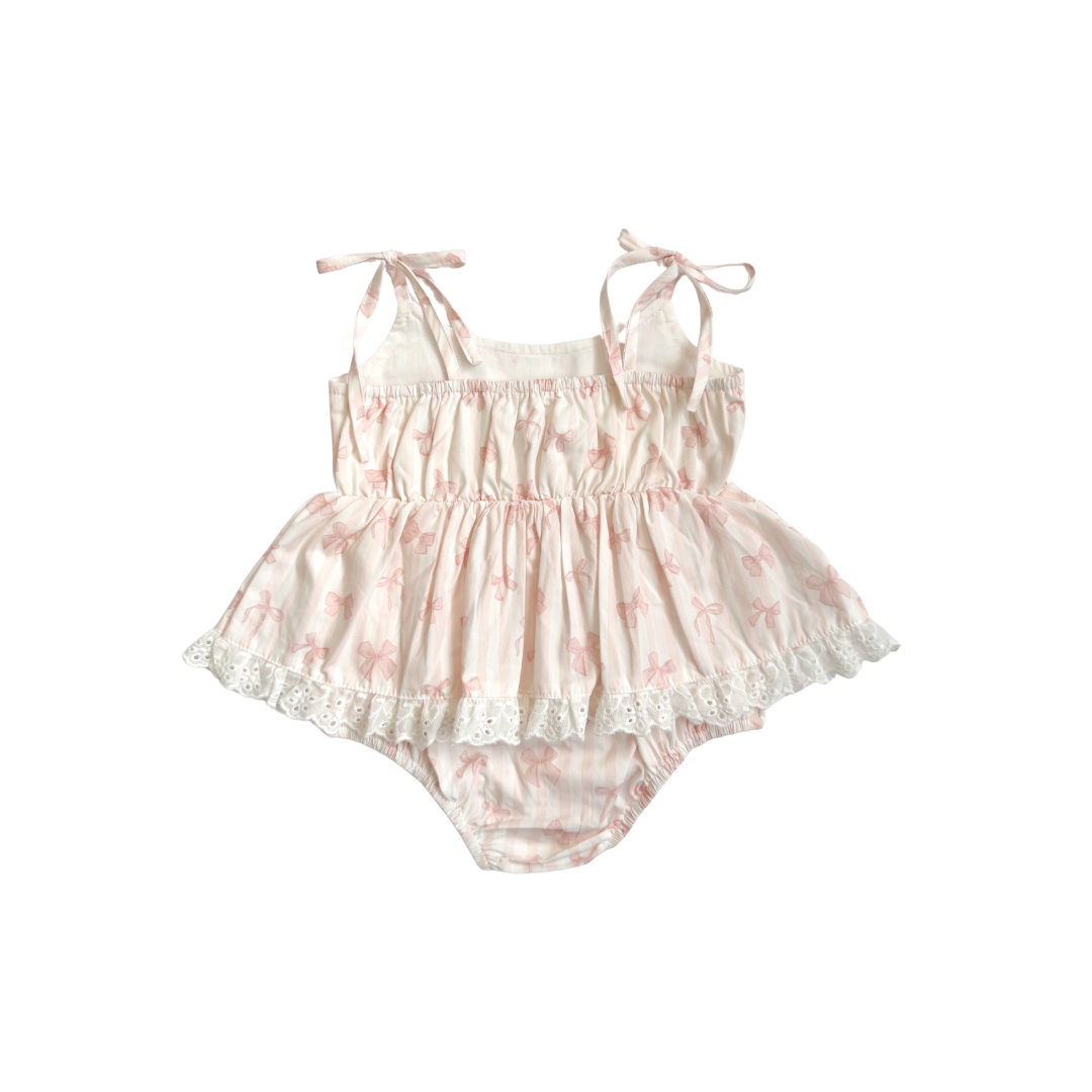 Crafted in a sweet light pink stripe and bow print, this romper is a must-have addition to your little girl’s wardrobe! It features a scoop neckline, a peplum-style swing top, and delicate broderie anglaise frill detailing.