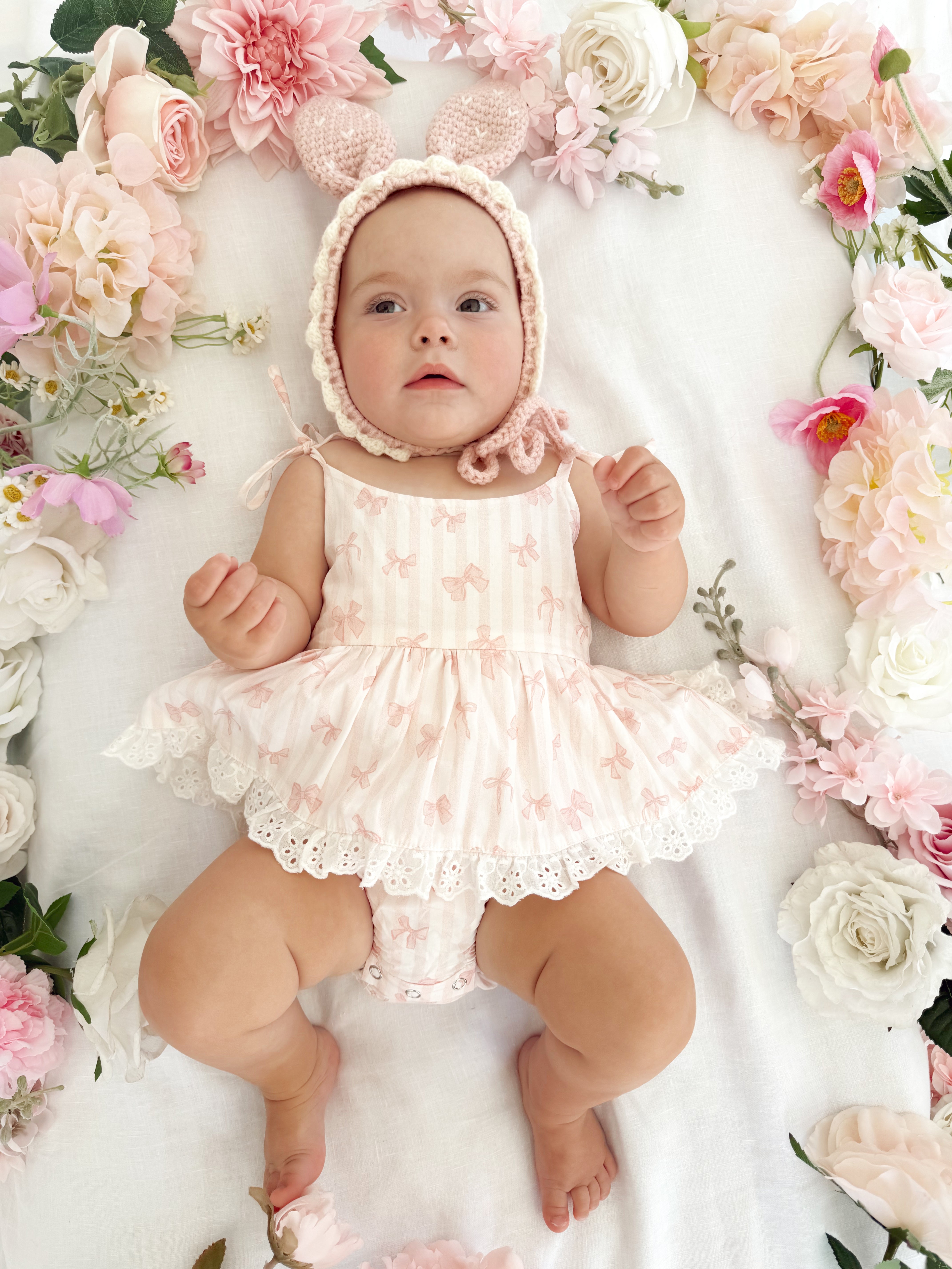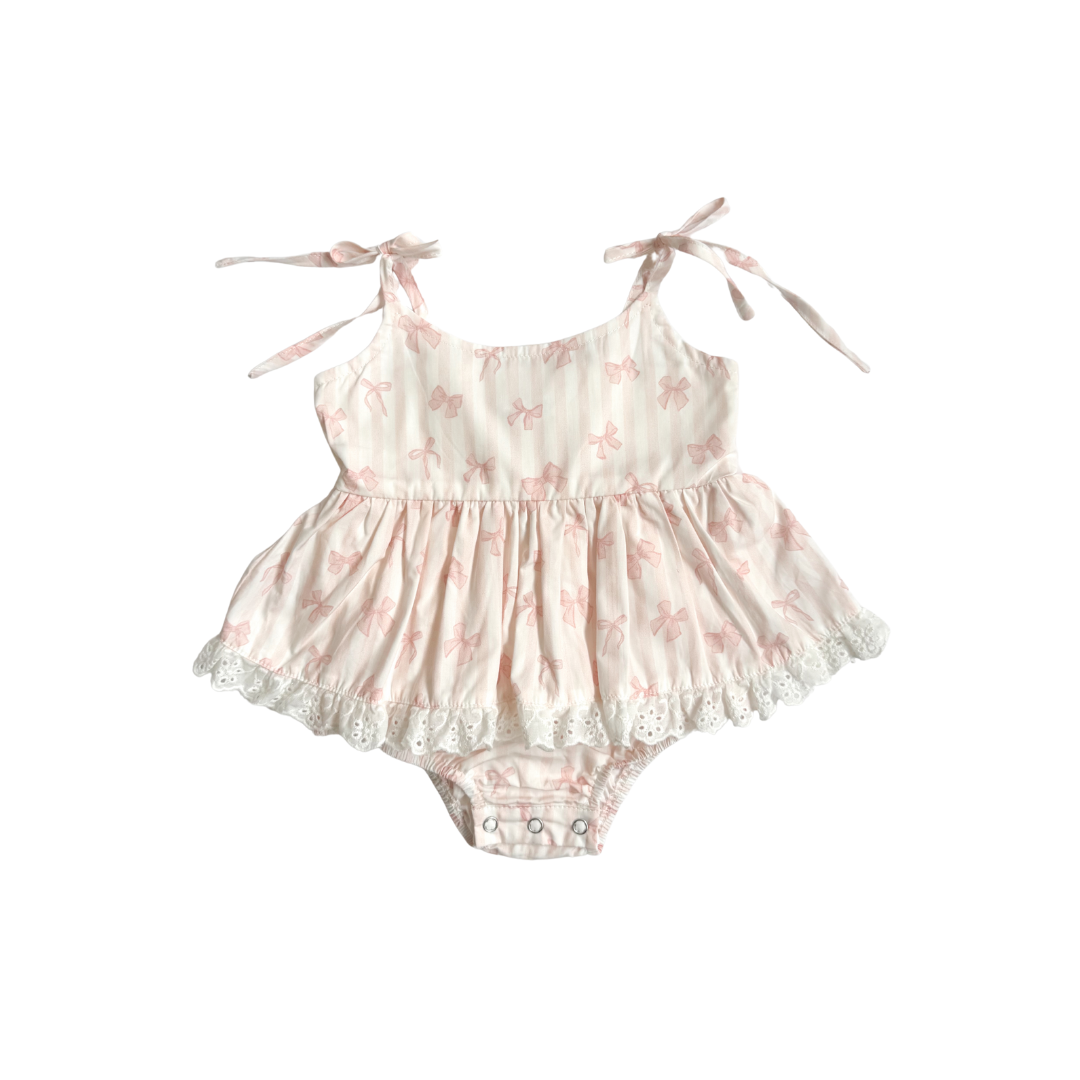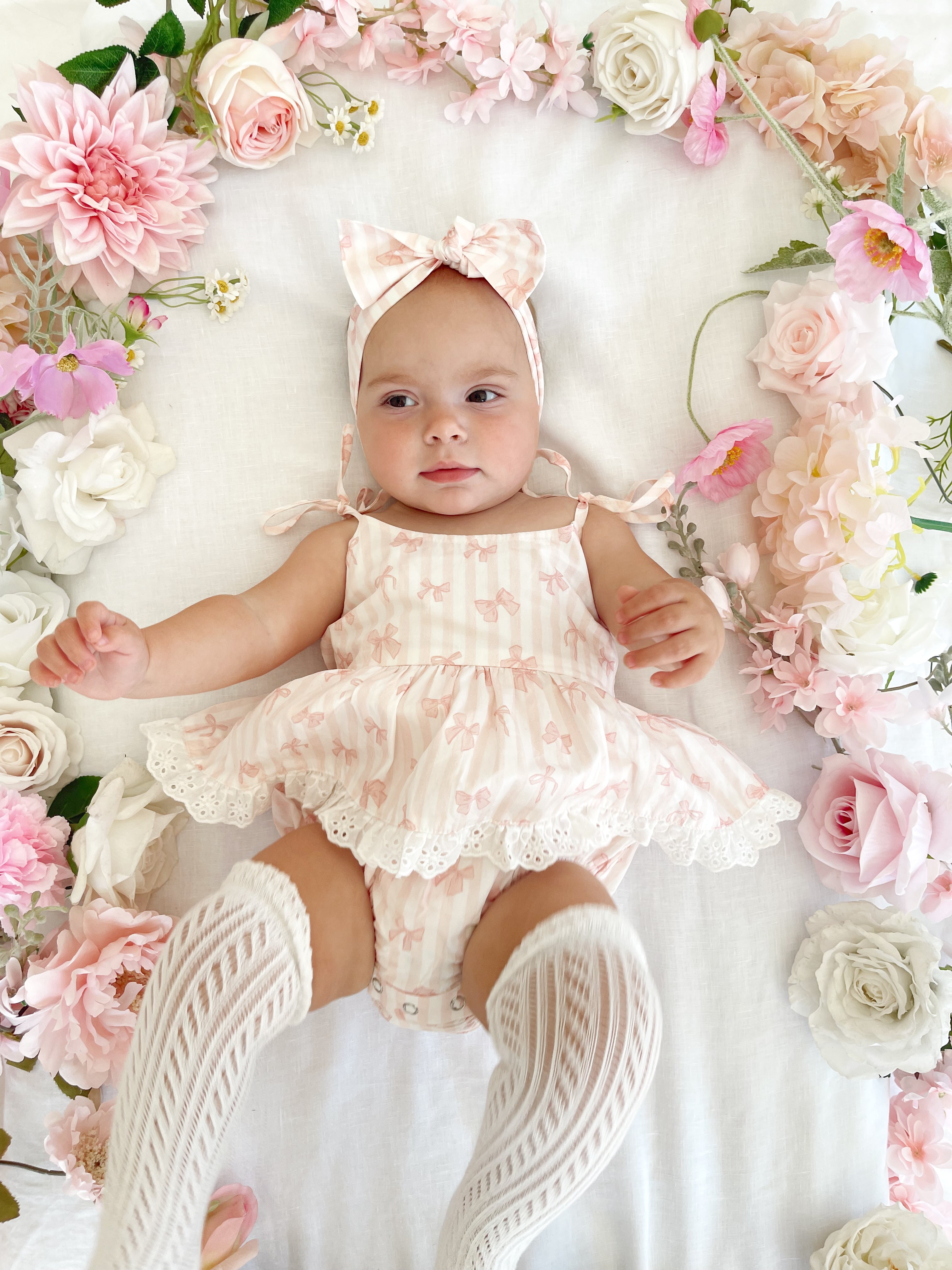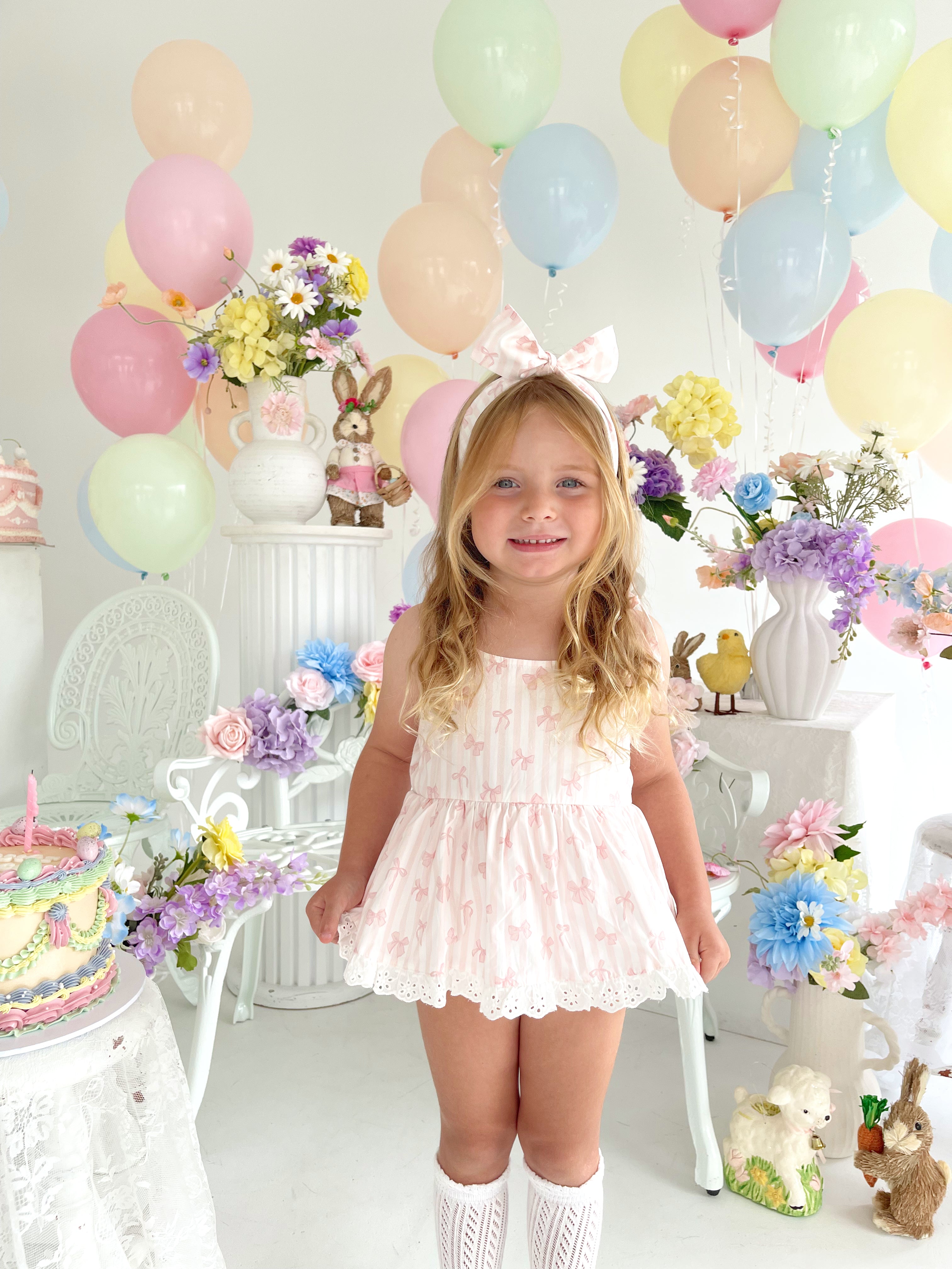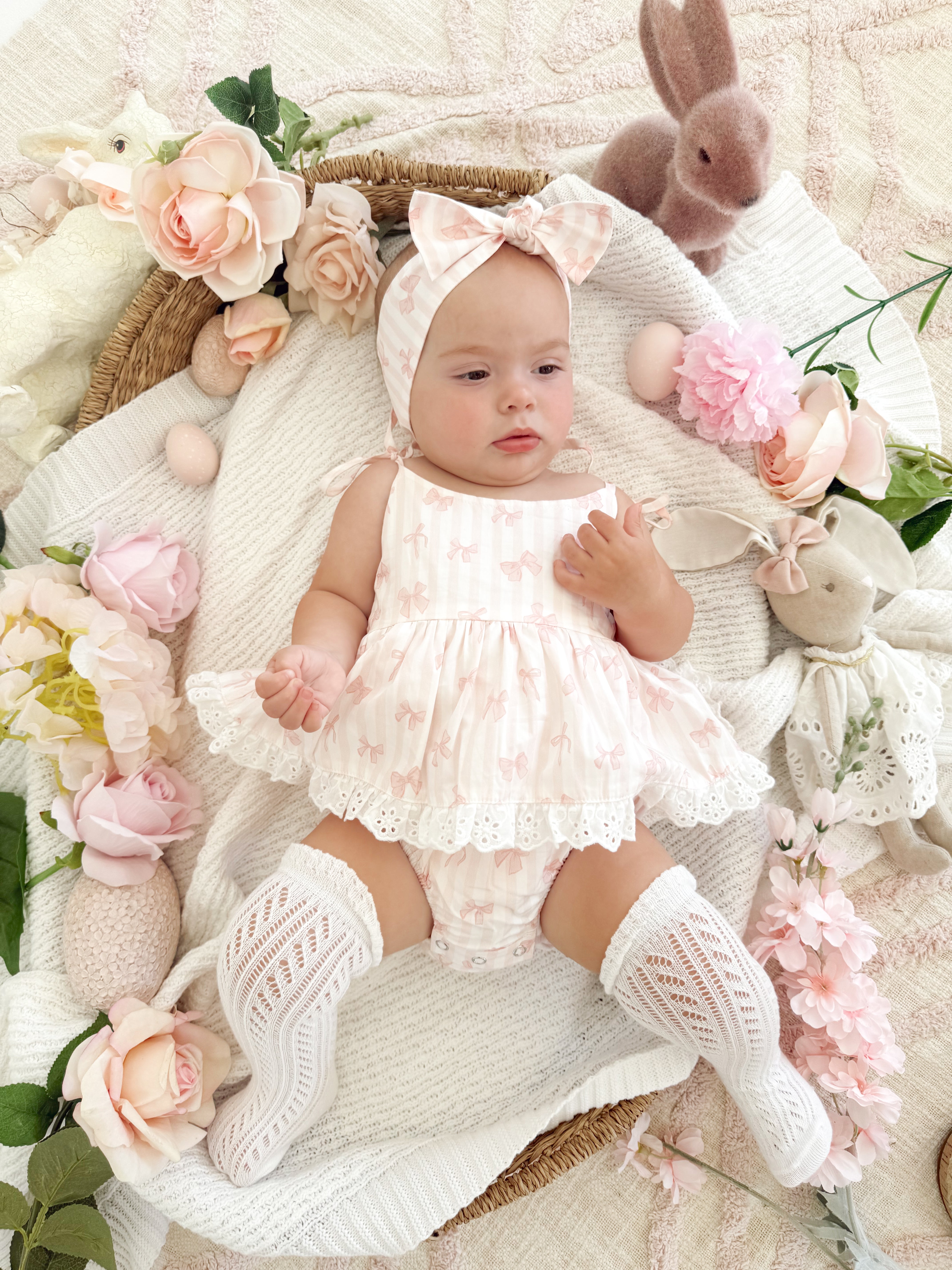 Crafted in a sweet light pink stripe and bow print, this romper is a must-have addition to your little girl’s wardrobe! It features a scoop neckline, a peplum-style swing top, and delicate broderie anglaise frill detailing.