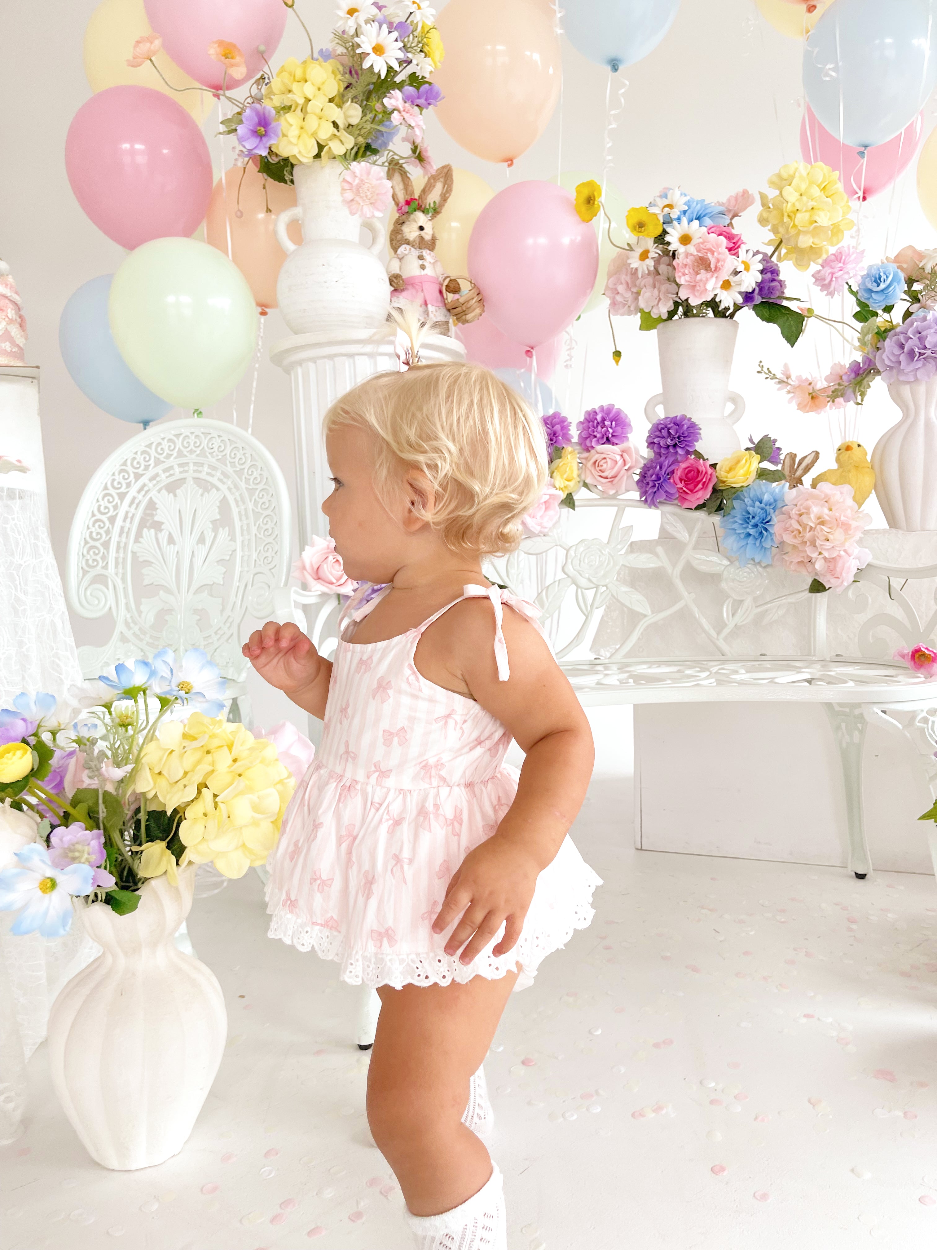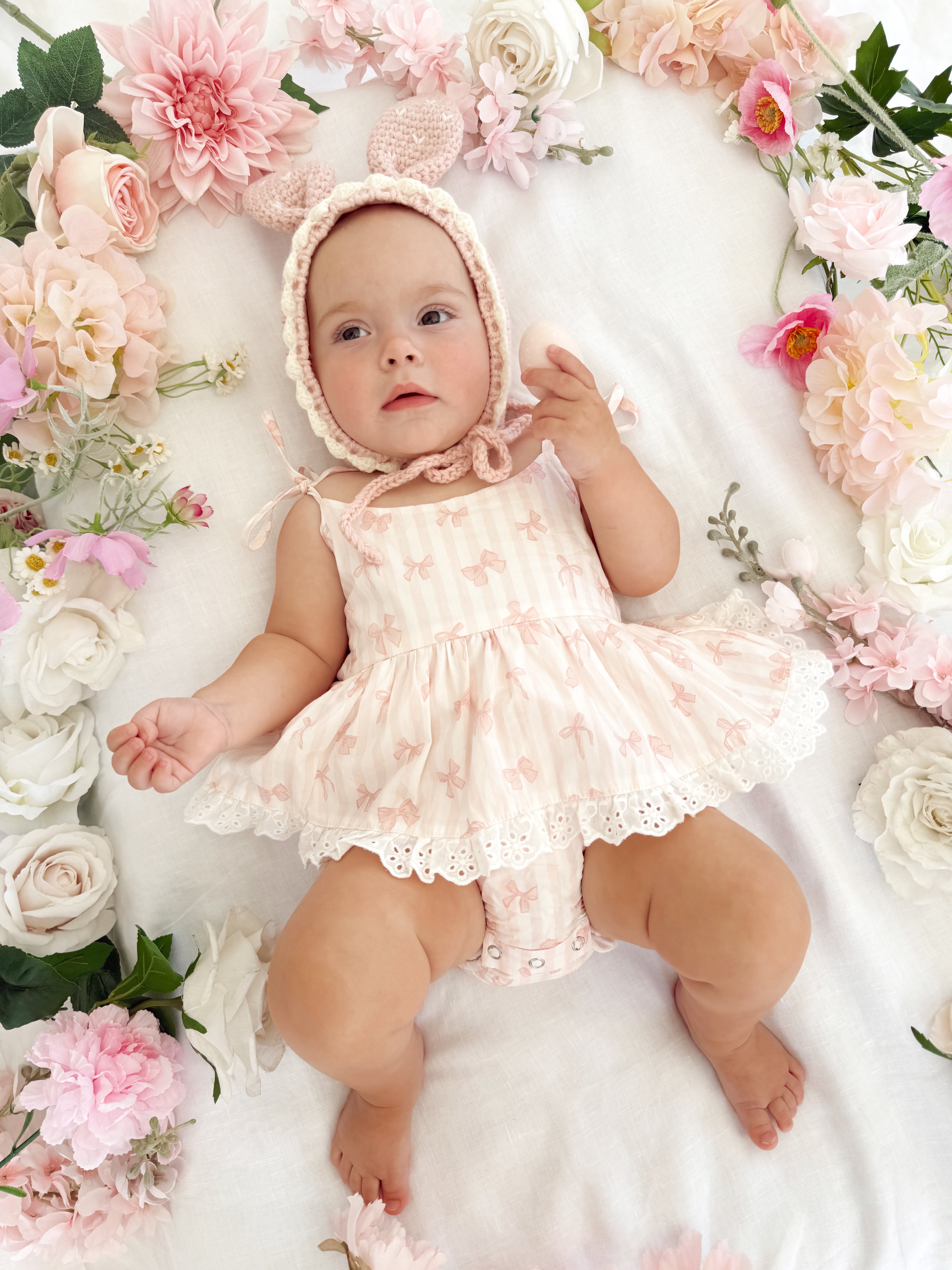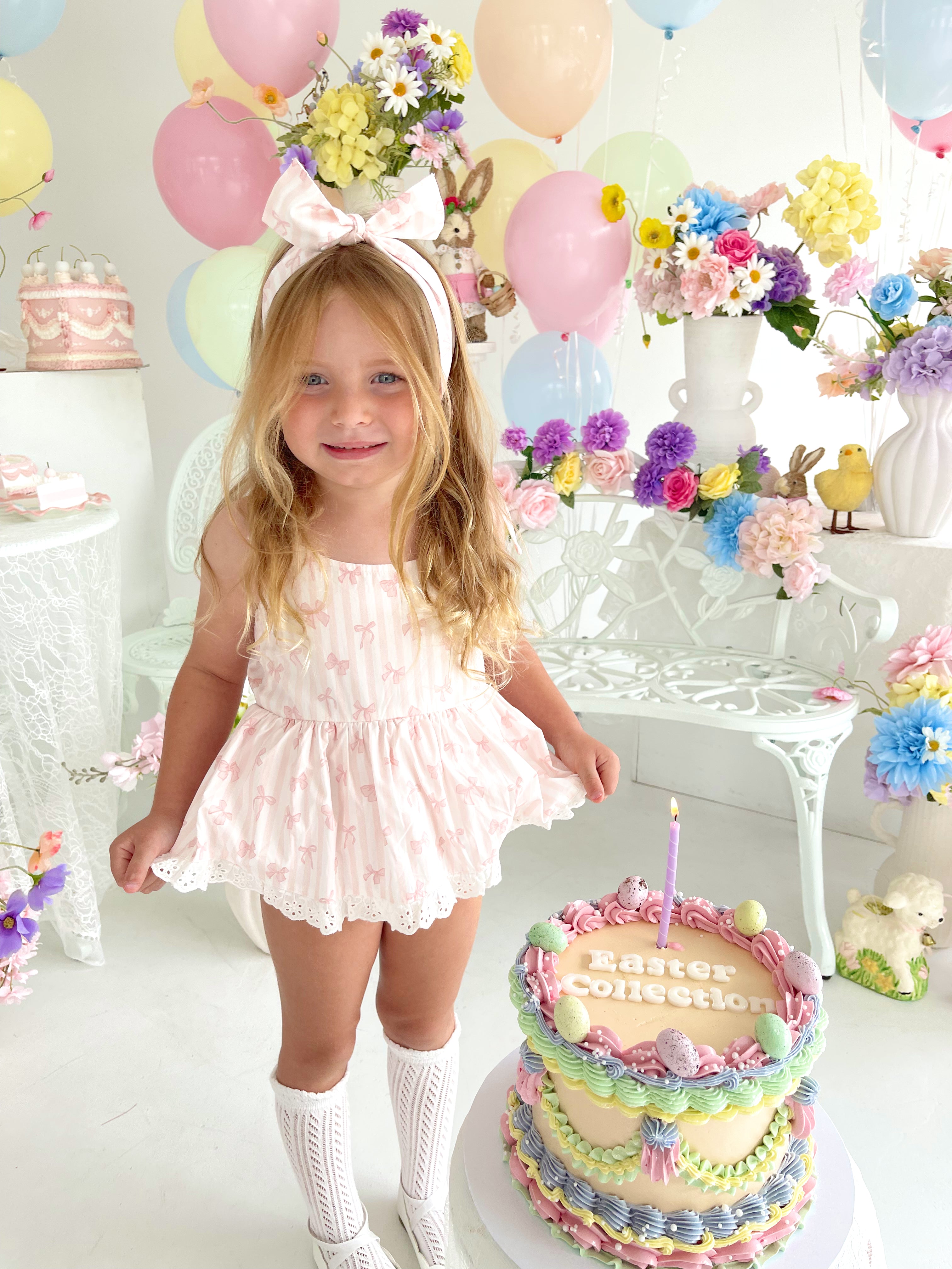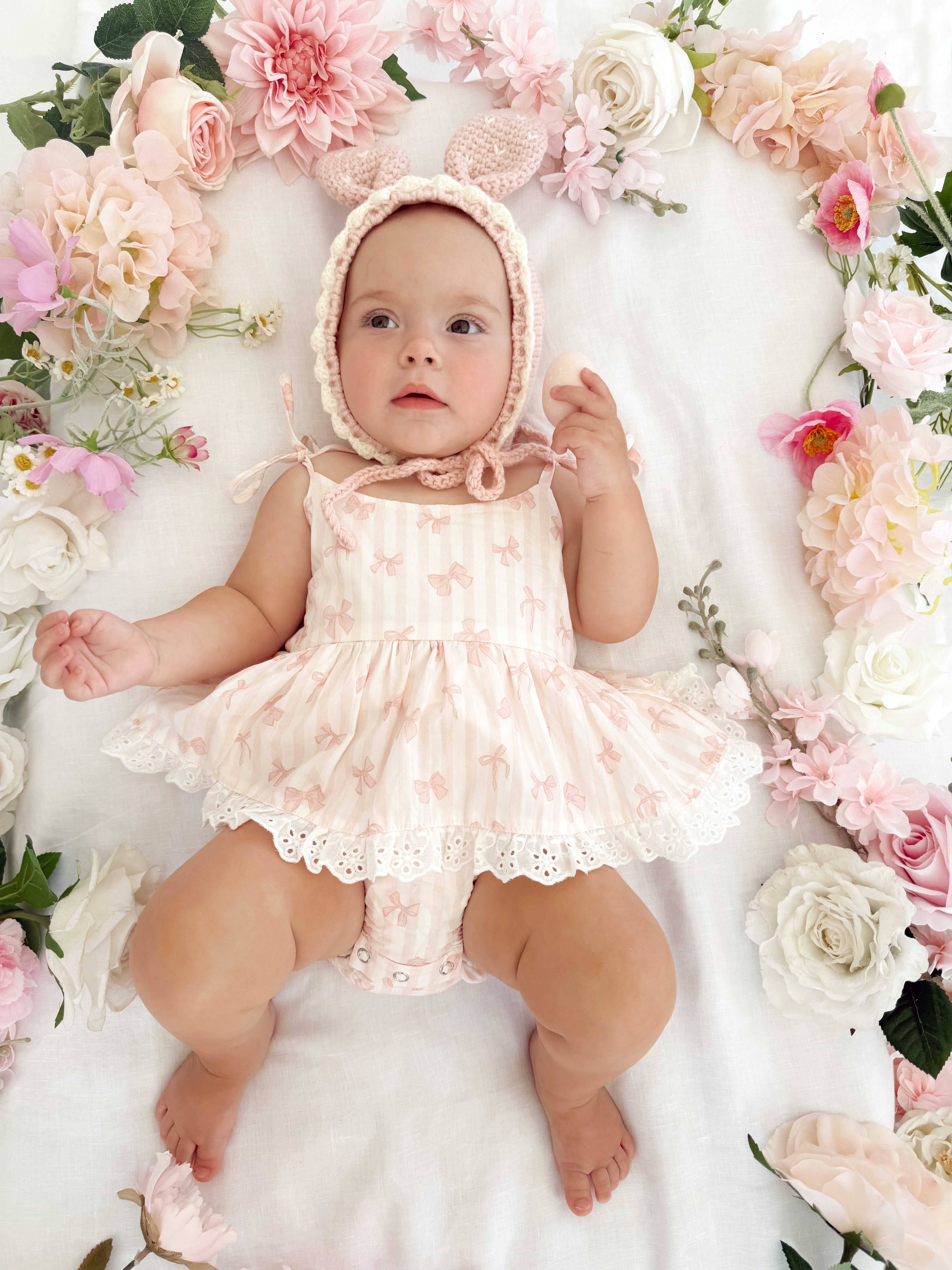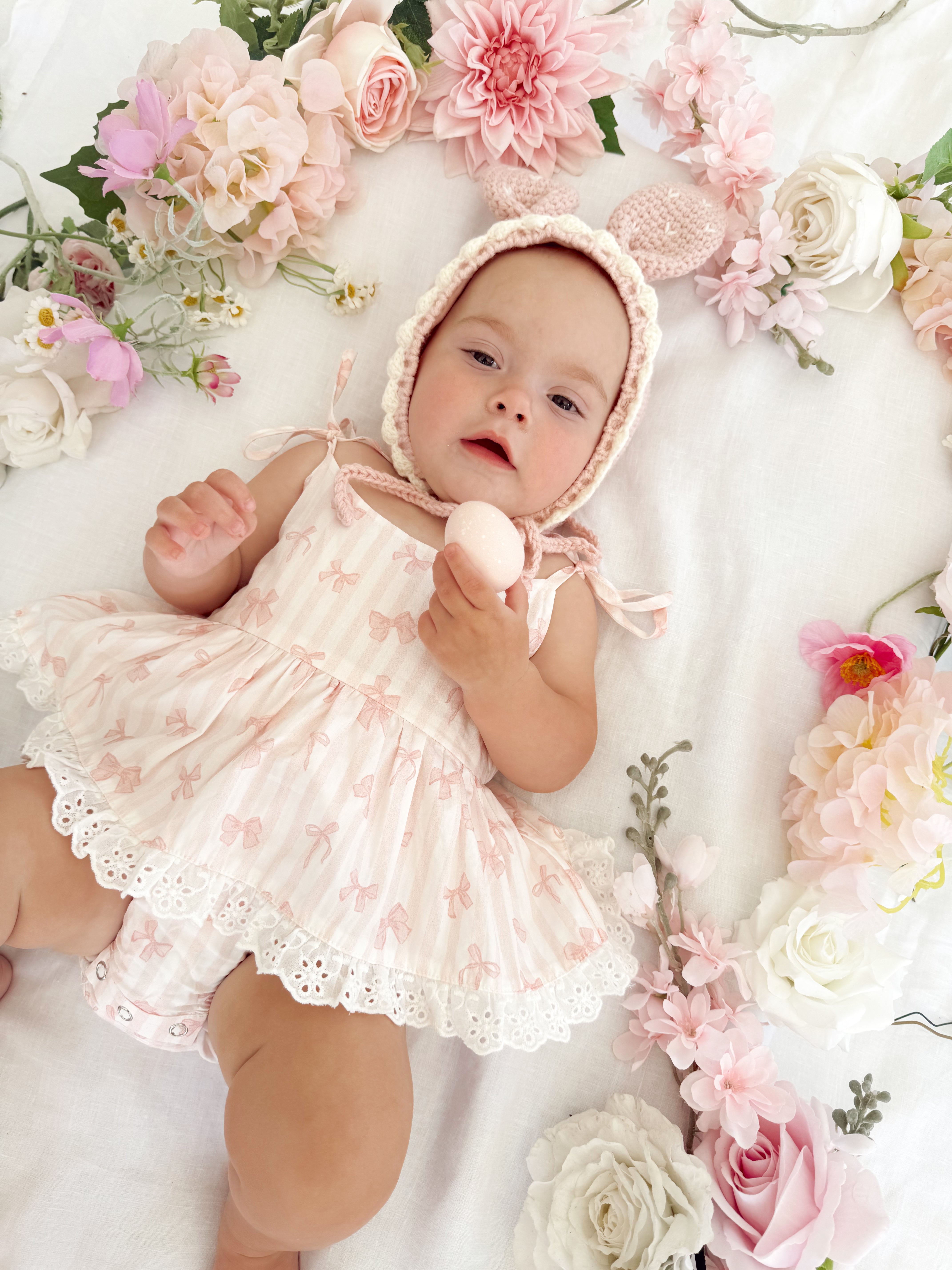 Crafted in a sweet light pink stripe and bow print, this romper is a must-have addition to your little girl’s wardrobe! It features a scoop neckline, a peplum-style swing top, and delicate broderie anglaise frill detailing.