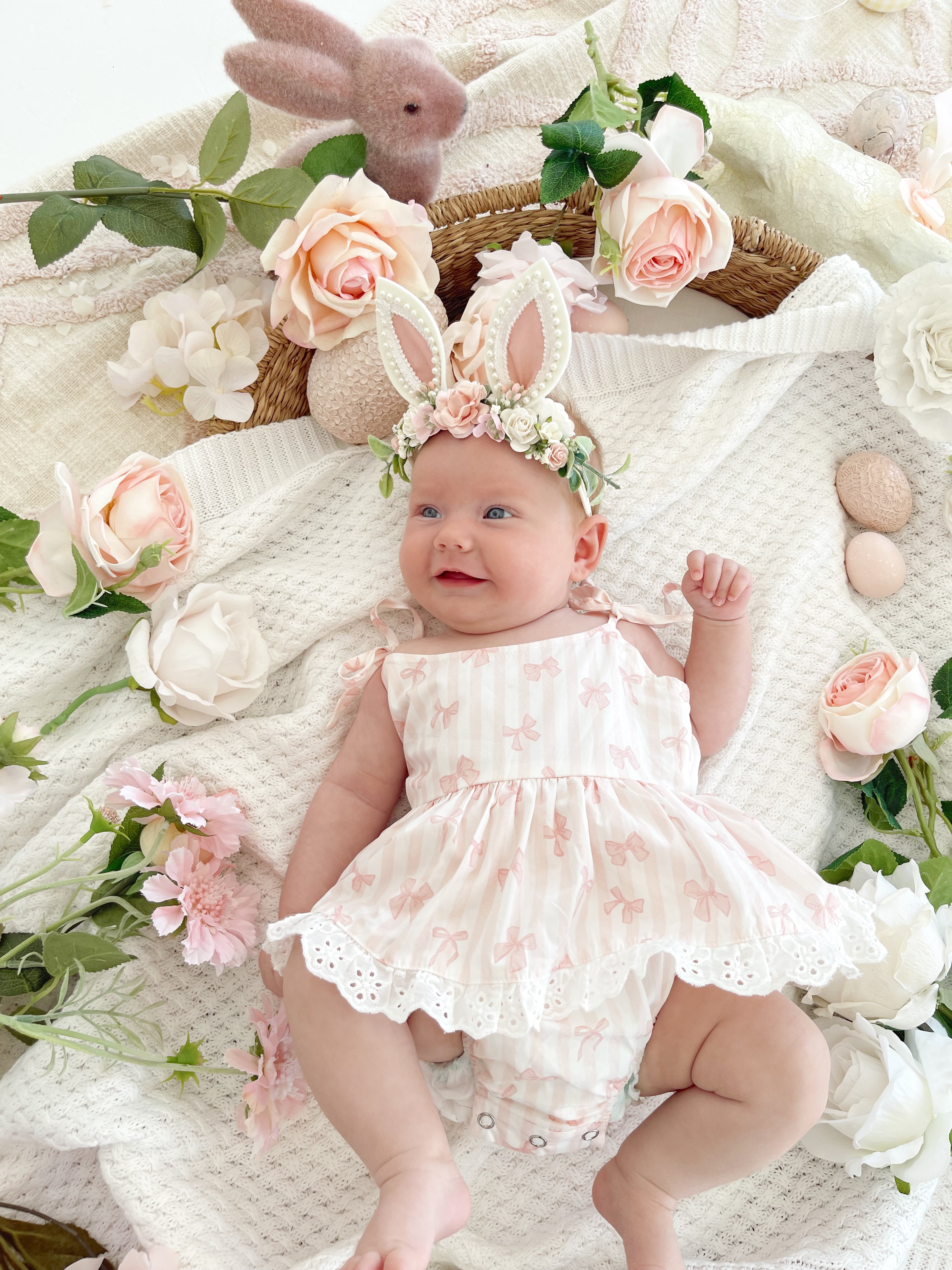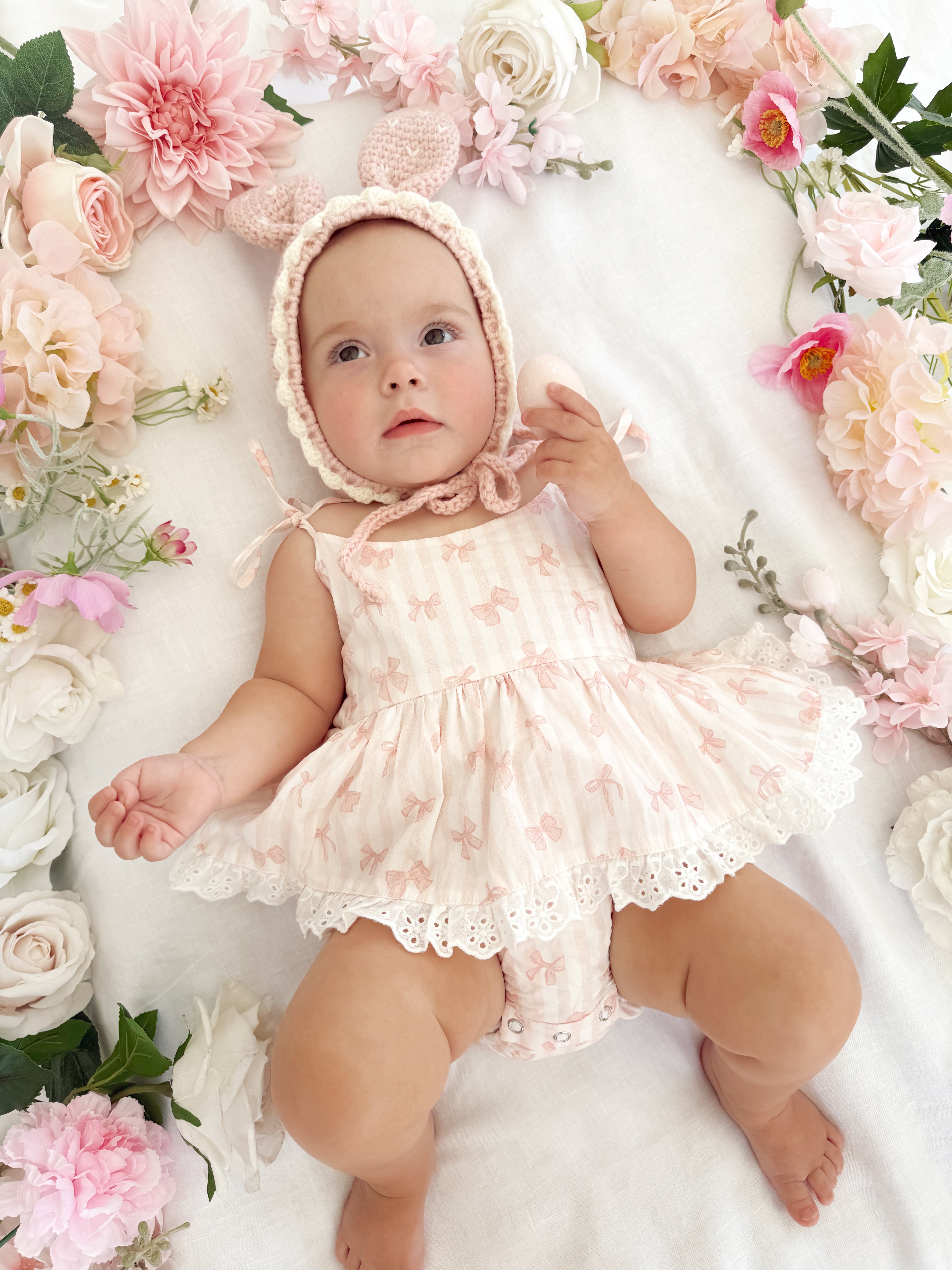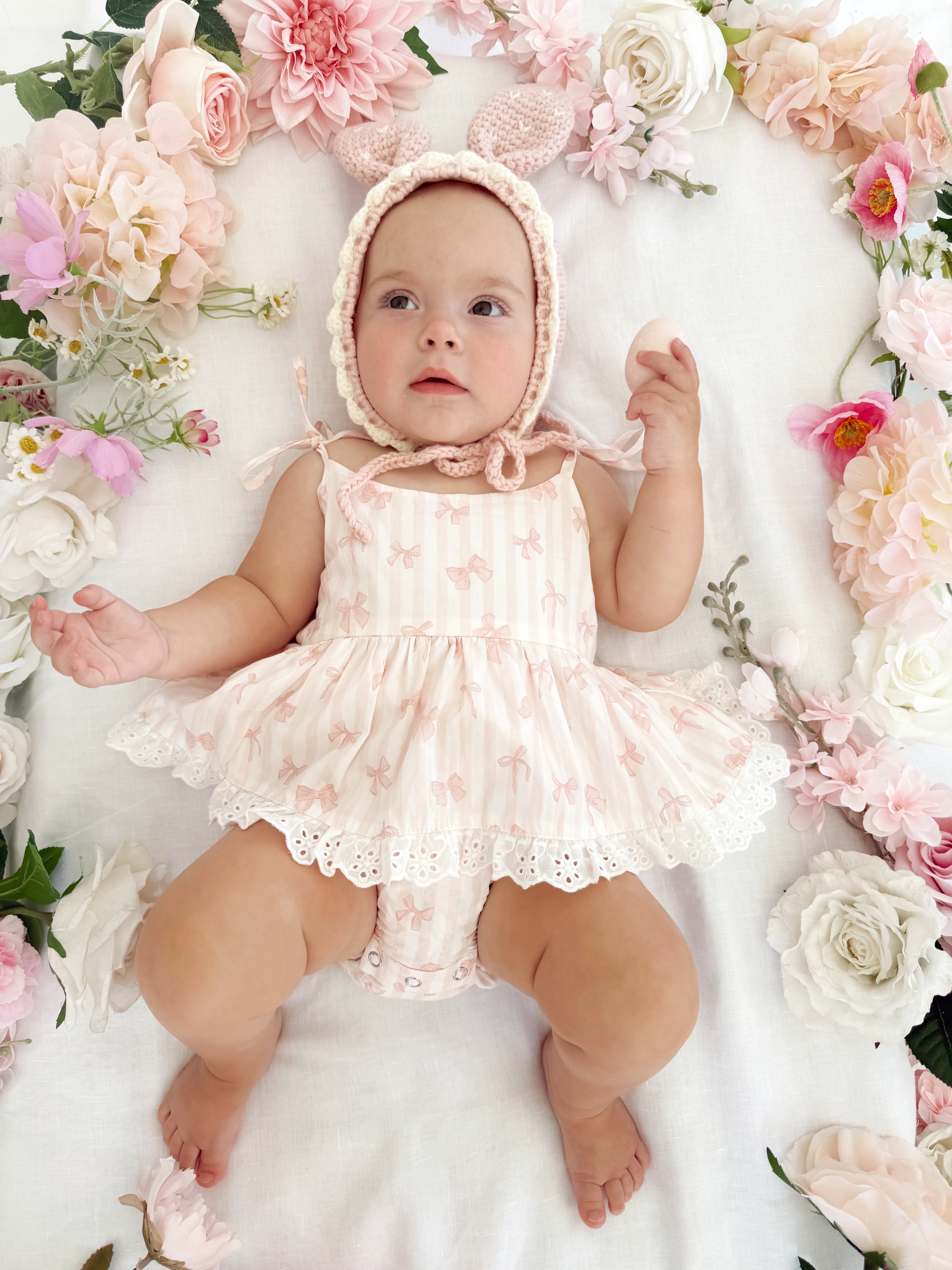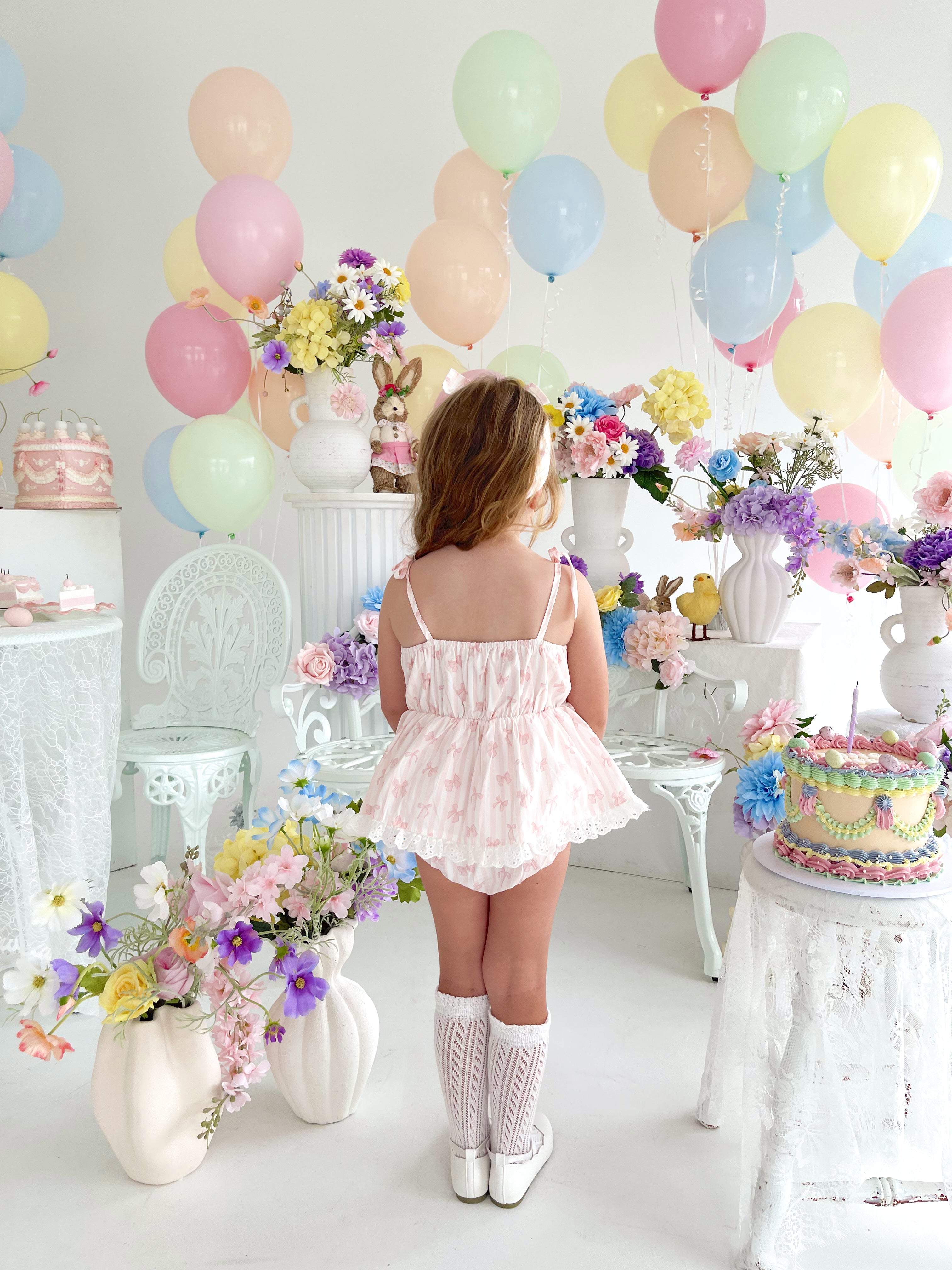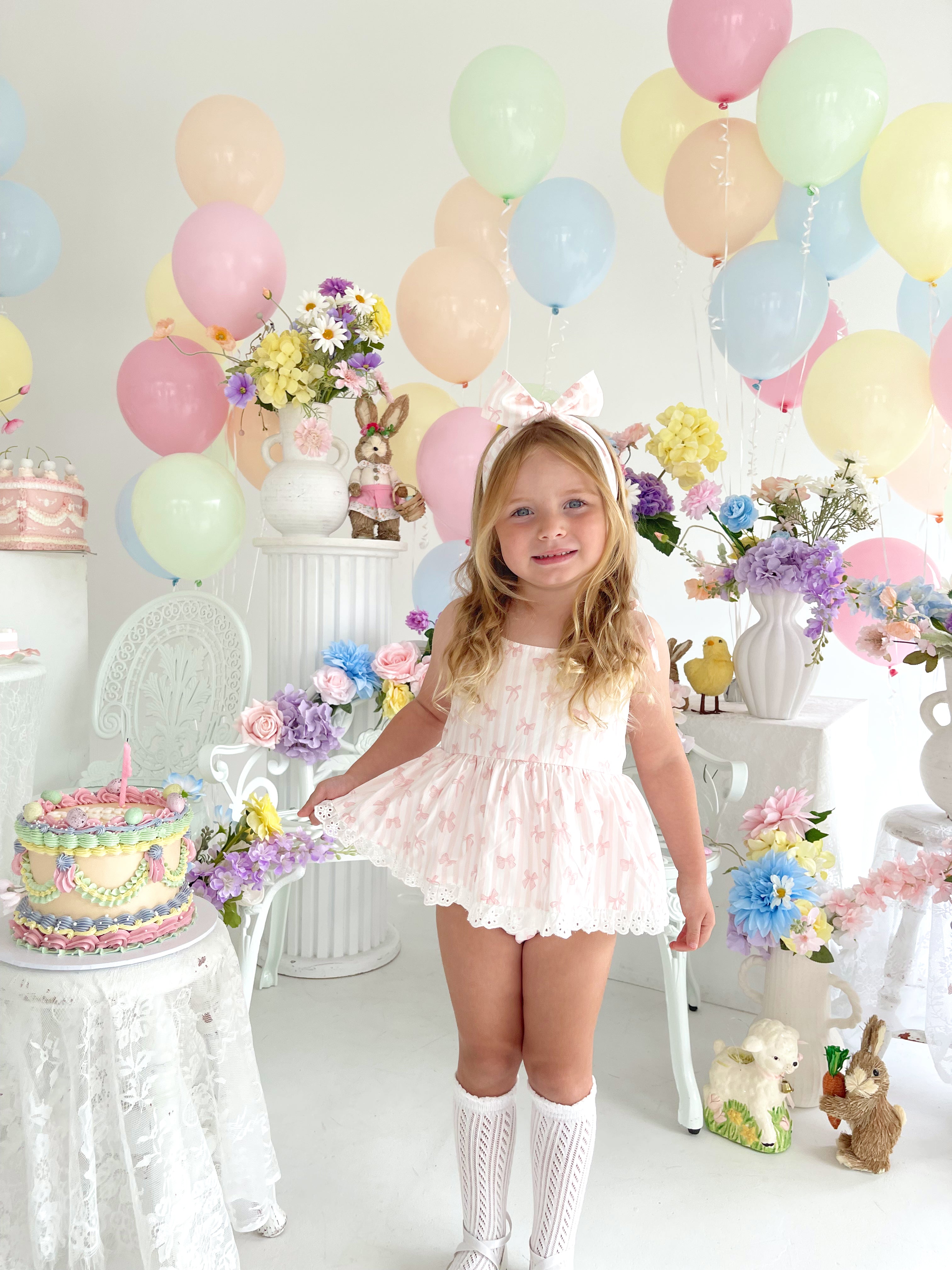 Crafted in a sweet light pink stripe and bow print, this romper is a must-have addition to your little girl’s wardrobe! It features a scoop neckline, a peplum-style swing top, and delicate broderie anglaise frill detailing.