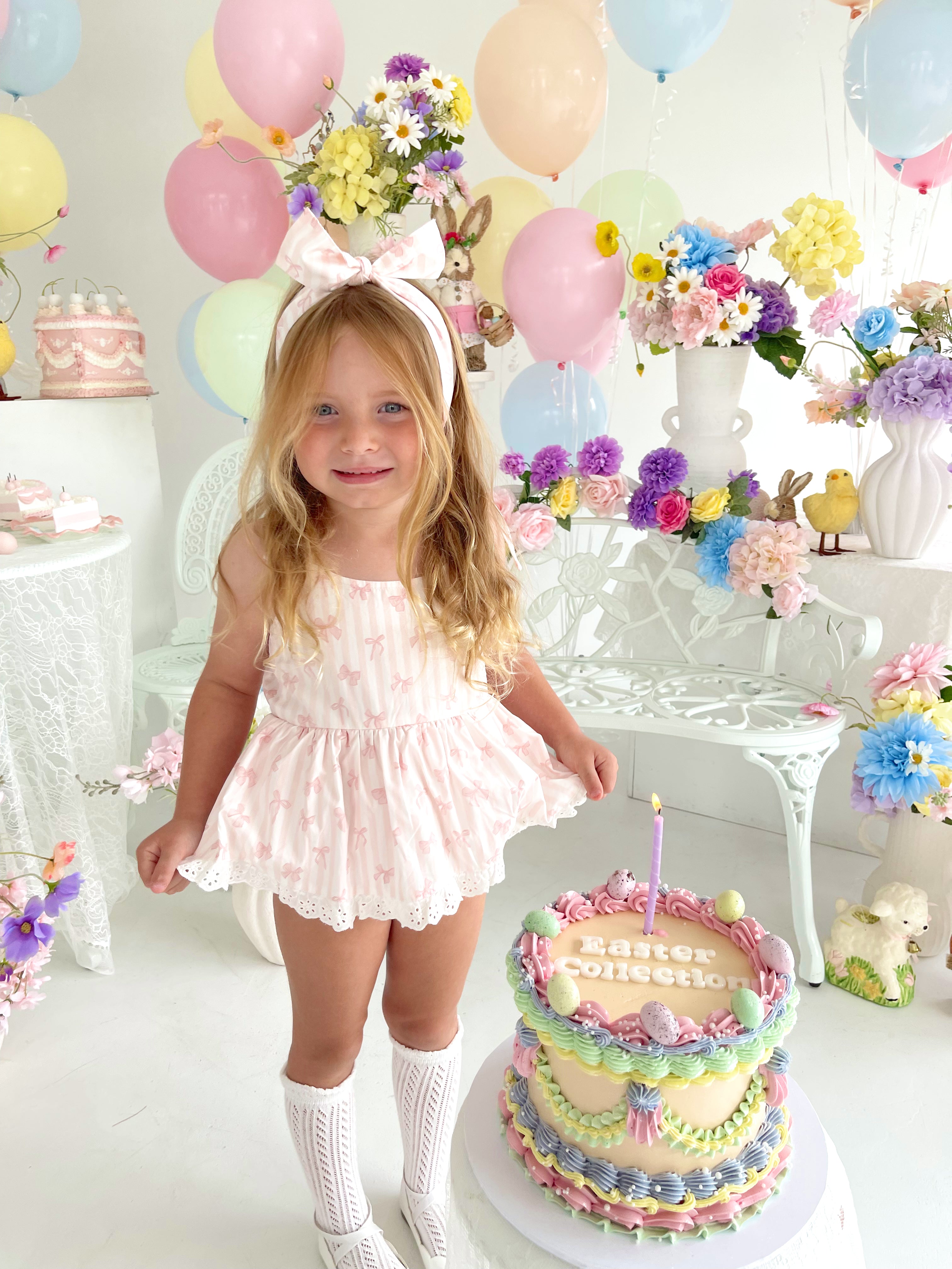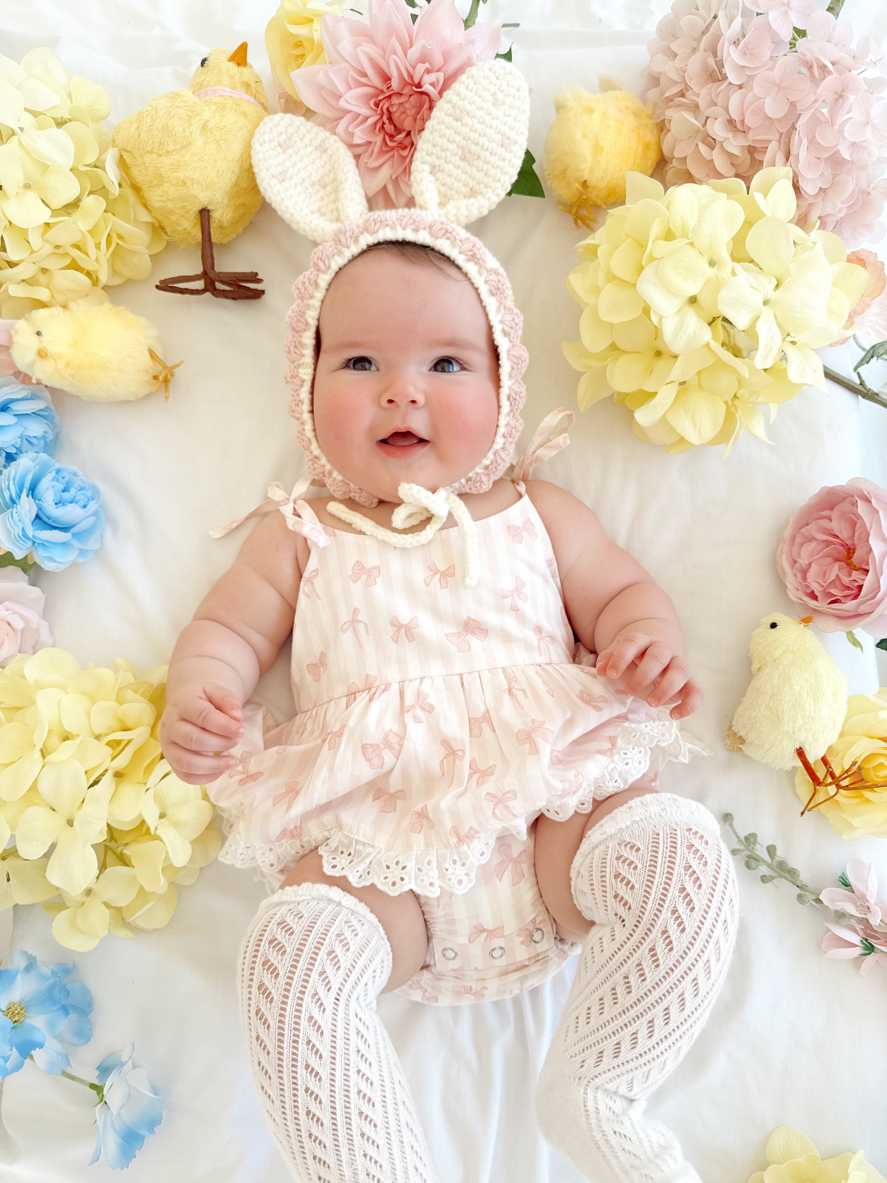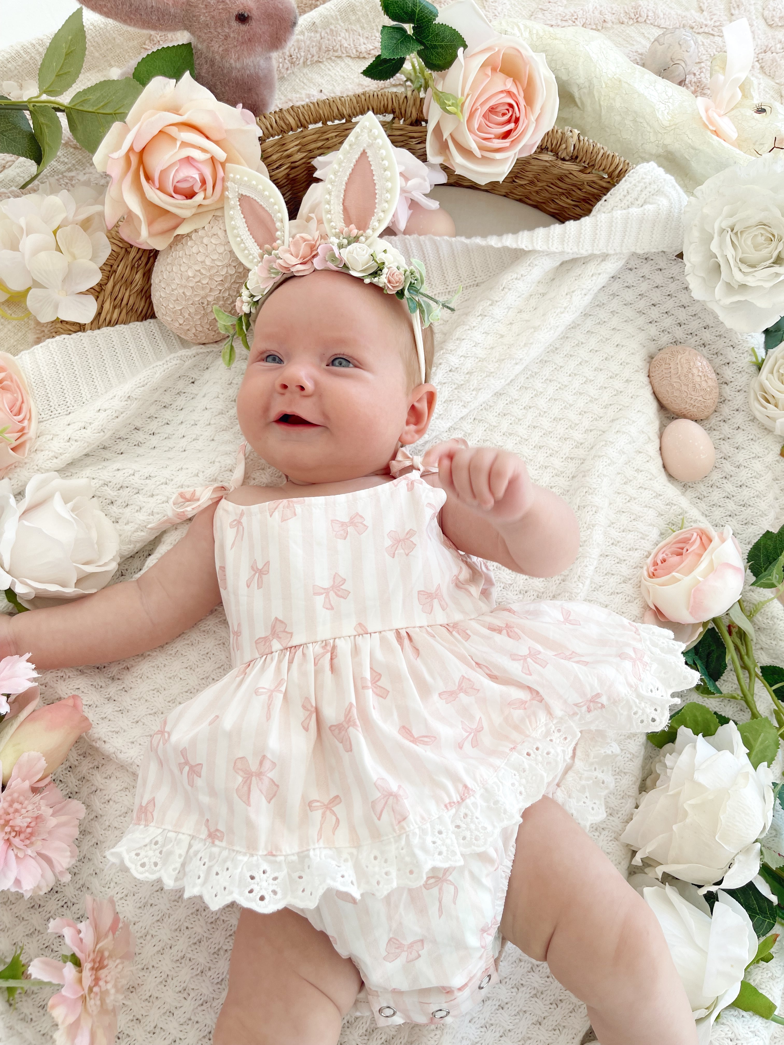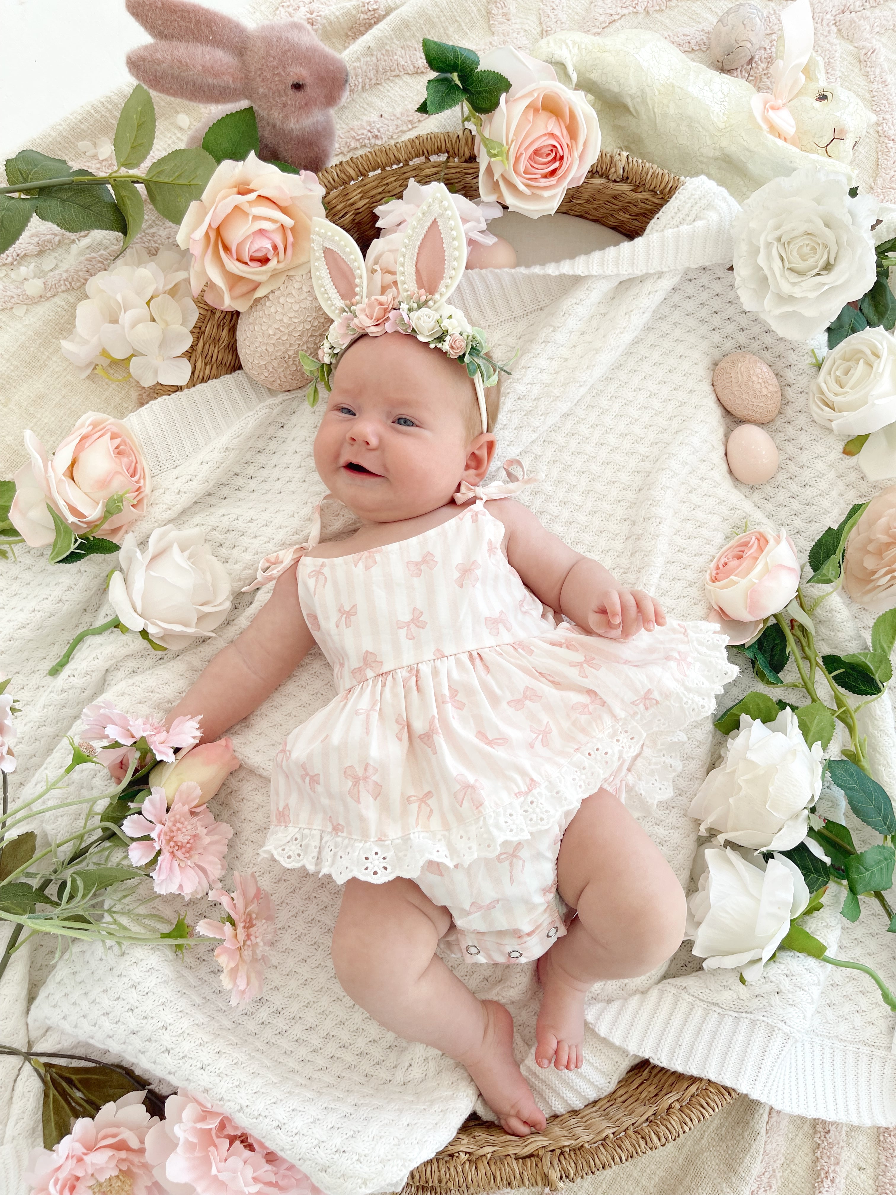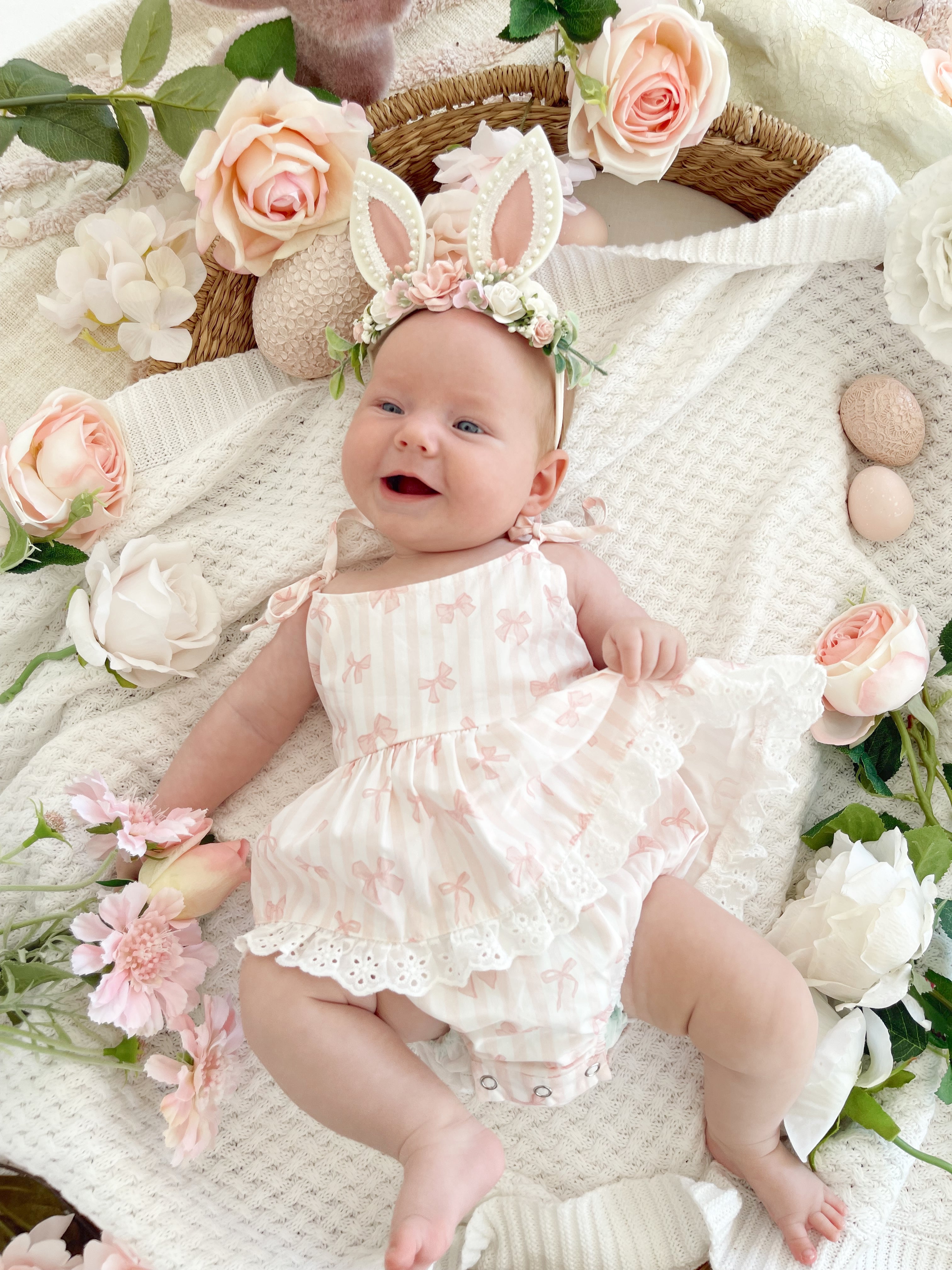 Crafted in a sweet light pink stripe and bow print, this romper is a must-have addition to your little girl’s wardrobe! It features a scoop neckline, a peplum-style swing top, and delicate broderie anglaise frill detailing.