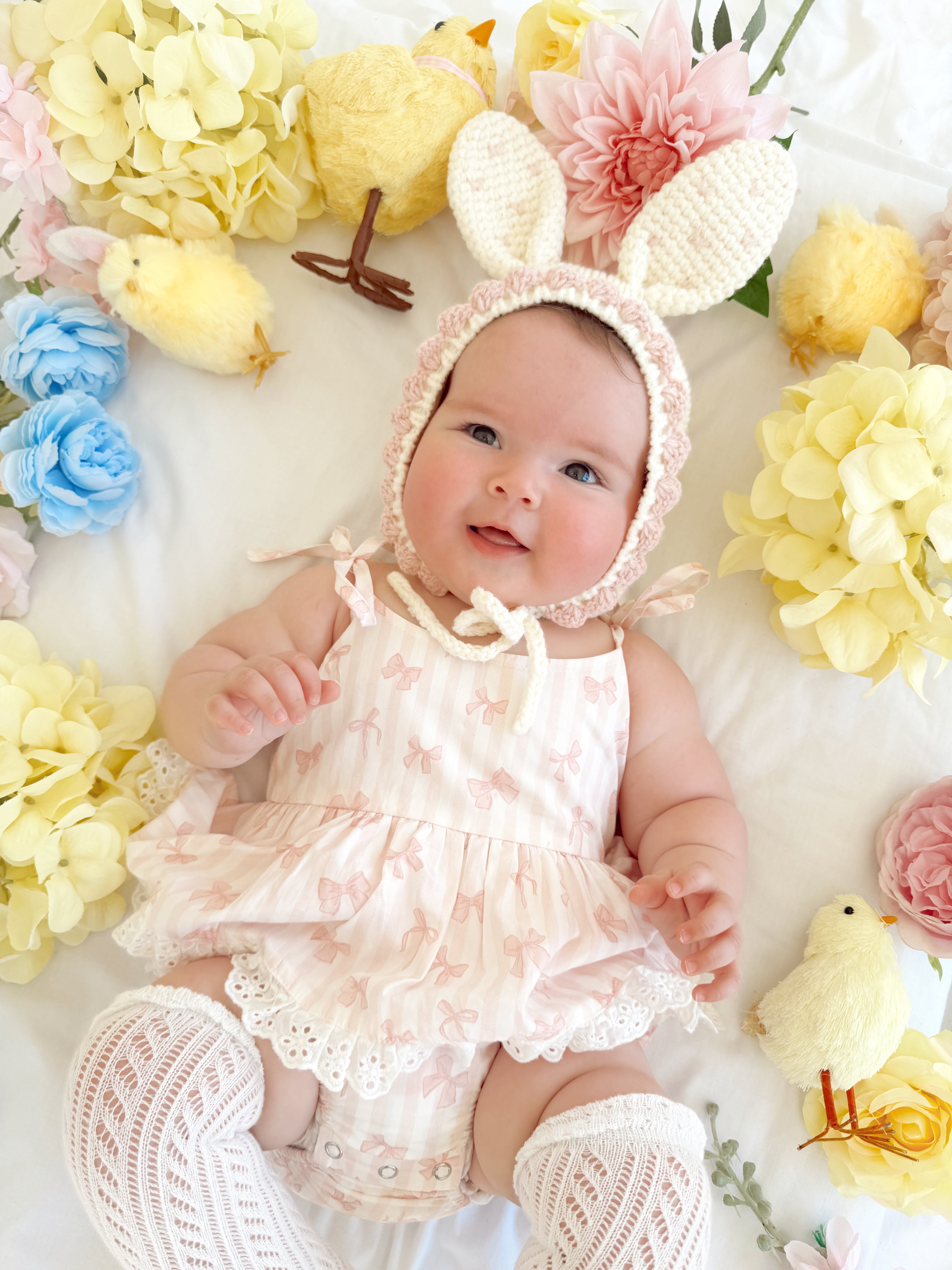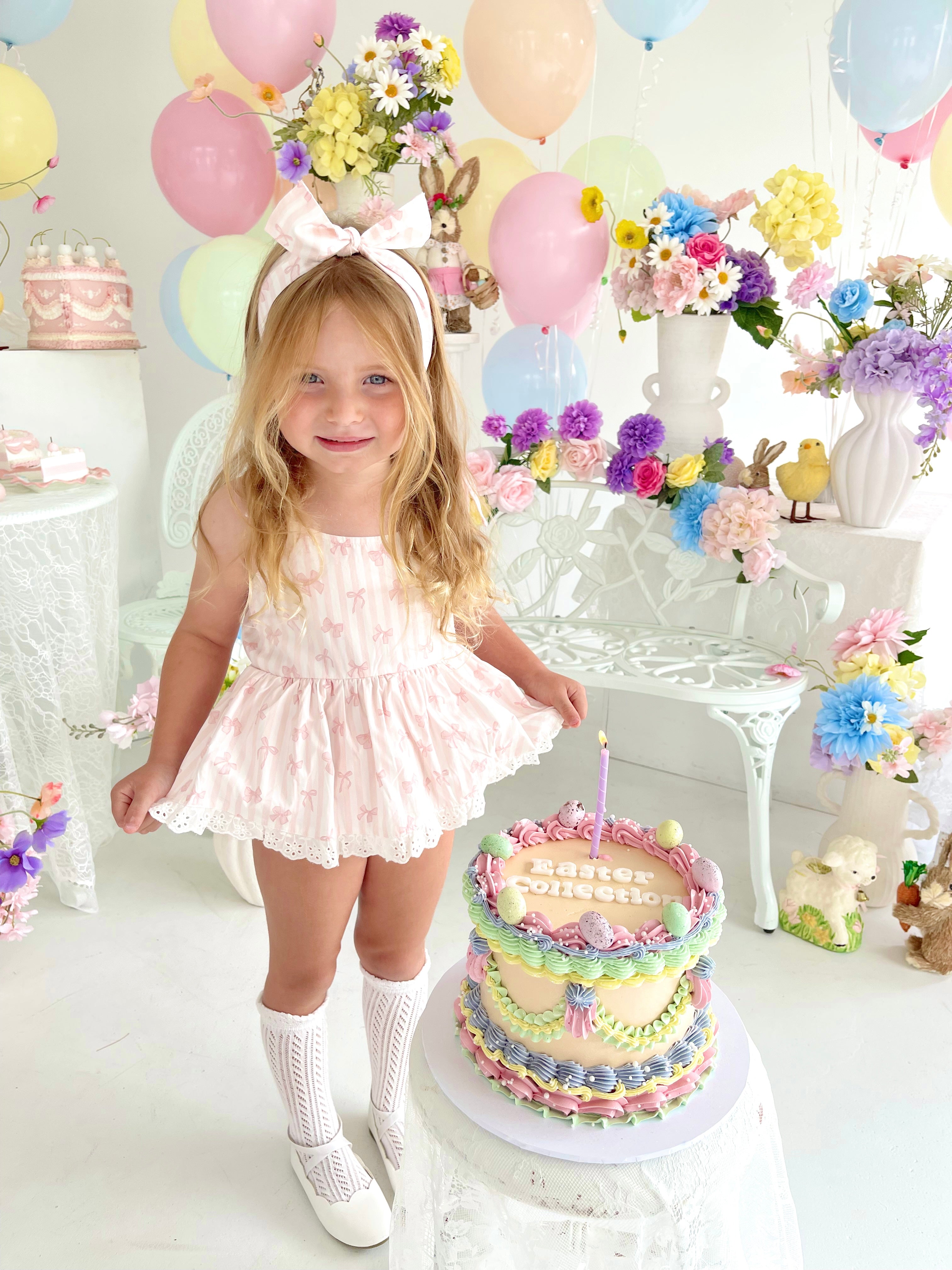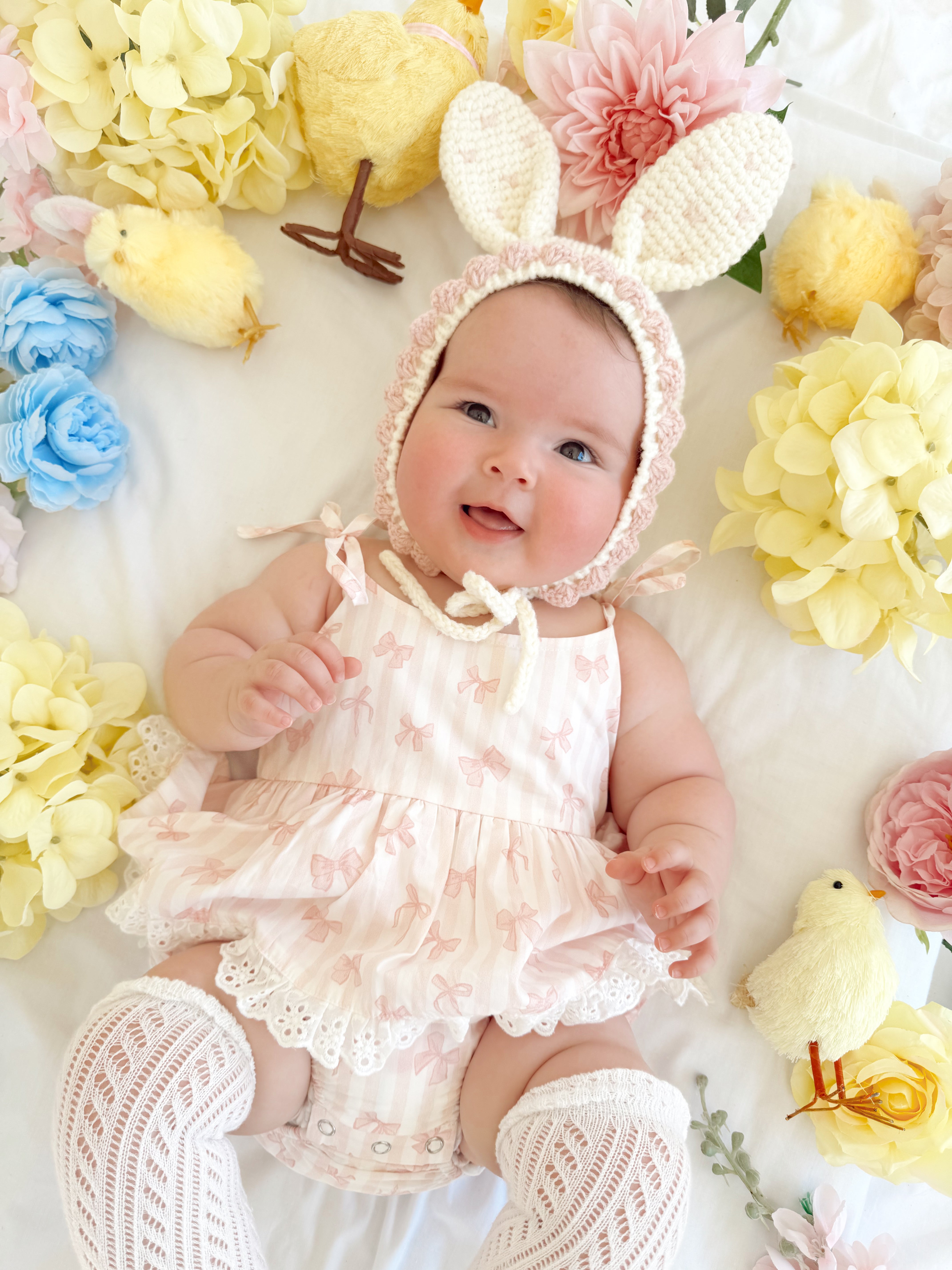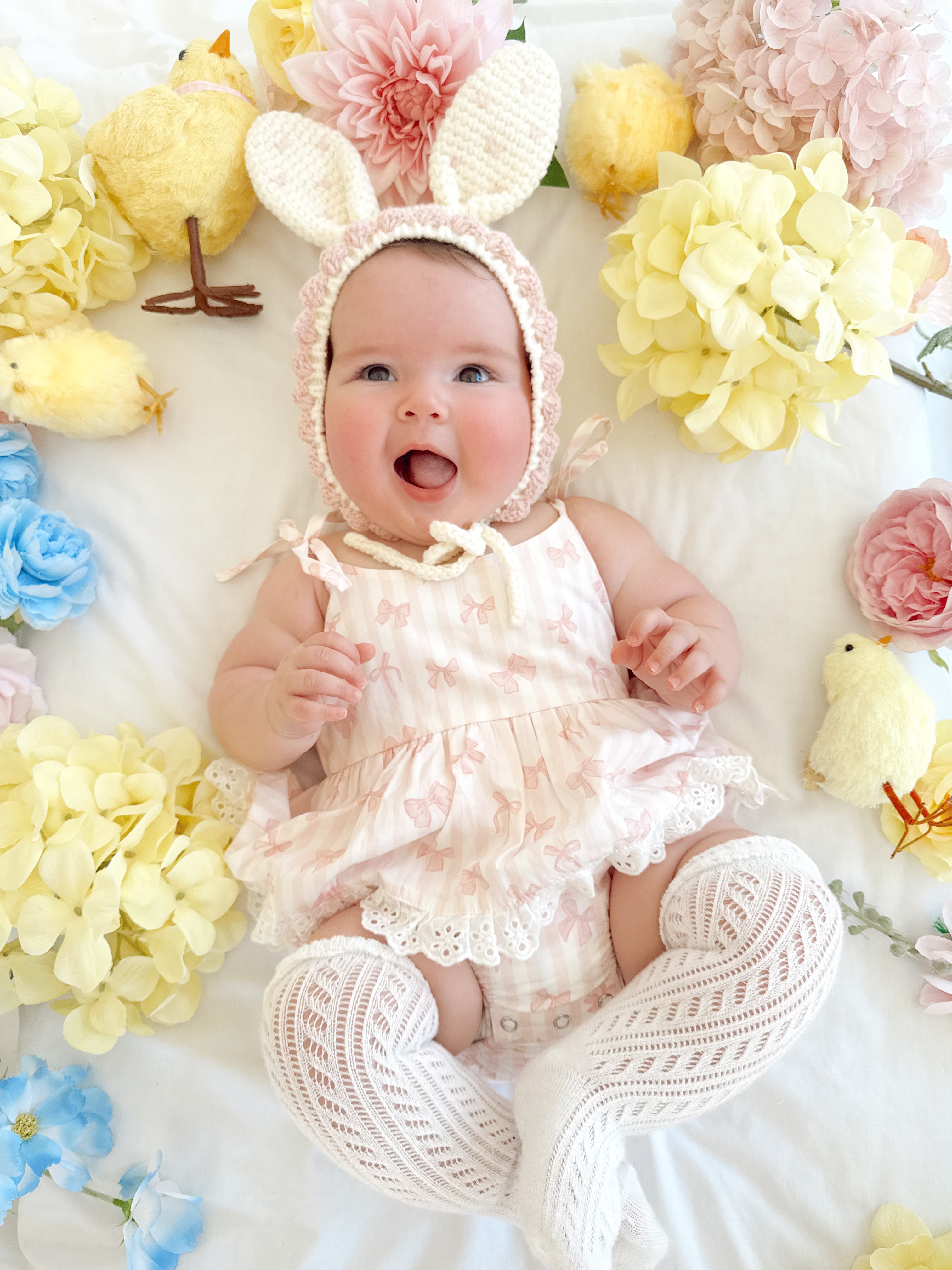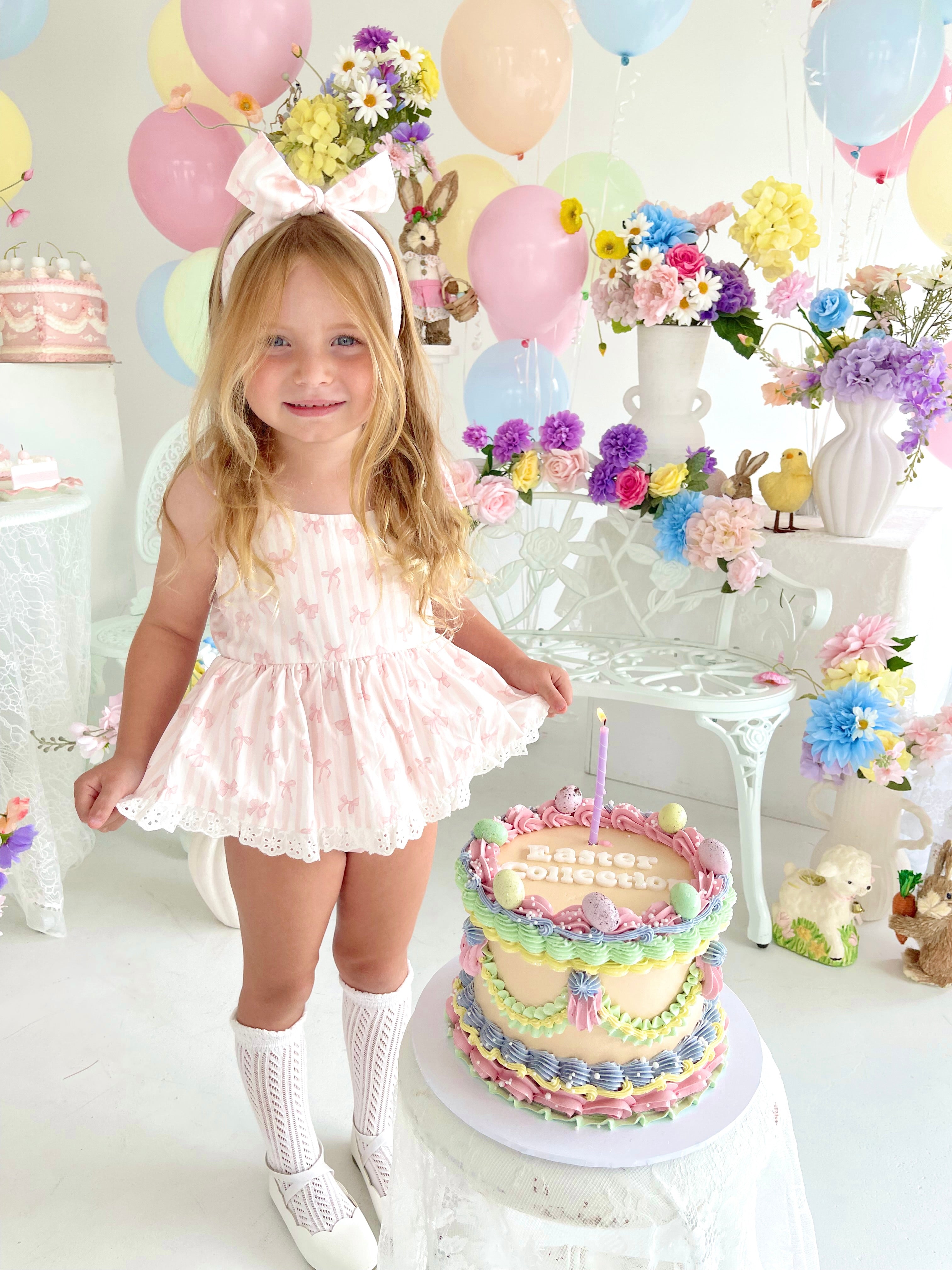 Crafted in a sweet light pink stripe and bow print, this romper is a must-have addition to your little girl’s wardrobe! It features a scoop neckline, a peplum-style swing top, and delicate broderie anglaise frill detailing.