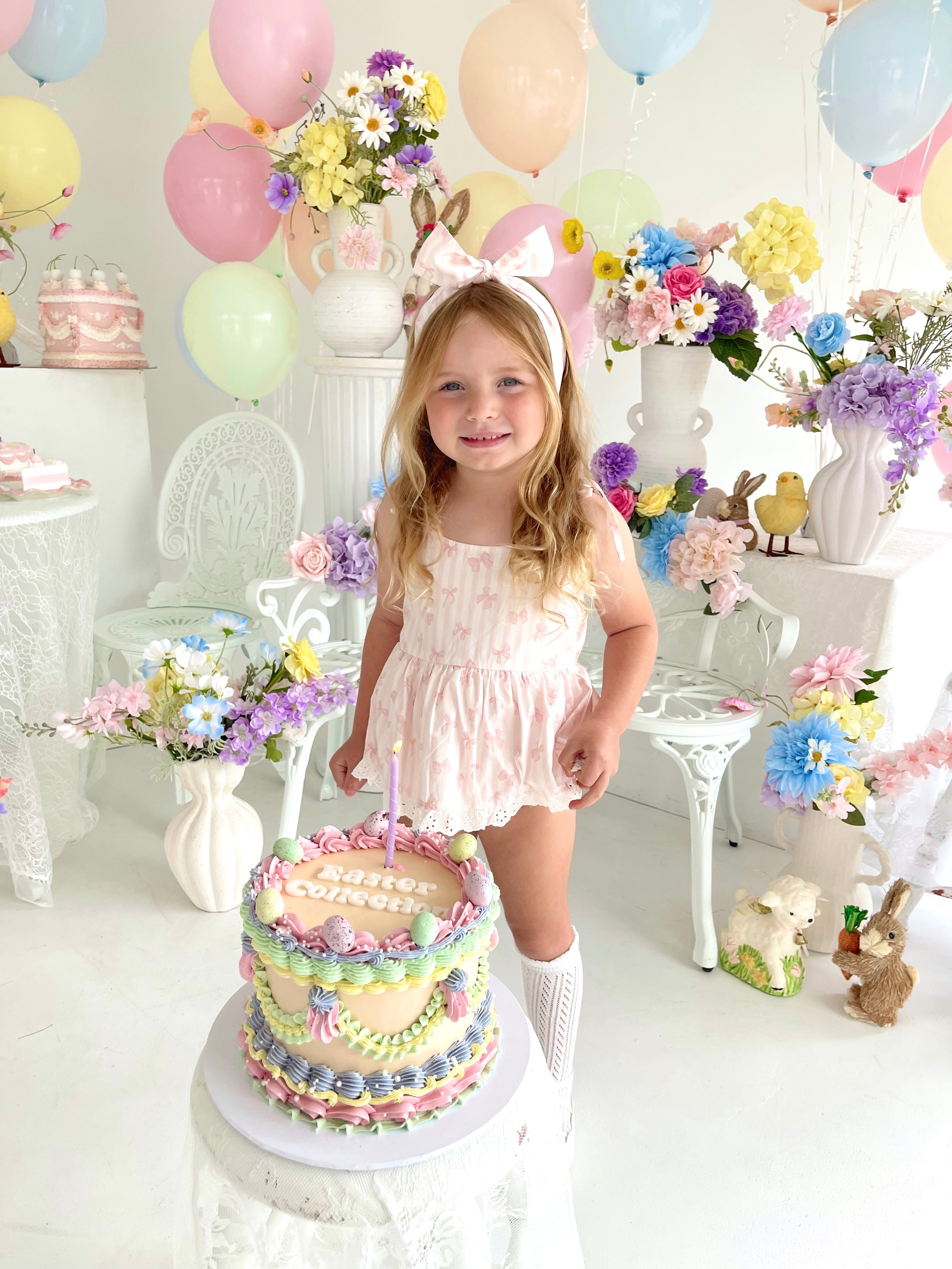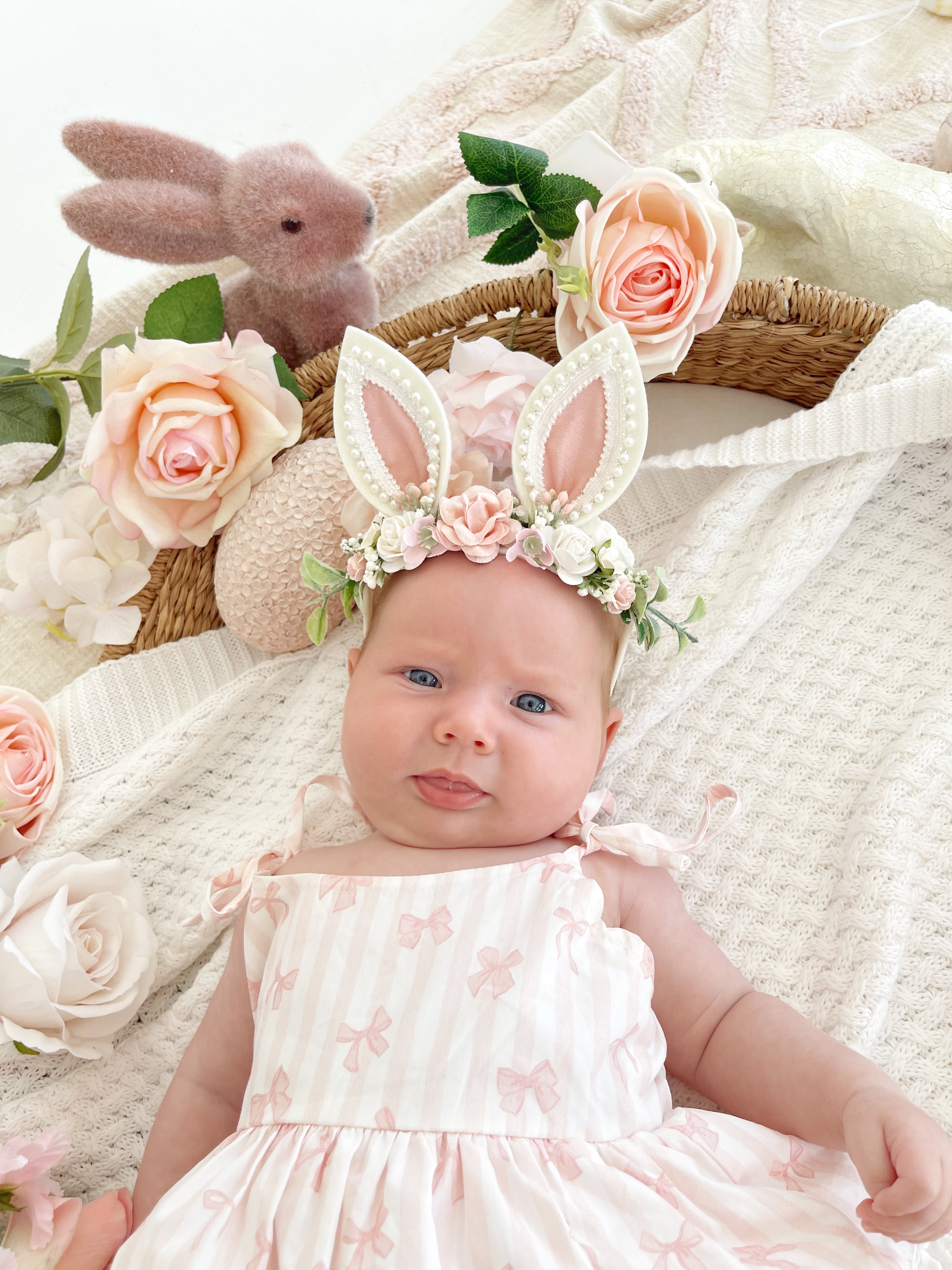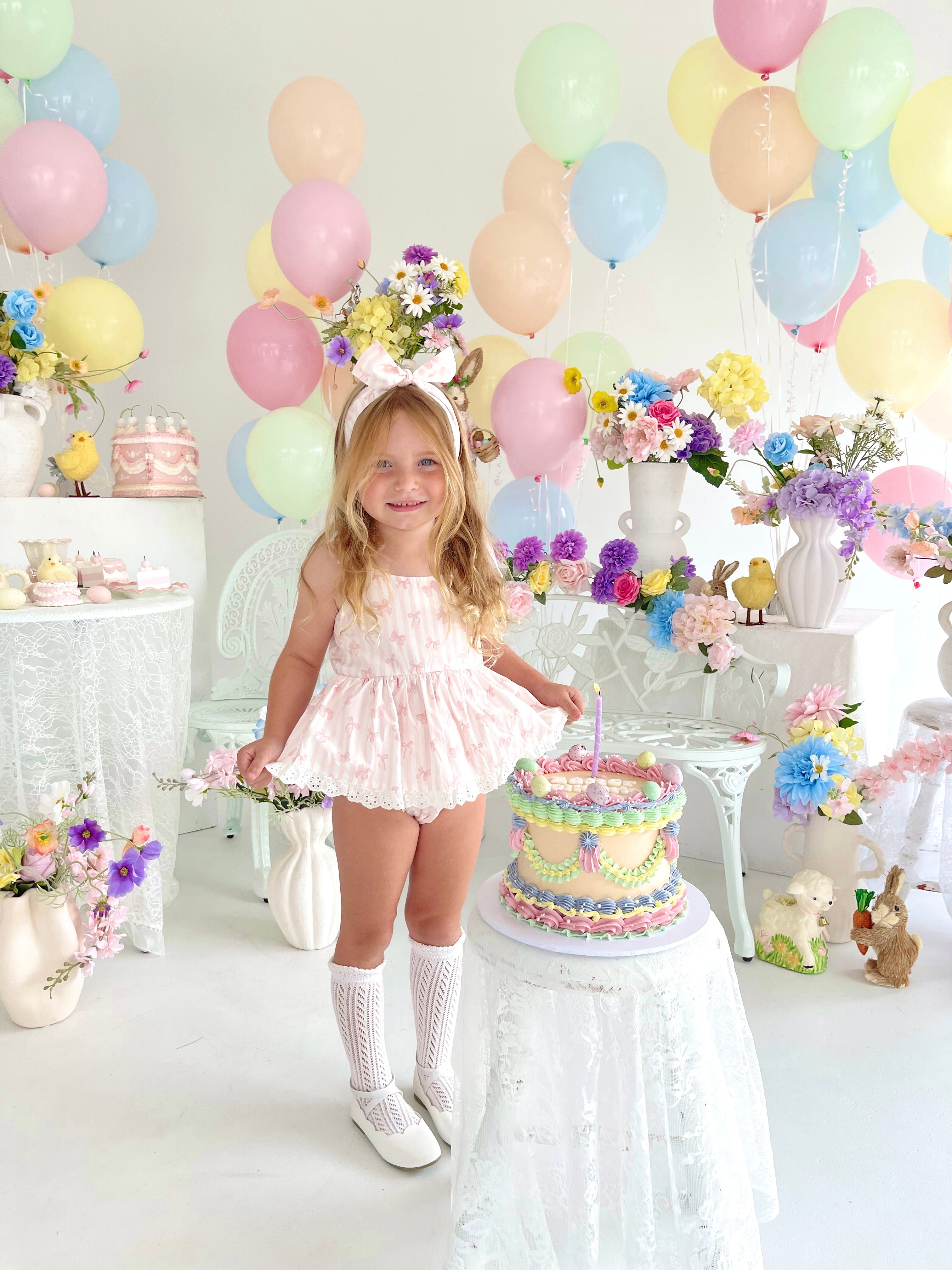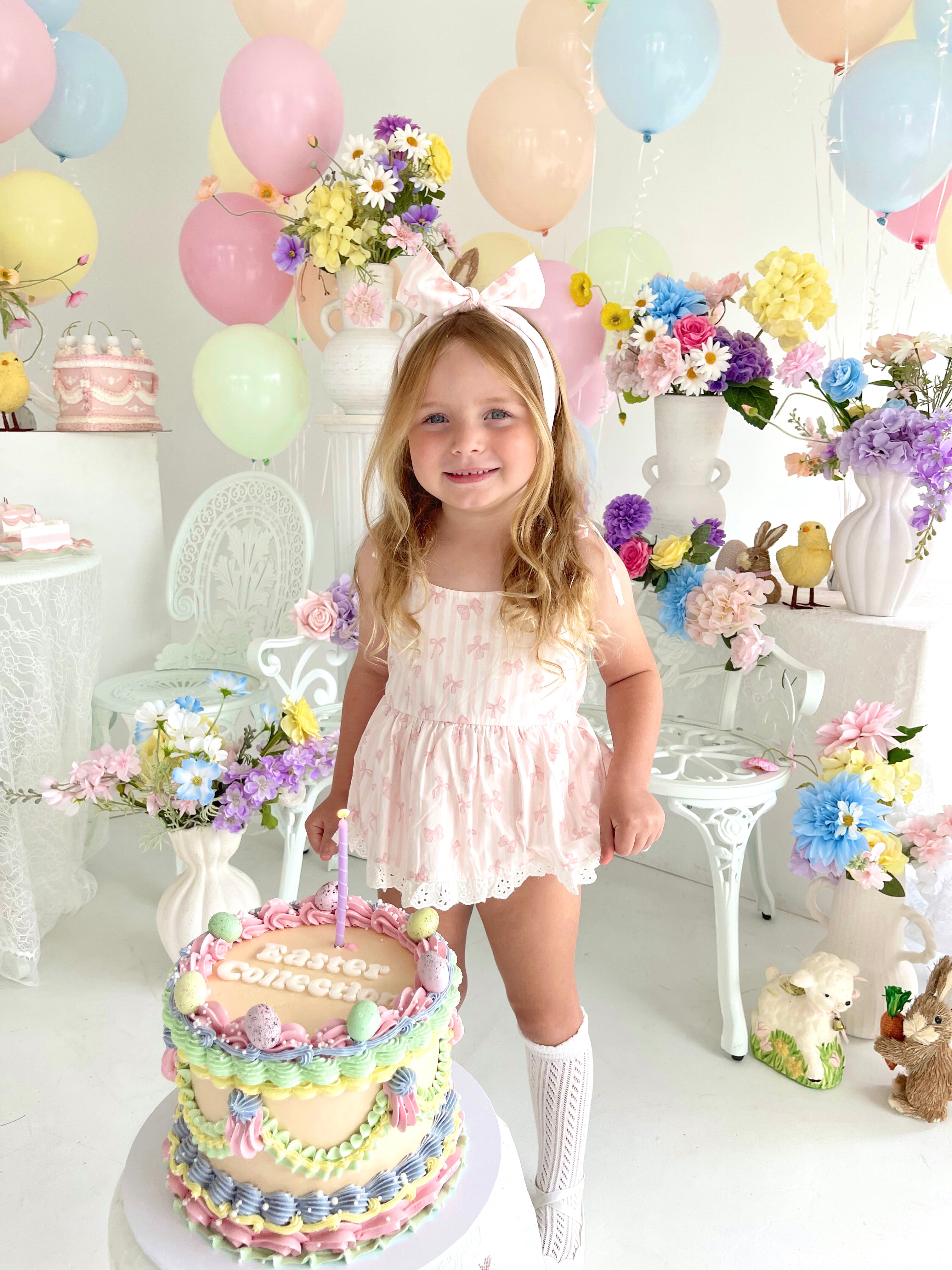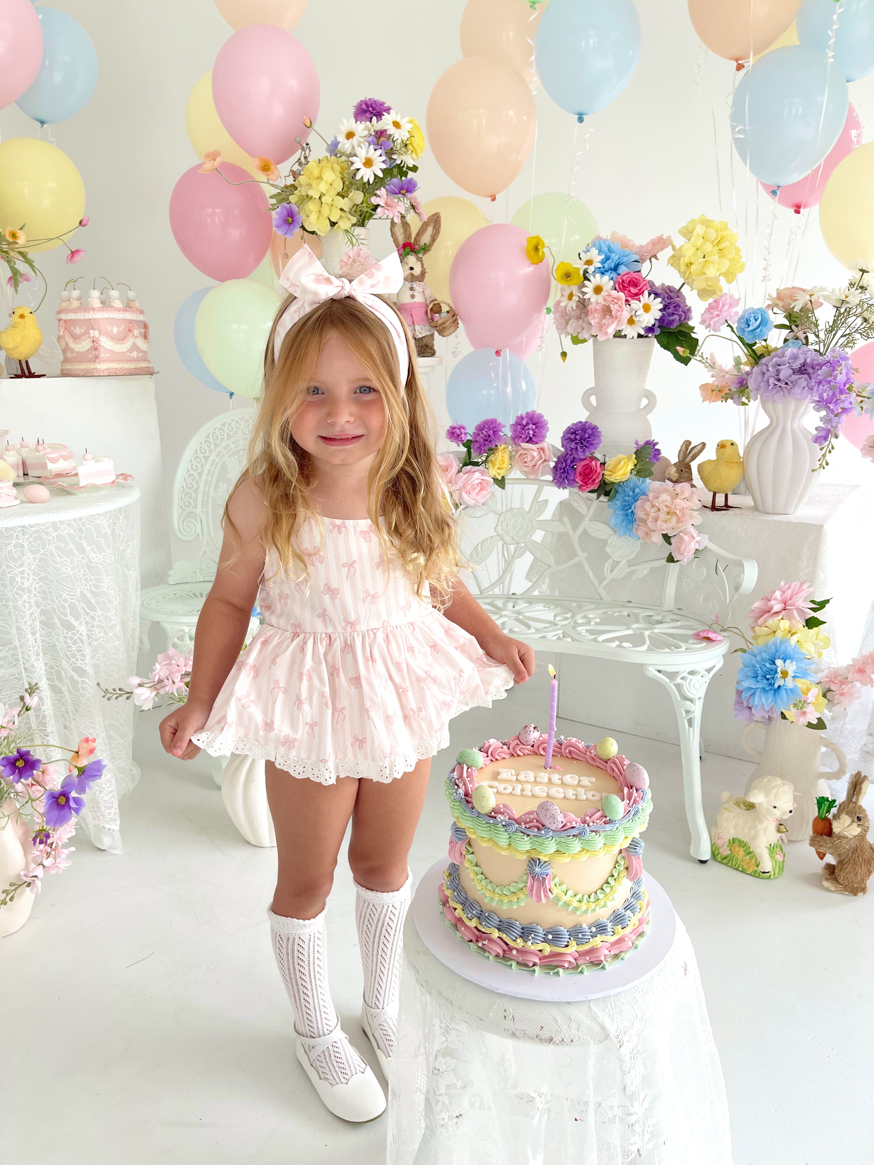 Crafted in a sweet light pink stripe and bow print, this romper is a must-have addition to your little girl’s wardrobe! It features a scoop neckline, a peplum-style swing top, and delicate broderie anglaise frill detailing.