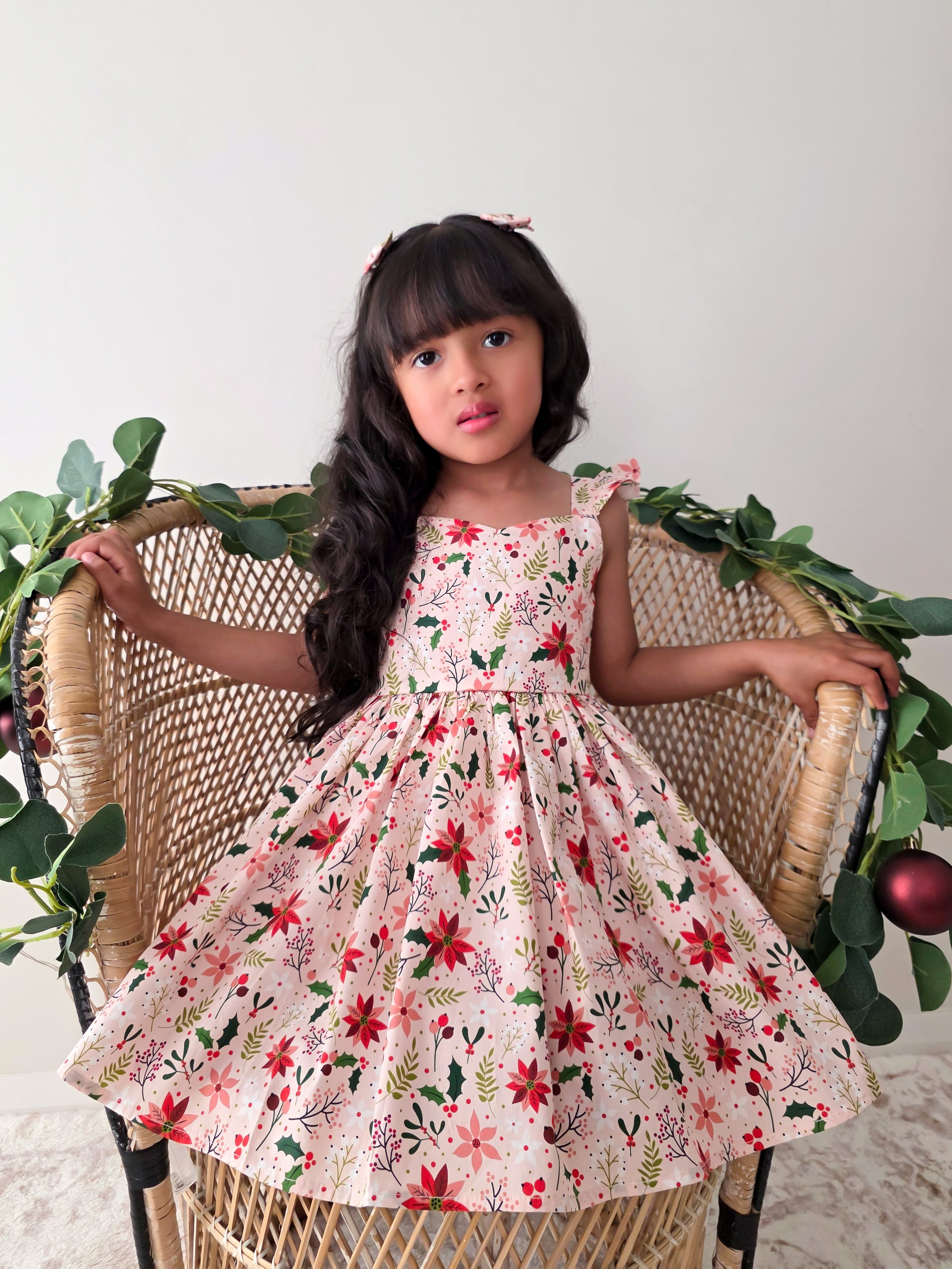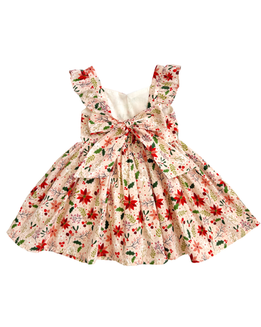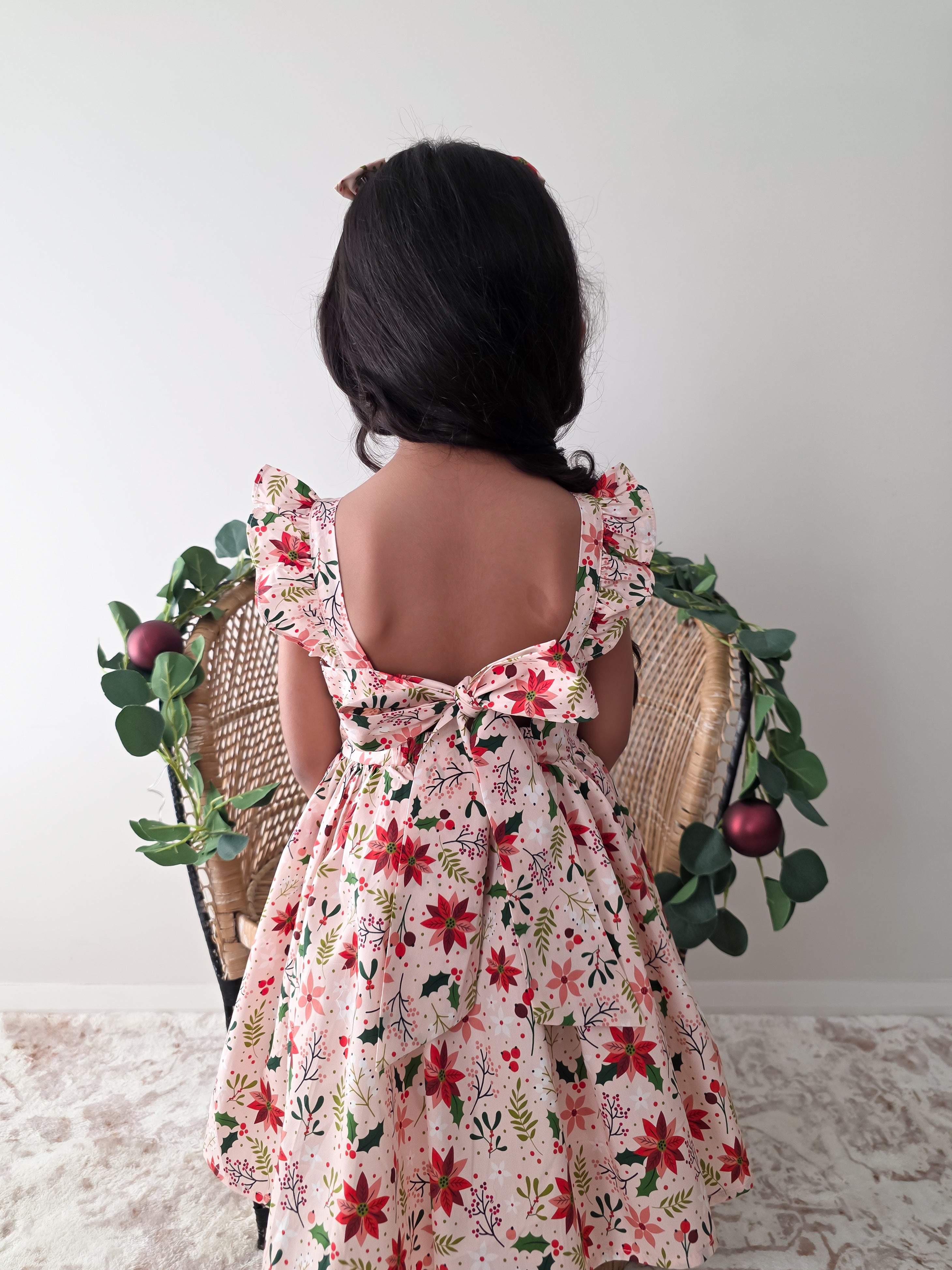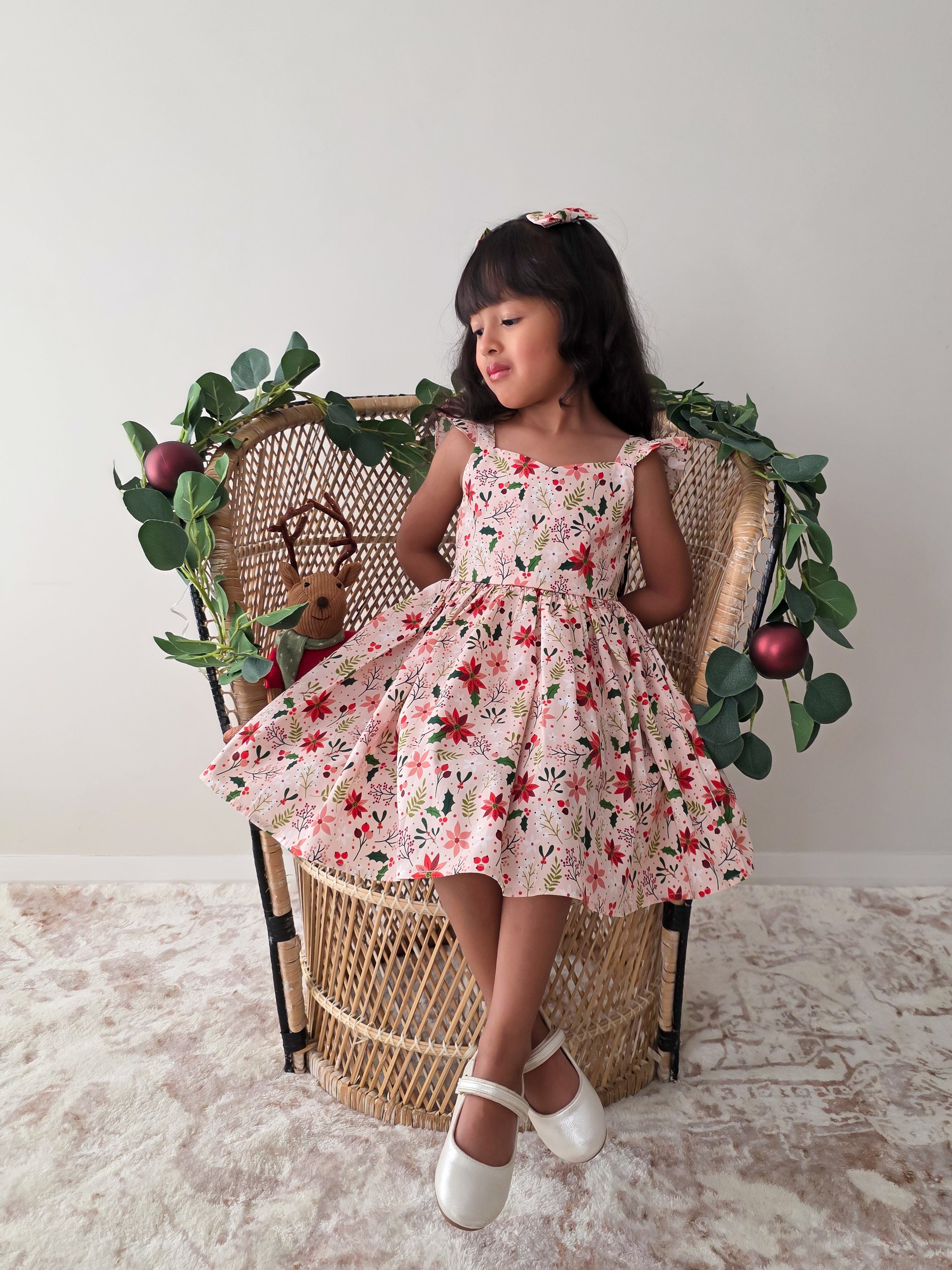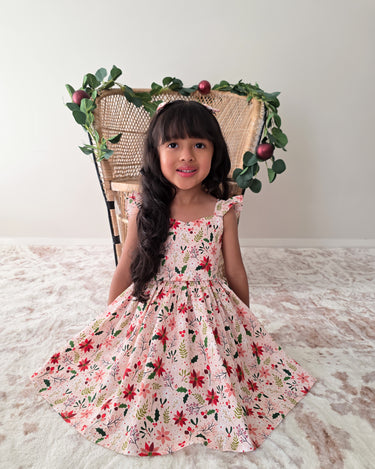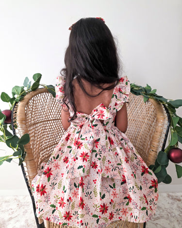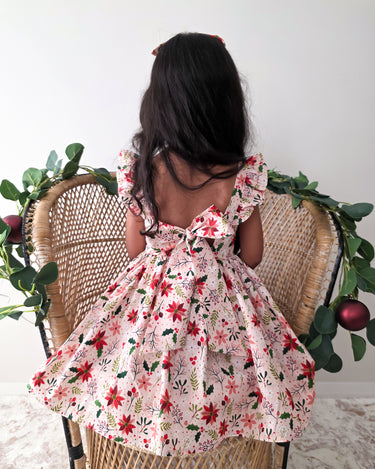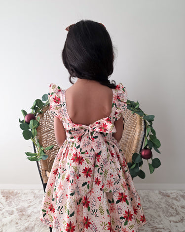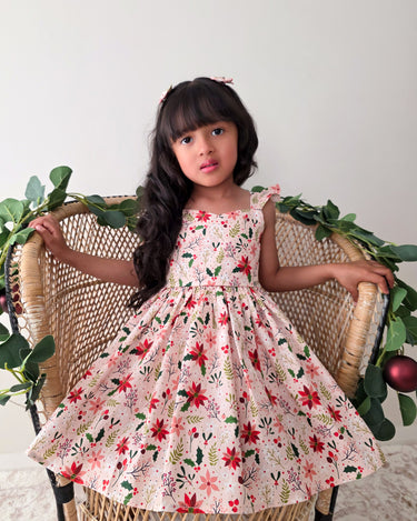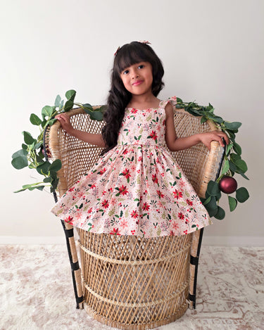 Crafted in a lightweight cotton fabric, this dress is beautifully crafted in the sweetest poinsettia floral print on a pink hue base! It features a sweetheart neckline, a flouncy A-line skirt, statement ruffled straps and a large back bow. It also features an elasticated waist for comfort and to ensure best fit.