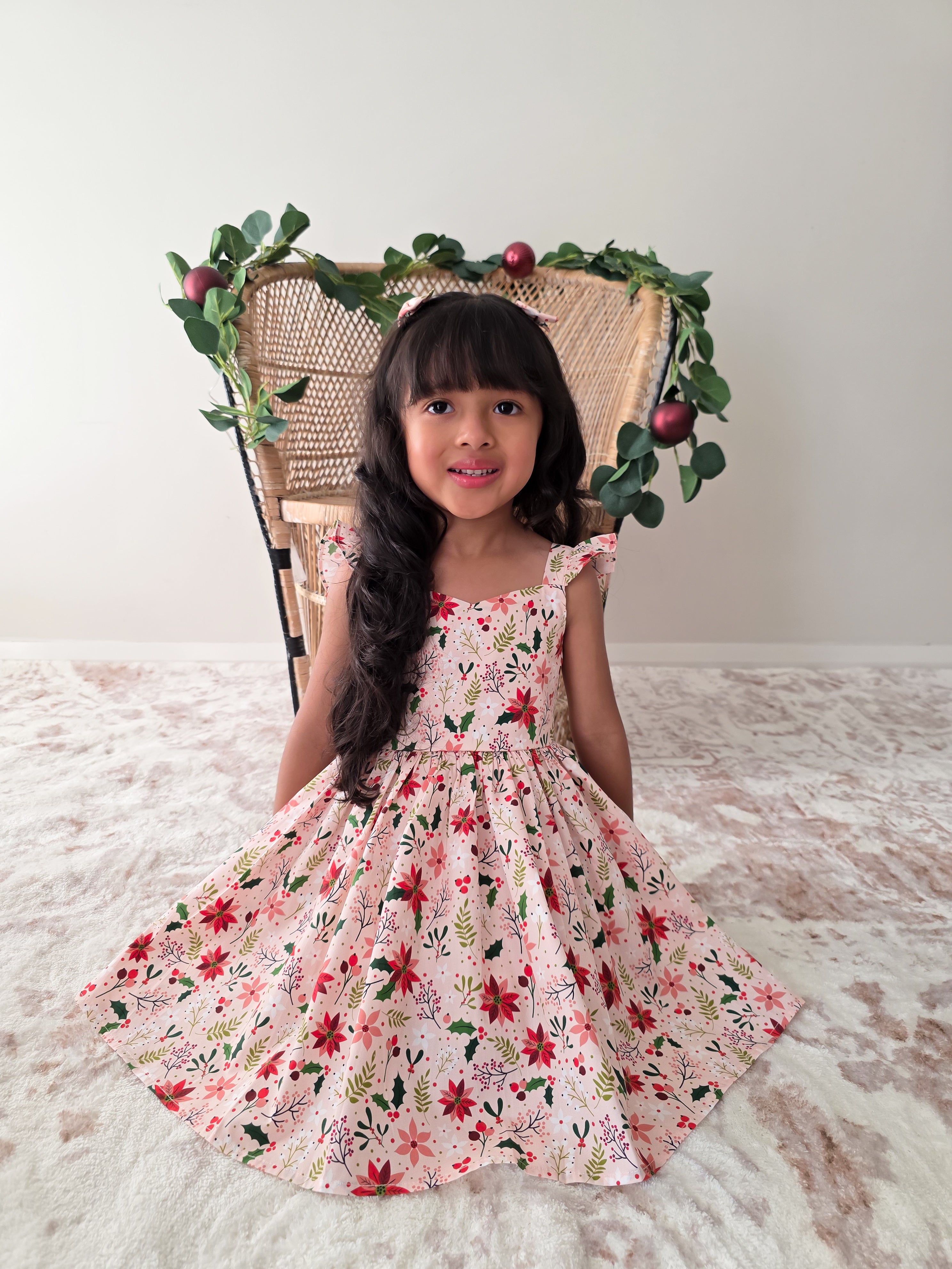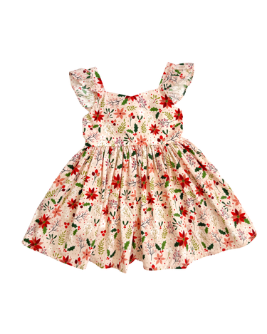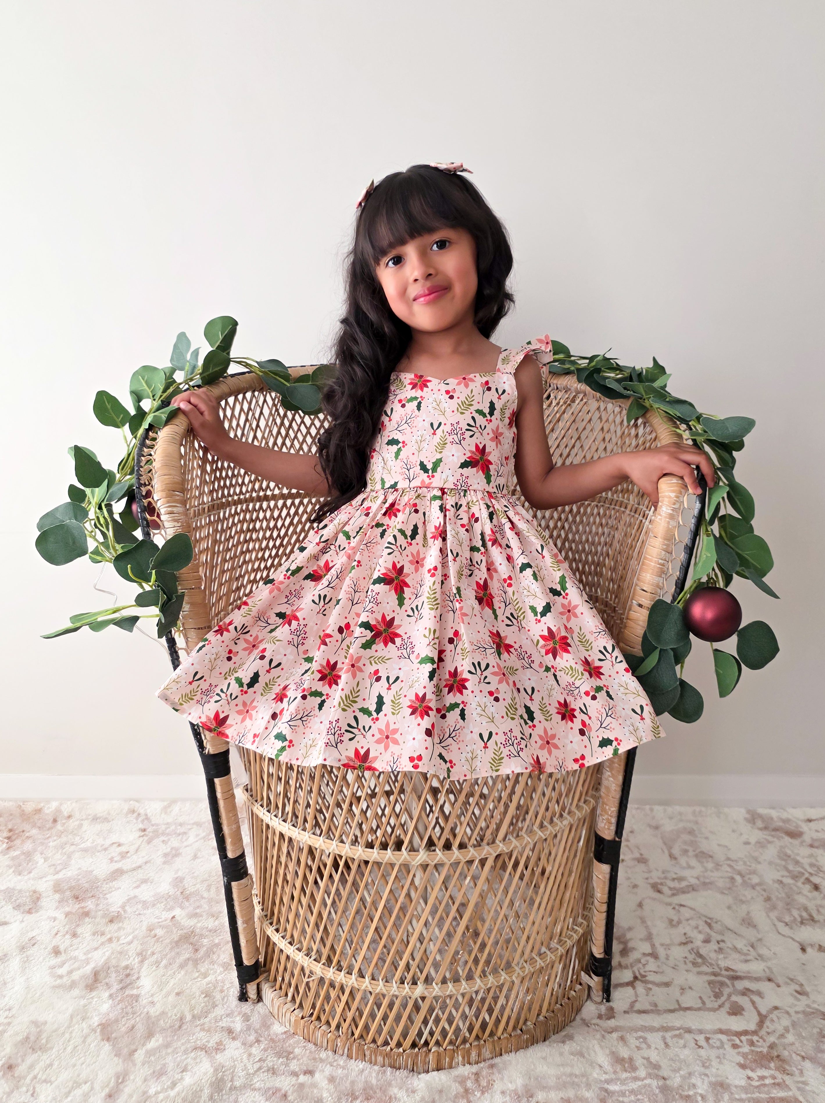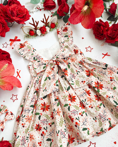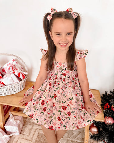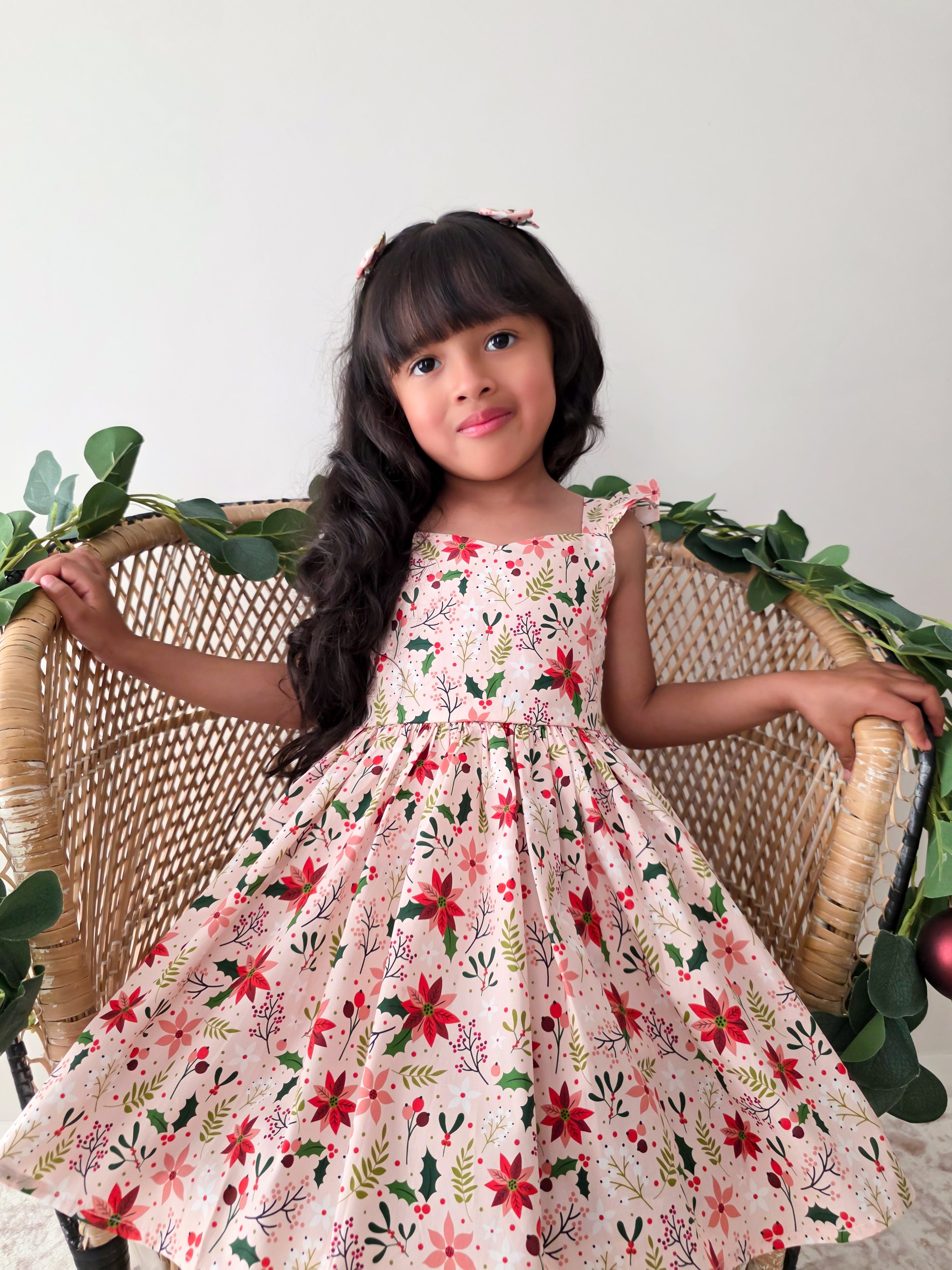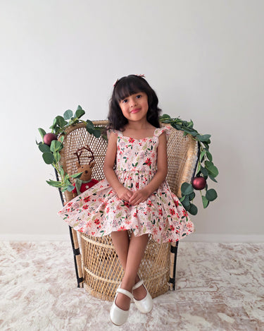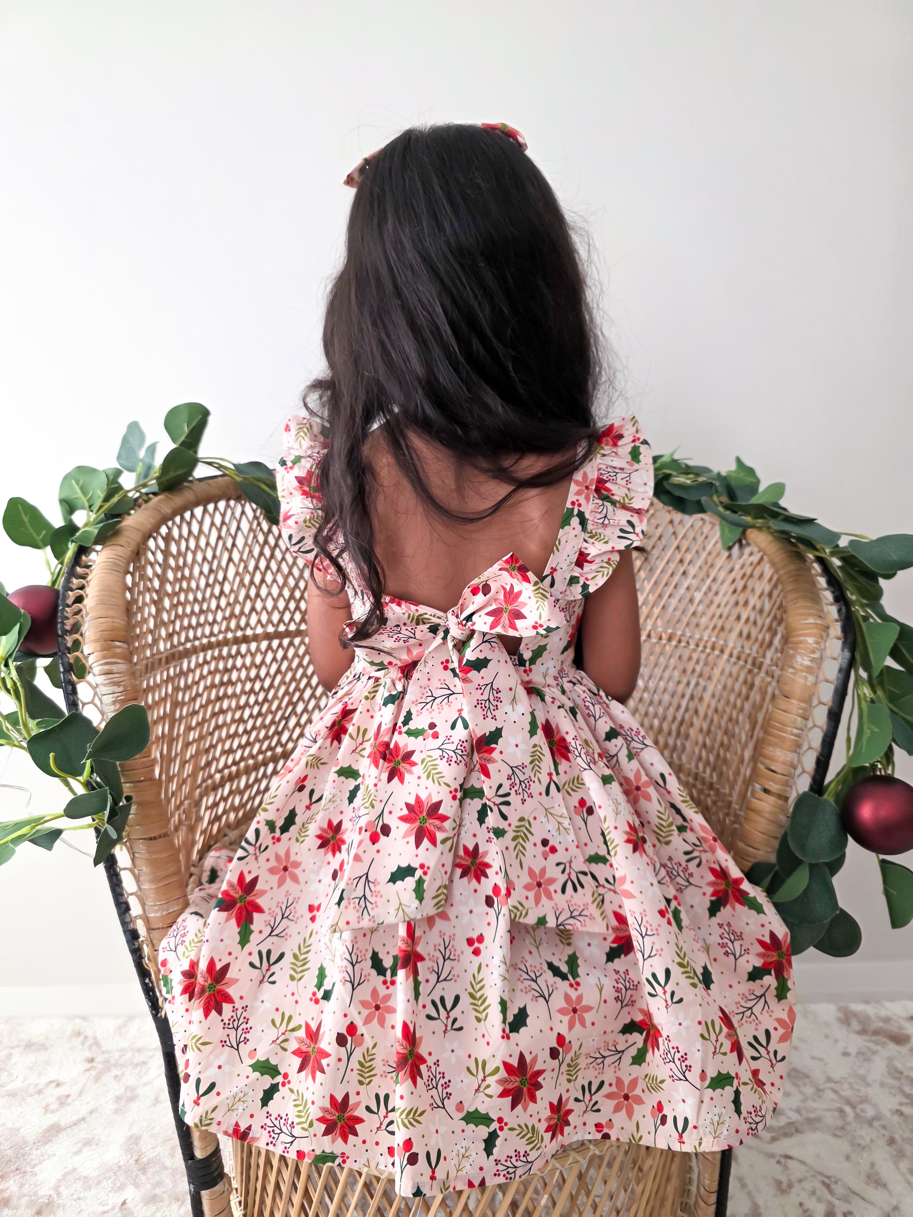 Crafted in a lightweight cotton fabric, this dress is beautifully crafted in the sweetest poinsettia floral print on a pink hue base! It features a sweetheart neckline, a flouncy A-line skirt, statement ruffled straps and a large back bow. It also features an elasticated waist for comfort and to ensure best fit.
