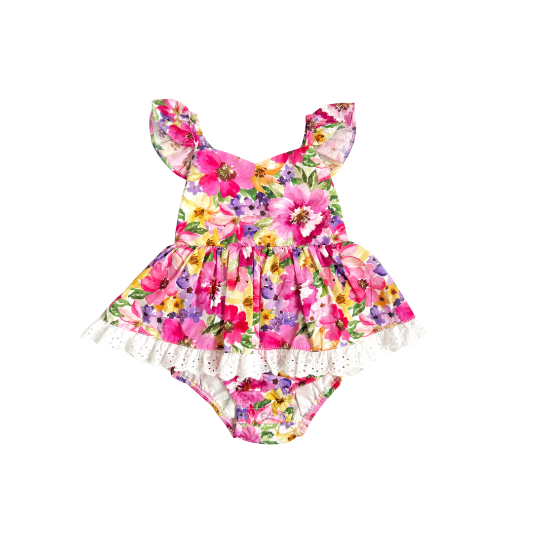 Bright and vibrant! Say hello to out Floral Fiesta Baby Girl Cotton Romper!
