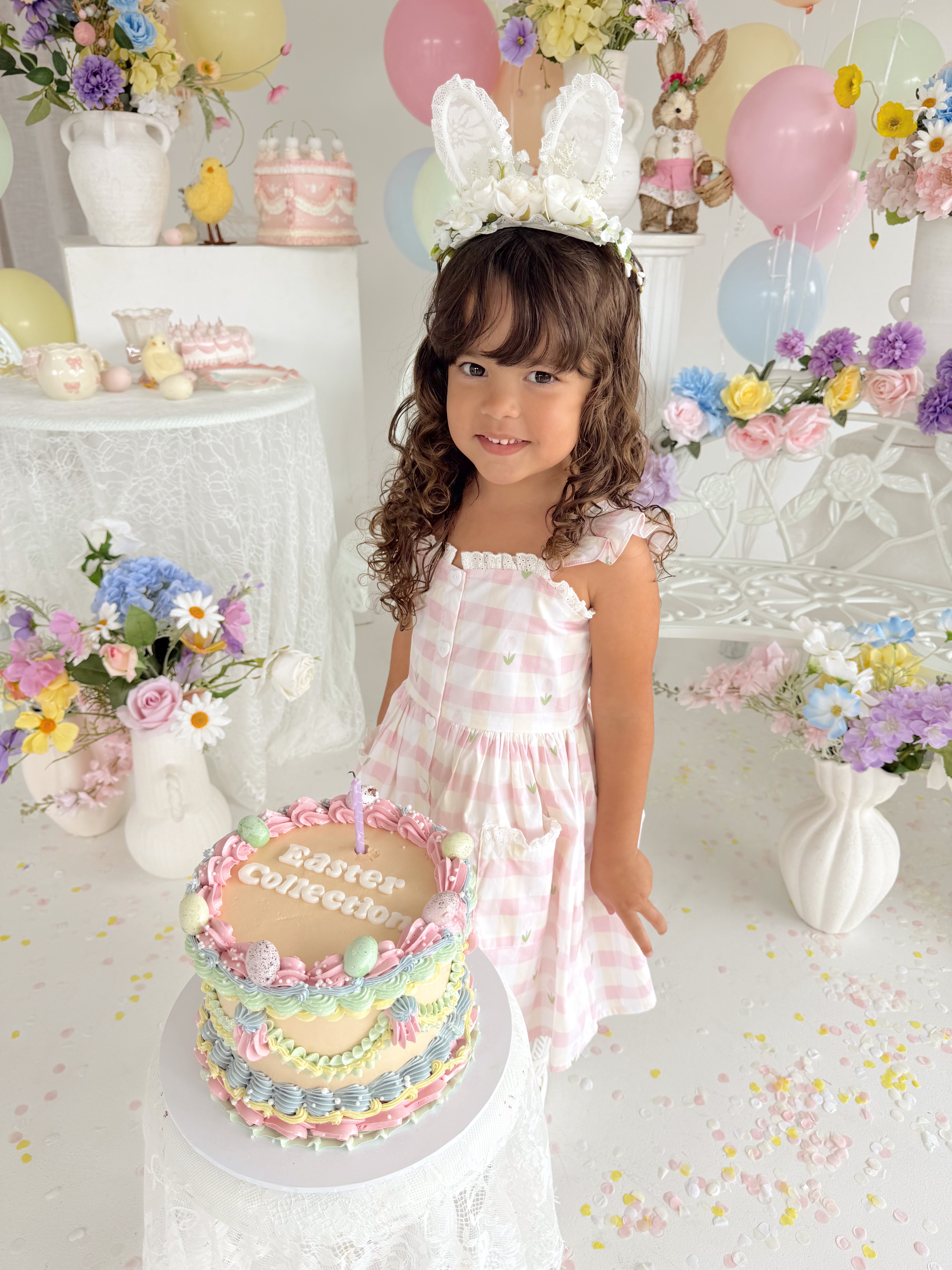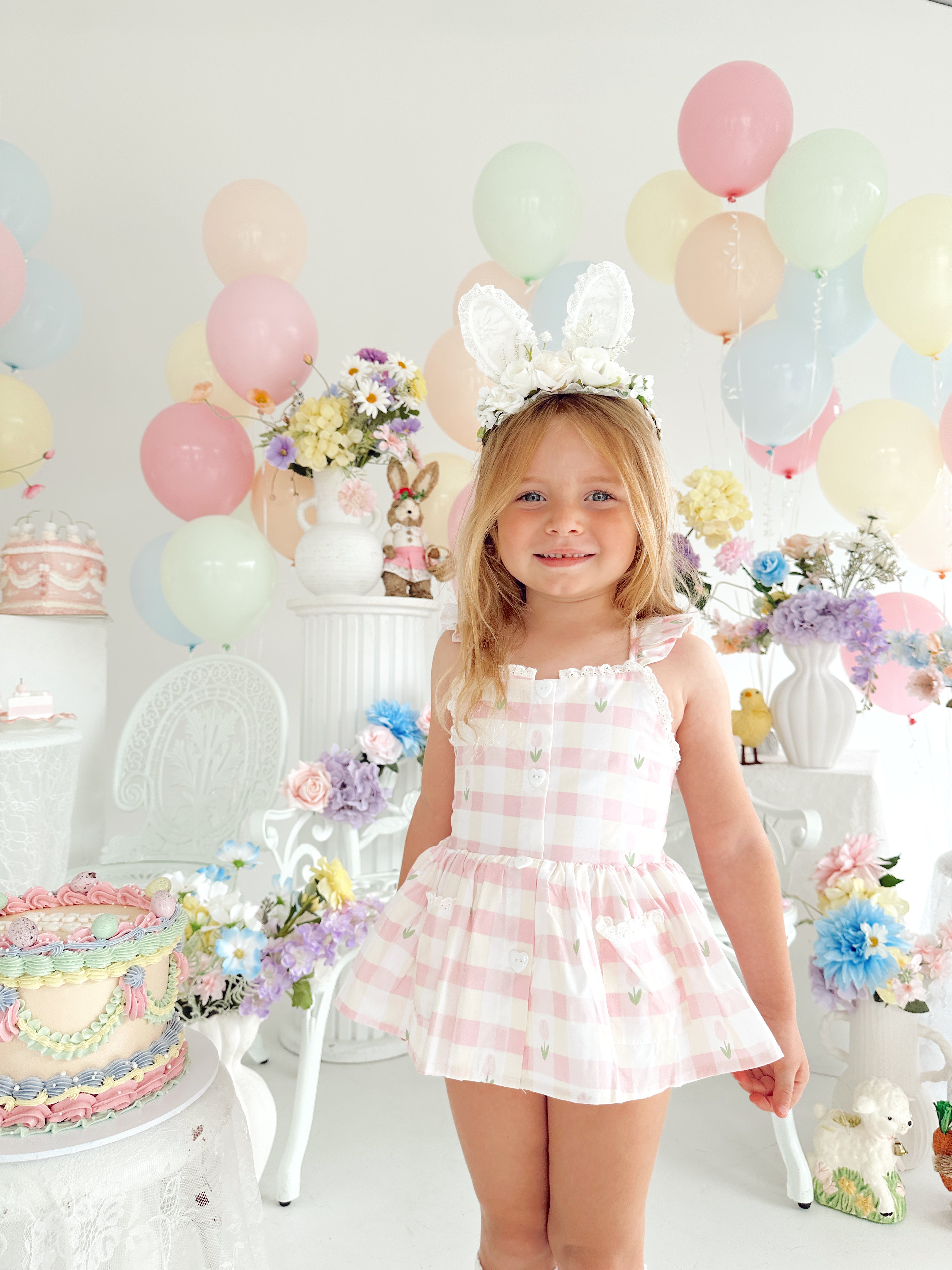 Notre adorable guirlande florale blanche avec oreilles de lapin Rosie Mae est la coiffe parfaite pour compléter la tenue de Pâques de votre petite fille.