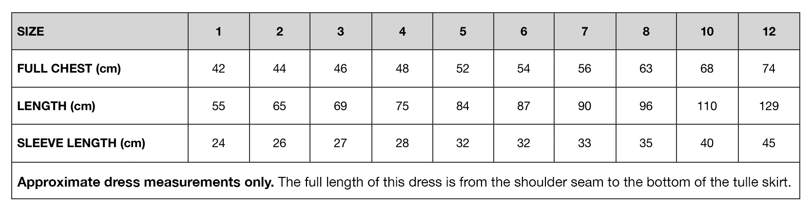 The bodice is crafted from incredibly soft lace and lined at the front with stretch jersey cotton, offering comfort against the skin. The dreamy full skirt is made with four layers of soft tulle, cotton-lined for added comfort, and includes an elastic waistband for a flexible fit. Depending on your child’s height, the skirt falls gracefully to the shin or ankle.