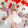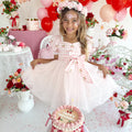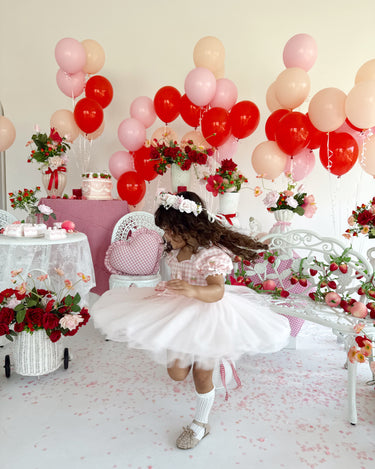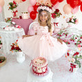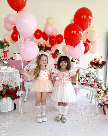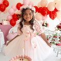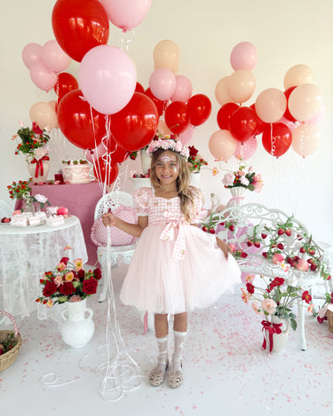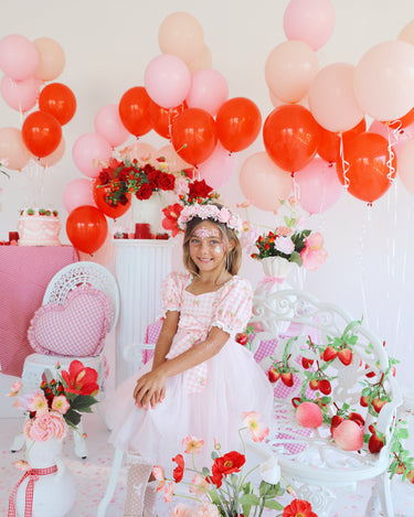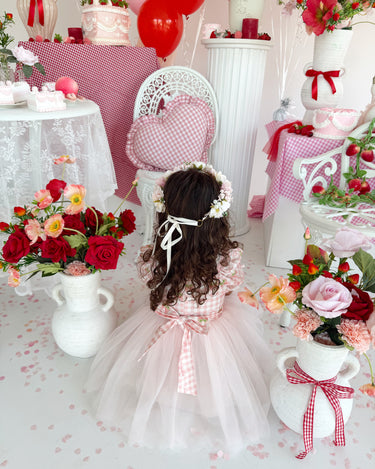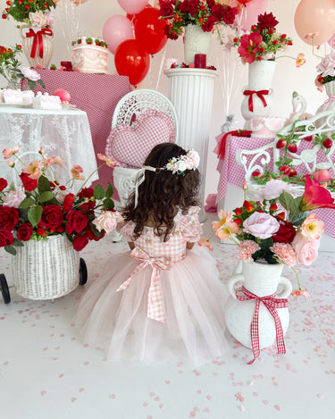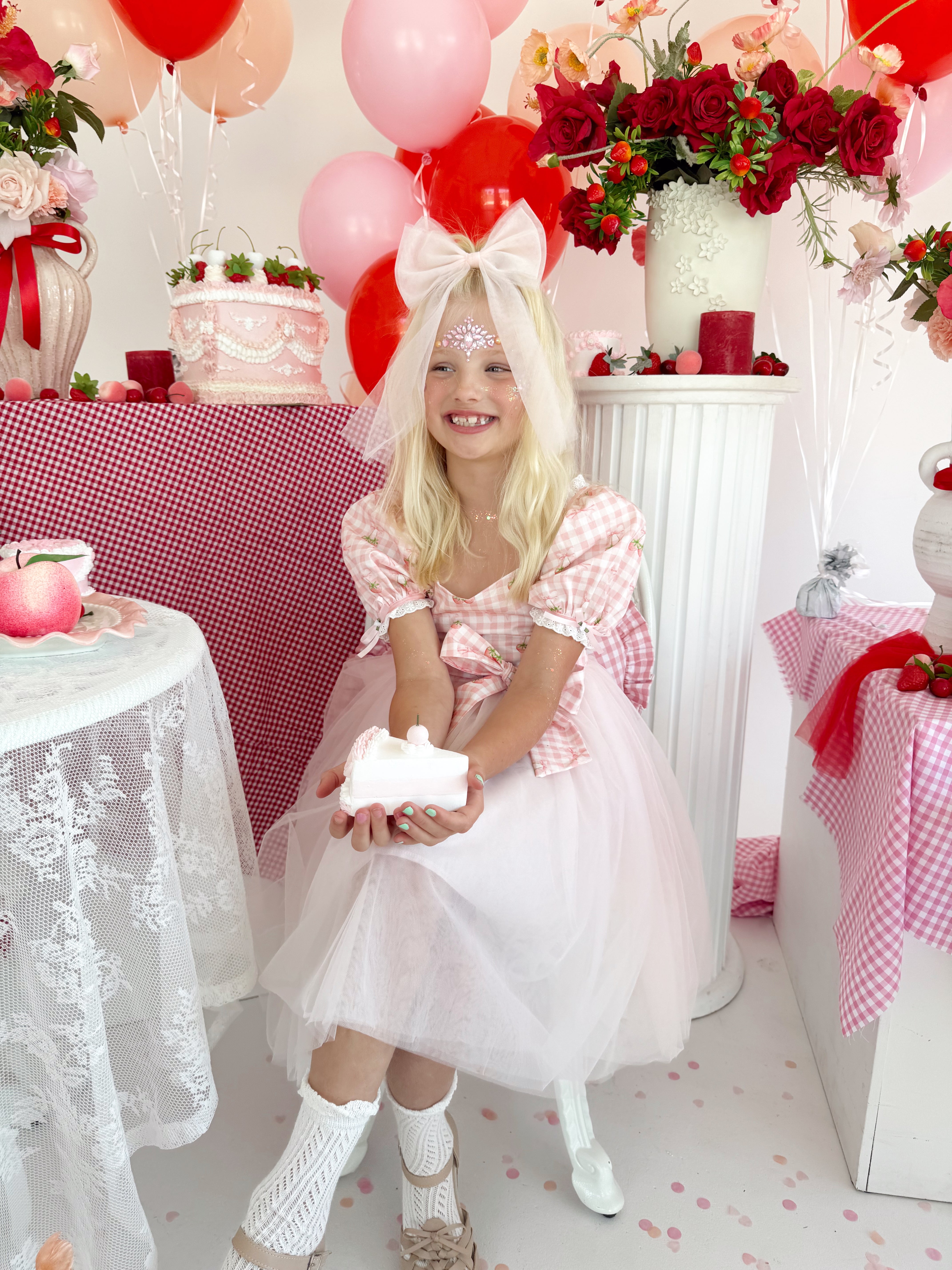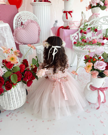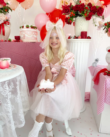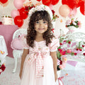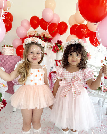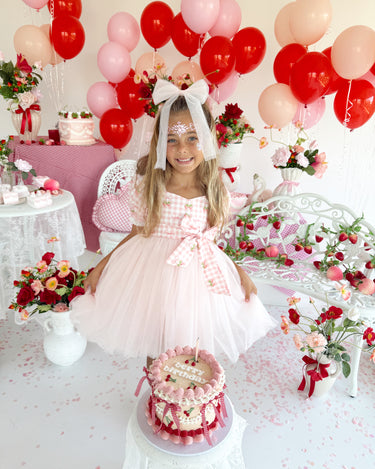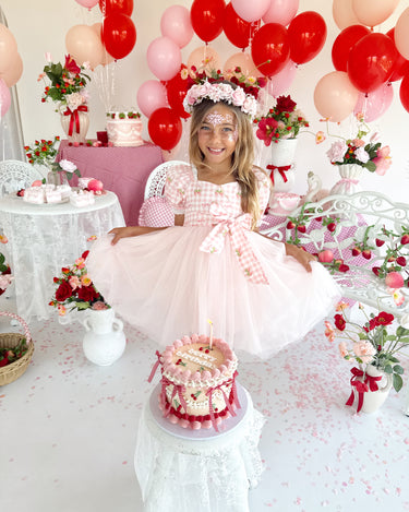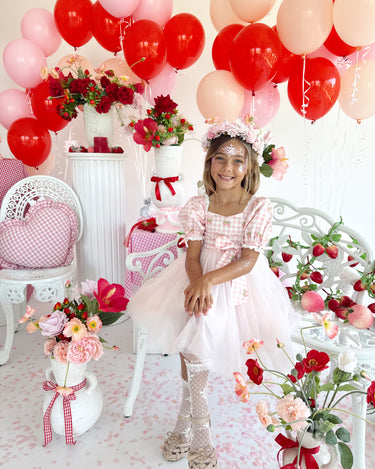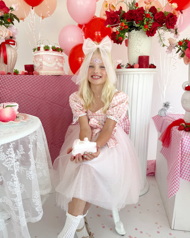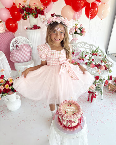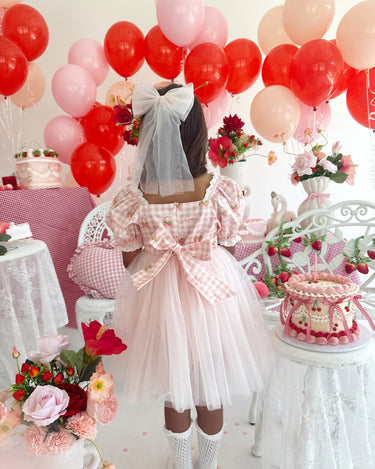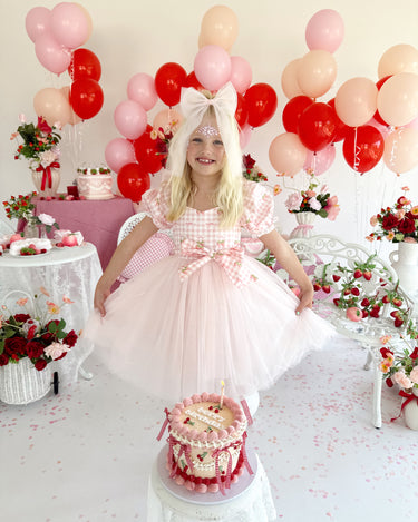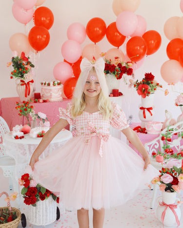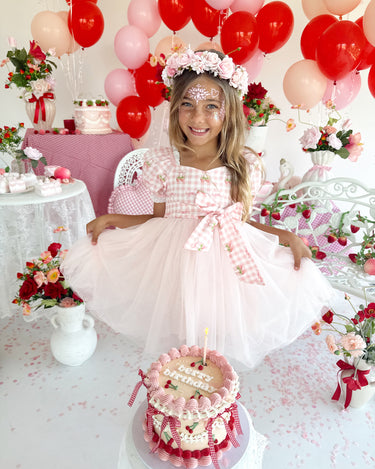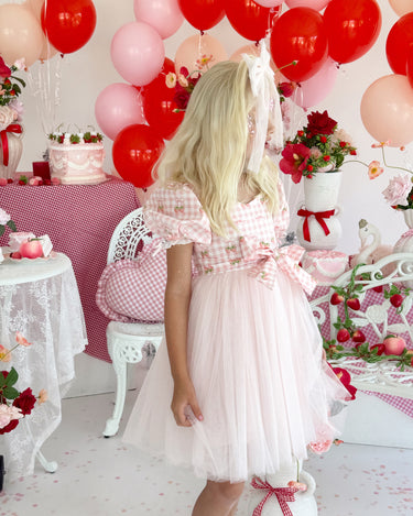 Our Sweet Strawberry Pink Girls Gingham Dress features a beautiful cotton bodice with a sweetheart neckline. It has the cutest puffed sleeves with broderie anglaise edging, a flouncy A-line silhouette skirt, and a statement waist bow that can be tied to the front or back. Perfect for birthday parties or any special occasion, your girl will look effortlessly stylish in this gorgeous piece!